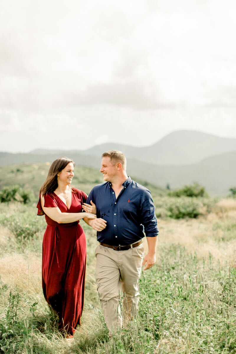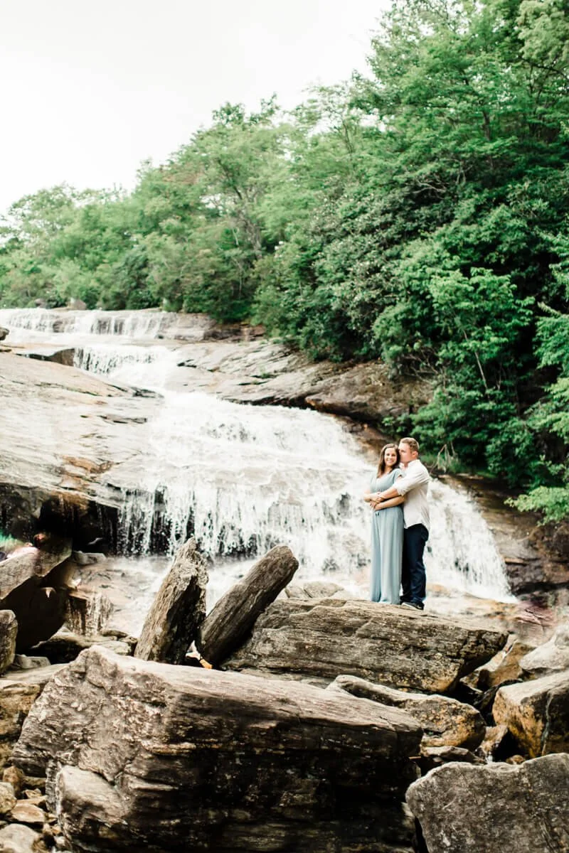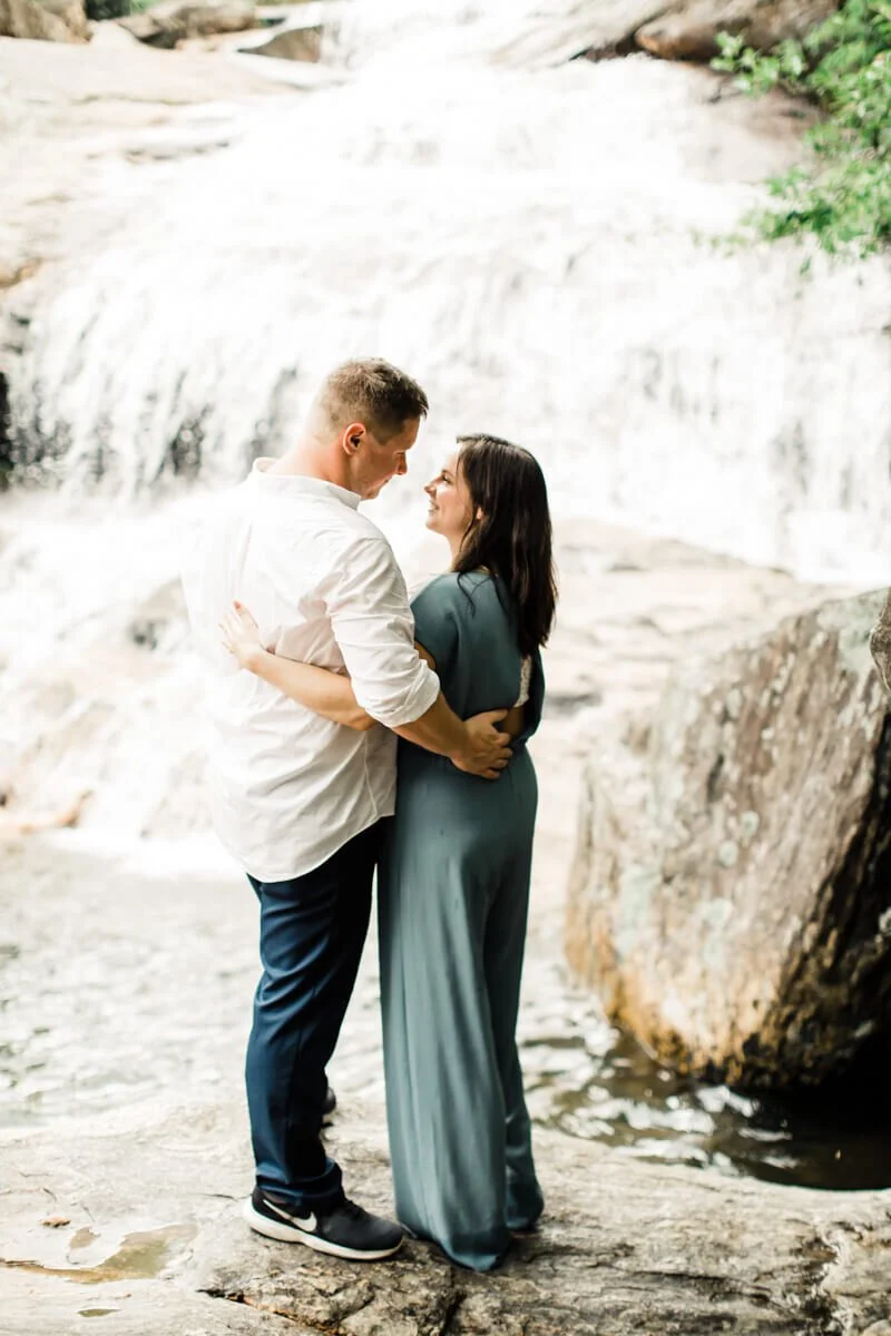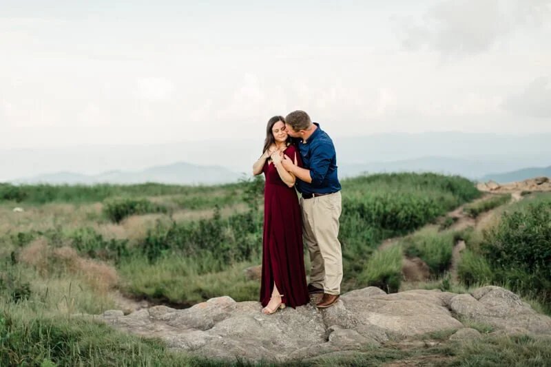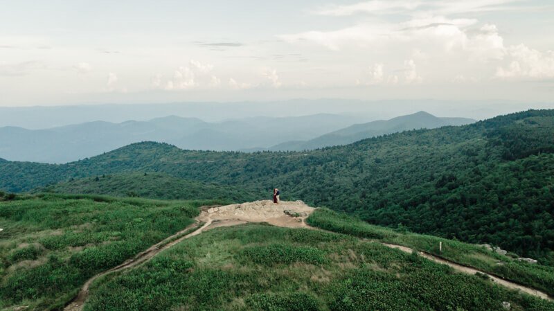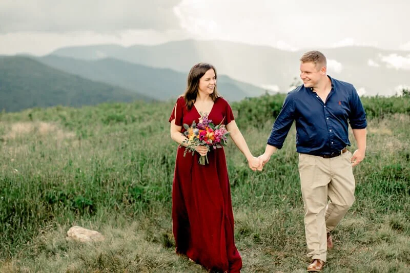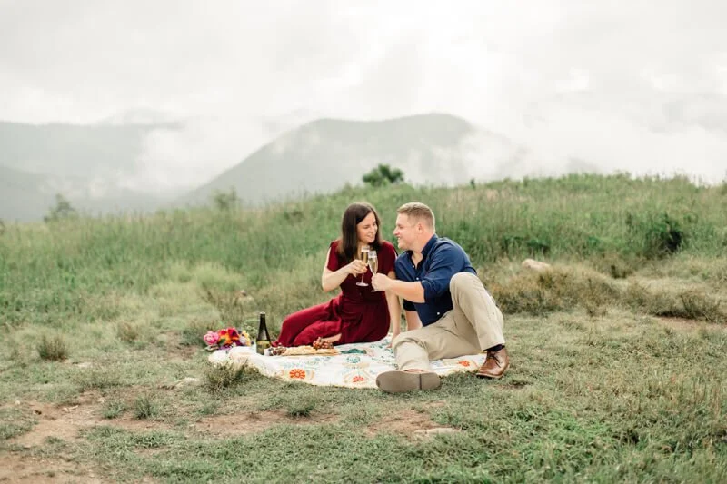 Let me set the stage. We just flew back from Sweden, unpacked and repacked in a day, went to Asheville to celebrate our best friends' wedding, then on our 7th anniversary (7/7/19) we hiked along the Blue Ridge Parkway in the Appalachian Mountains to my favorite mountain top with the coolest couple ever. It was quite the welcome back to North Carolina after an amazing year of traveling the world together for Drew's job! As much as we love the beach, we always happen to spend our anniversary in the mountains or hiking. So we had to continue the tradition and document two other love birds stories! Katelyn and Nick are SO much fun! We battled the rain and no cellphone service and finally found each other! We first hiked down to a waterfall where they bravely climbed over rocks and even got in the water, my kinda couple! Then, we hiked 30 minutes to the highest point of a trail and found a gorgeous clearing where the sun started to shine! They brought a picnic complete with bubbly, cheese, grapes, crackers, and of course finger-hands. Note to all reading, weird, plastic, tiny, finger-hands make all romantic picnics better. Please see below. Also, my drone Scottie made an appearance to catch some stunning rolling hill views that give the Blue Ridge and Smokey Mountains their name. I am so excited to share this quirky, vibrant, full of joy, energy, and love day!