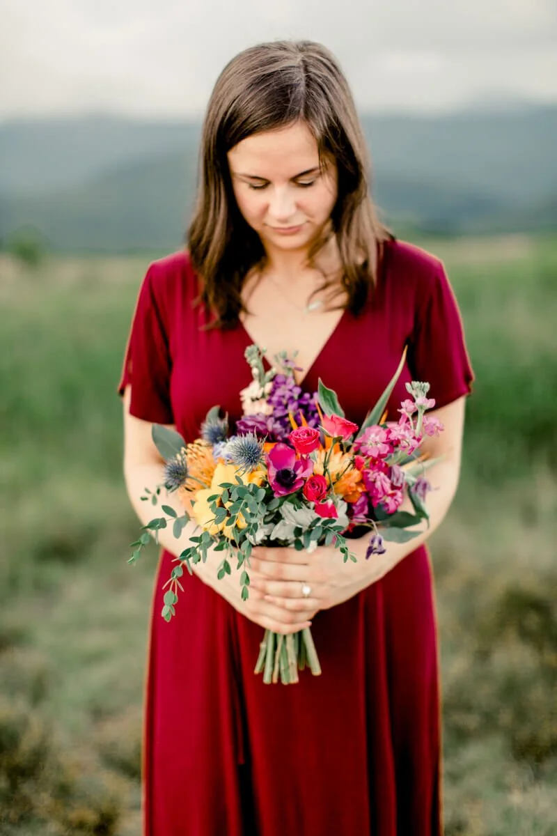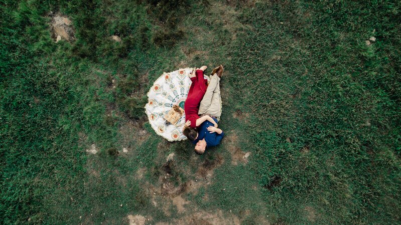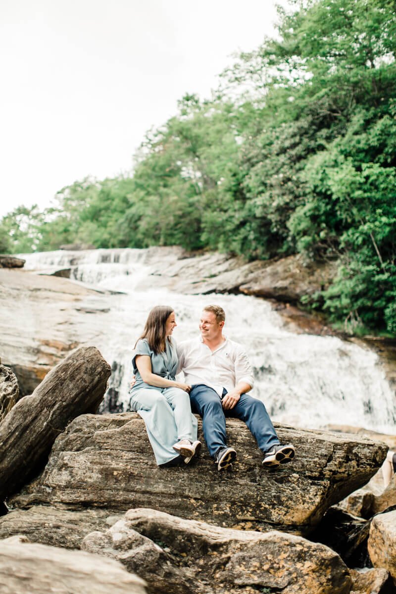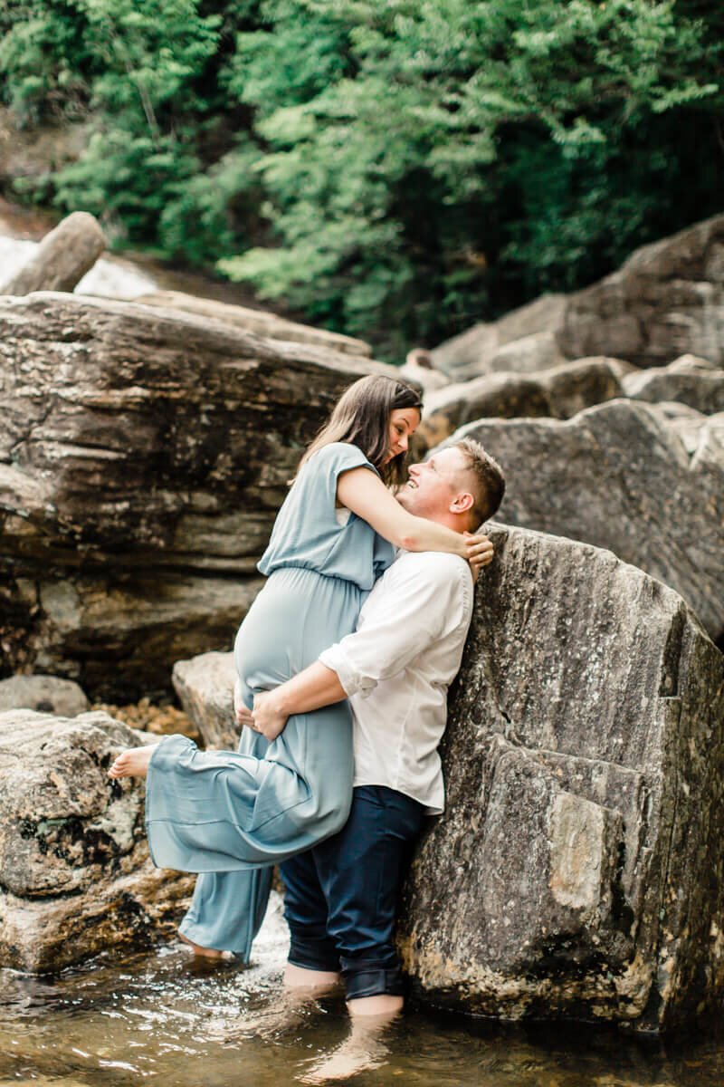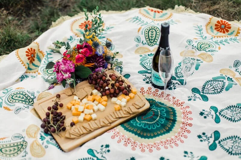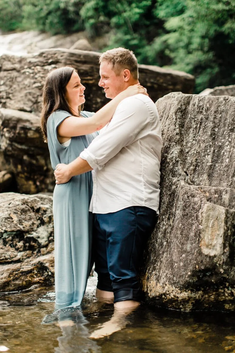 Let me set the stage. We just flew back from Sweden, unpacked and repacked in a day, went to Asheville to celebrate our best friends' wedding, then on our 7th anniversary (7/7/19) we hiked along the Blue Ridge Parkway in the Appalachian Mountains to my favorite mountain top with the coolest couple ever. It was quite the welcome back to North Carolina after an amazing year of traveling the world together for Drew's job! As much as we love the beach, we always happen to spend our anniversary in the mountains or hiking. So we had to continue the tradition and document two other love birds stories! Katelyn and Nick are SO much fun! We battled the rain and no cellphone service and finally found each other! We first hiked down to a waterfall where they bravely climbed over rocks and even got in the water, my kinda couple! Then, we hiked 30 minutes to the highest point of a trail and found a gorgeous clearing where the sun started to shine! They brought a picnic complete with bubbly, cheese, grapes, crackers, and of course finger-hands. Note to all reading, weird, plastic, tiny, finger-hands make all romantic picnics better. Please see below. Also, my drone Scottie made an appearance to catch some stunning rolling hill views that give the Blue Ridge and Smokey Mountains their name. I am so excited to share this quirky, vibrant, full of joy, energy, and love day!