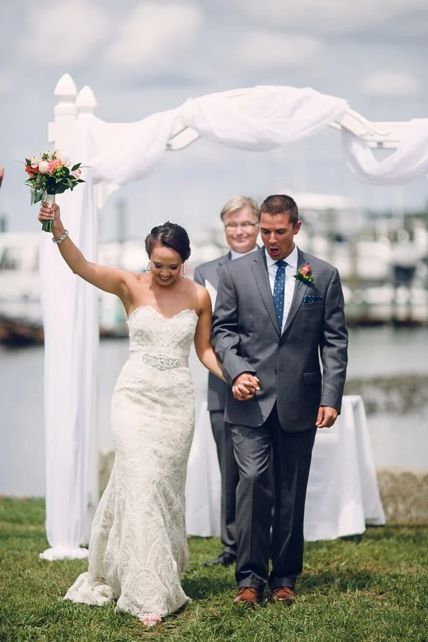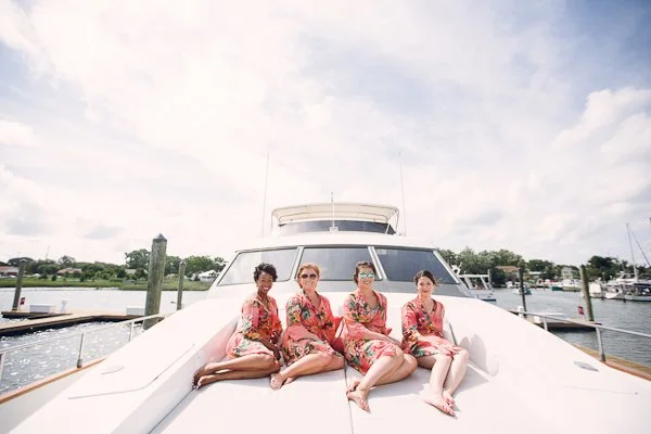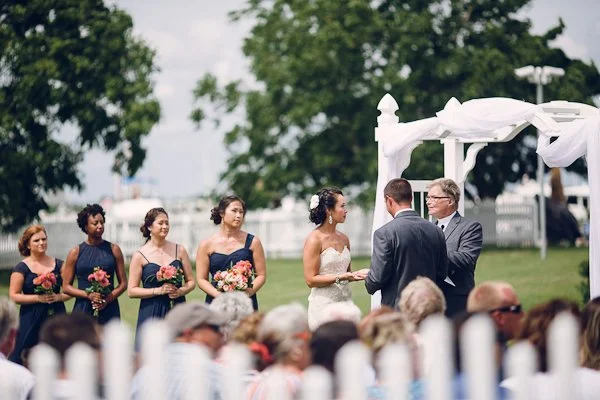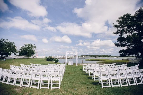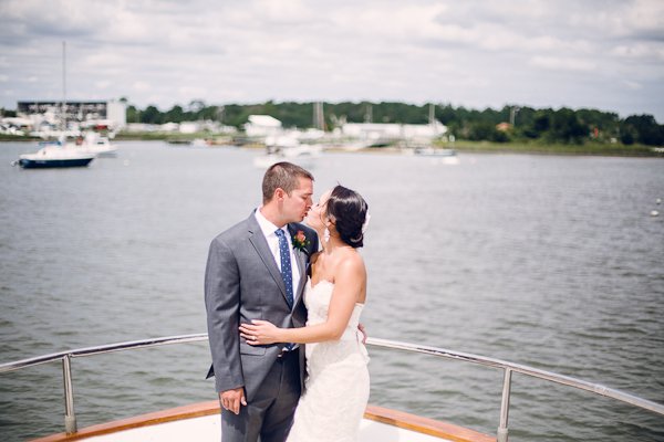 Kyle and Ashley's love of life on the water was perfectly embodied for their Beaufort, North Carolina yacht wedding. The site for the wedding was essentially selected long ago, when Kyle's parents were sailing a boat they had purchased from Florida to Virginia. After a stopover in Beaufort, they immediately fell in love with the quaint, Nicholas Sparks-Inspiring town. They purchased the land that would ultimately become Kyle and Ashley's ceremony site. Kyle and Ashley have continued this love of boating and incorporated a modern, nautical theme for their day. Pairing classic blue and white striped linens with bold, fresh and trendy floral, the theme was pulled off without being passé. Ashley writes: 'We met while attending Virginia Commonwealth University in Richmond, Va. We were both in the School of Business majoring in Business Management. We met through a mutual friend. We went out on a group date and have been inseparable ever since. We are very different in many ways but it’s almost like our differences compliment each other like yin and yang."