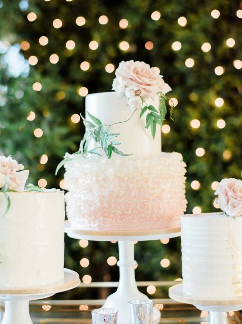 Can you believe these plush roses are pure sugar? Accompanied by dainty sprigs of greenery, a collection of ombré ruffled cakes are transformed with the help of lifelike roses.