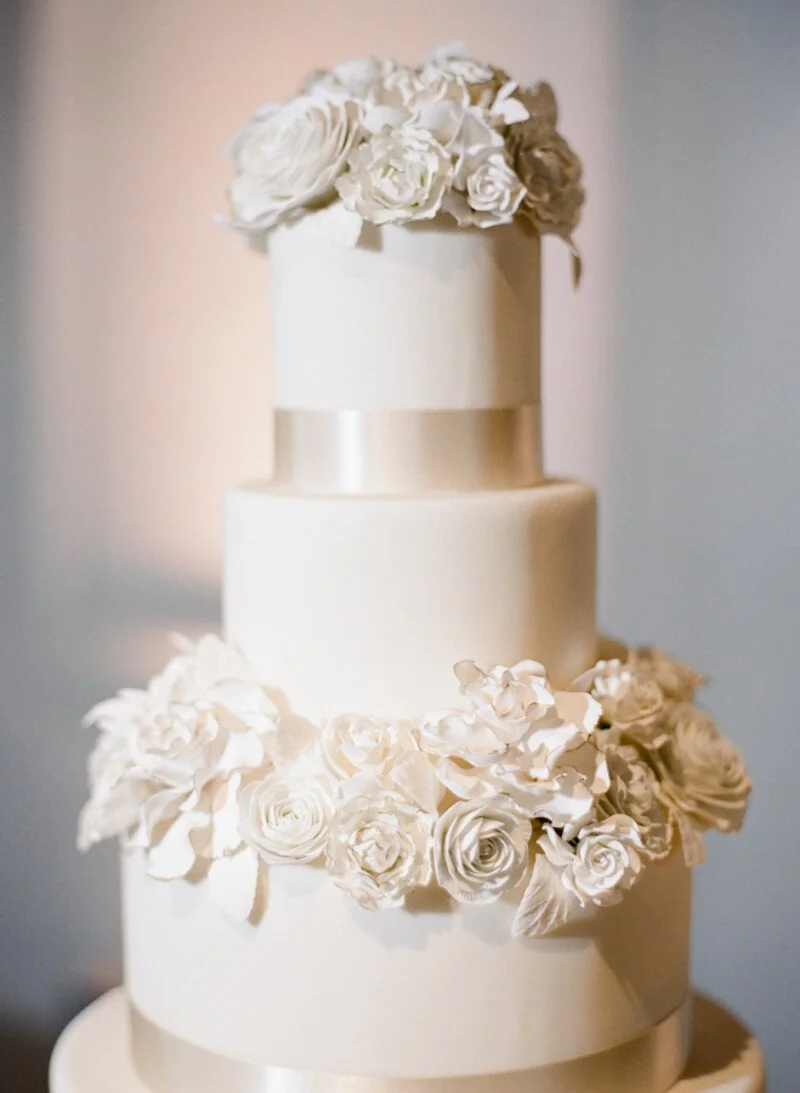 The benefit of sugar flowers is, no matter the season and type of flower you desire, you can create them in any color, shape and size. This traditional white wedding cake is adorned with immaculate white flowers in utter sophistication.