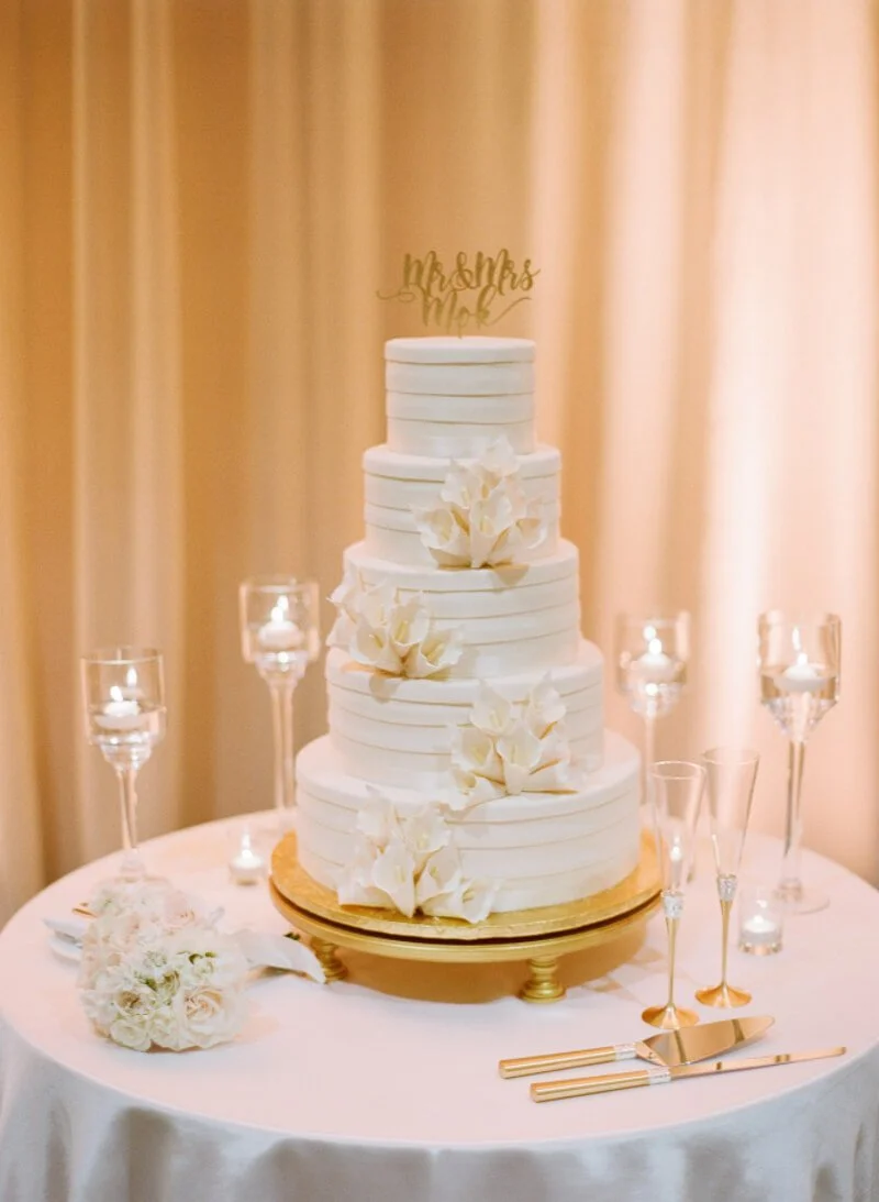 Lilies have a fresh, modern appeal. And in sugar form, they make an idyllic embellishment to this crisp, banded five-tier cake.