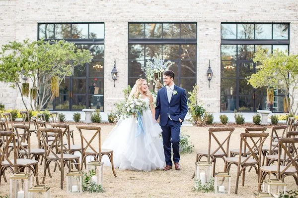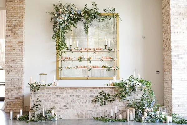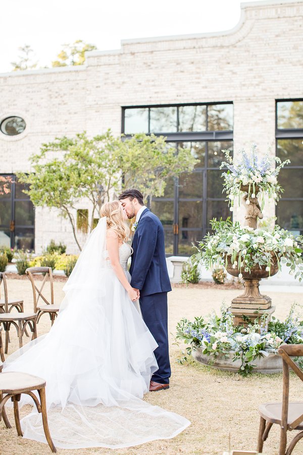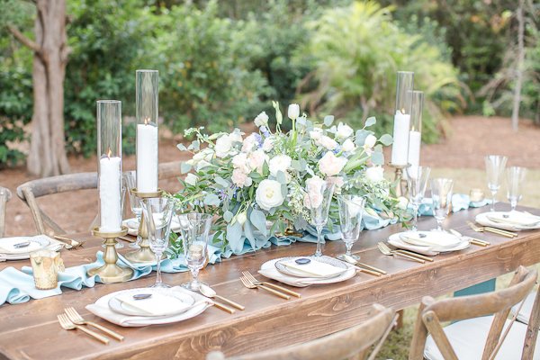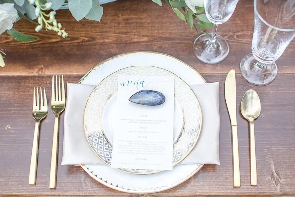 This Blue and Gold Spring Inspiration Shoot took place at the beautiful Wrightsville Manor off the coast of the Carolinas. Wilmington, North Carolina to be exact. The inspiration for this shoot draws from the luscious spring colors and florals, while incorporating the natural and organic elements of the coast. The day unfolds with the announcing of their beautiful wedding, and capturing all the exquisite details leading up to the last kiss. Each detail was executed with precision in order to help tell the story of their memorable journey together. We brought a multitude of components to blend our vision with the whimsical elements of the venue; such as the exposed whitewashed brick, large oak trees, and the breathtaking fireplace, and matched them with the natural and organic components of greenery, southern florals, and muscle shells as place cards.