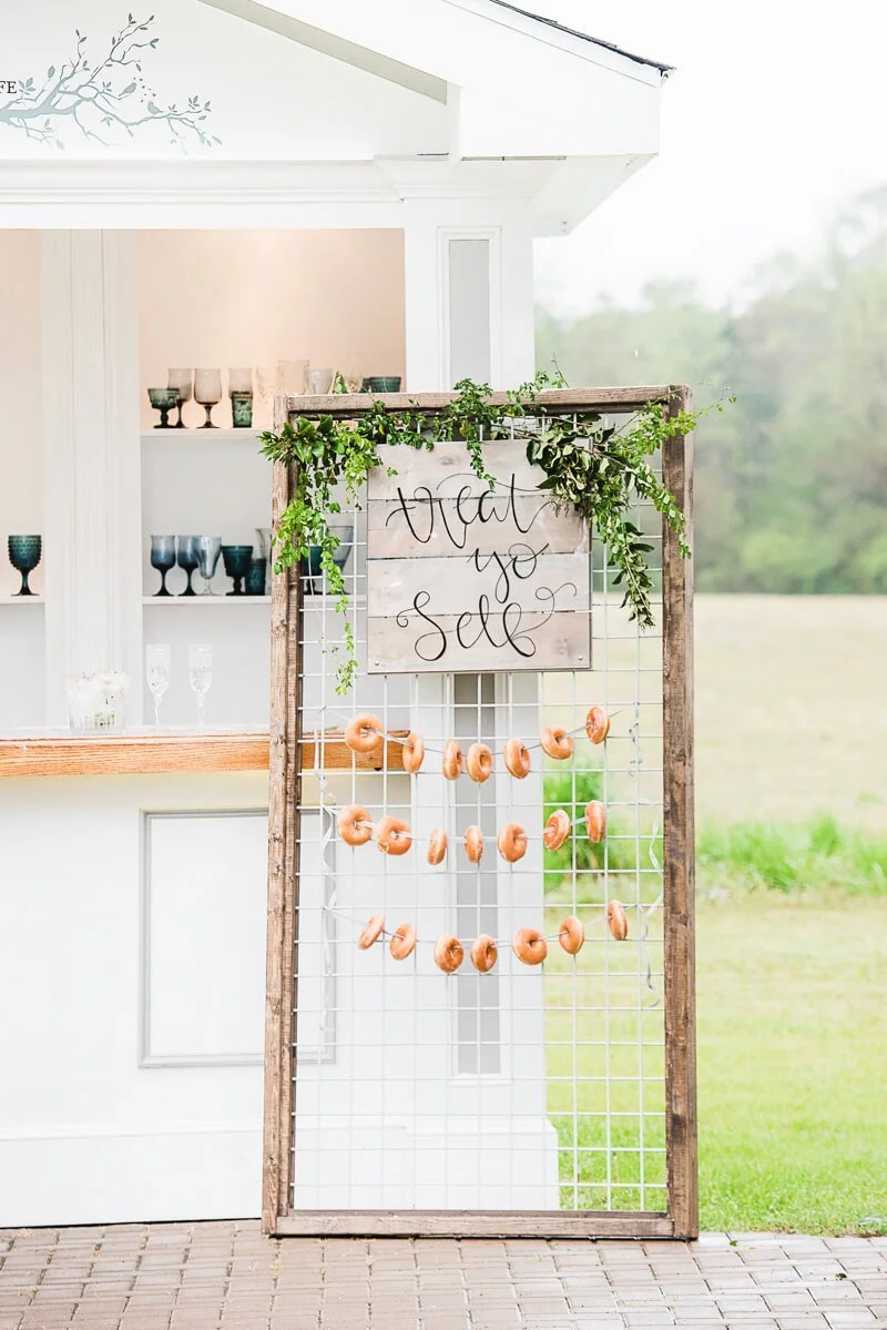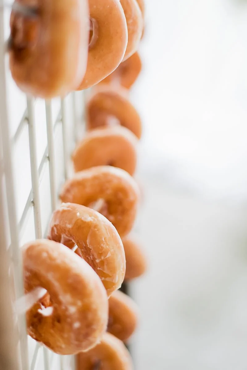 Modern aspects like a donuts-bar and a sign found by the counter at bar which toned in with contrasts of the colored glasses in the background.