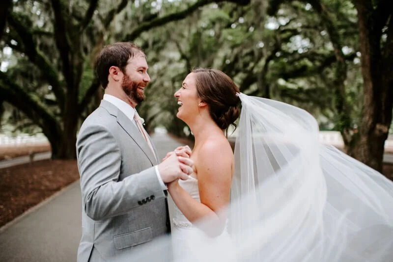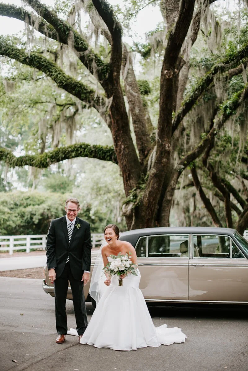 Jess and Jeffrey spoke their vows under the live oaks of Belfair's Avenue of the Oaks. Jess arrived at the ceremony with her father in a vintage 1970 Rolls Royce Silver Shadow. She met Jeffrey at the Circle Arch decorated with greenery, white roses and hydrangeas, and of course, Spanish Moss.
