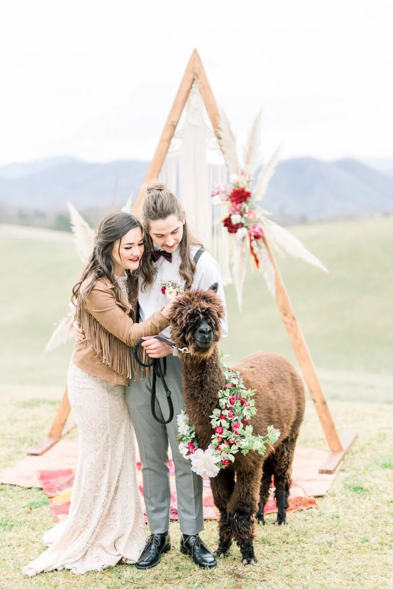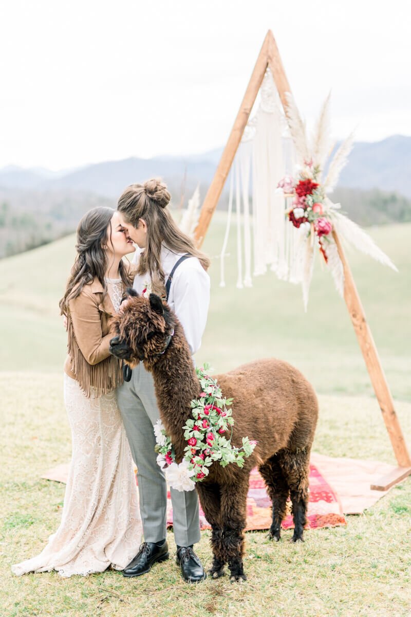 Bakery: Amy's Bakery//Linens and Coverings: Tri-County Rentals//Calligrapher: Pretty Written Things//Jewelry: Kate Furman Jewelry//Floral Designer: Your Special Day//Makeup Artist: Blush Asheville//Tuxedo and Mens Attire: Mitchells Tuxedos//Dress Designer: Angela Kim Couture//Personal Stylist:Ritzy&Rey//Other: Last Penny Farm Alpacas//Reception Venue: The Ridge//Photographer: Corey Johnson Studios