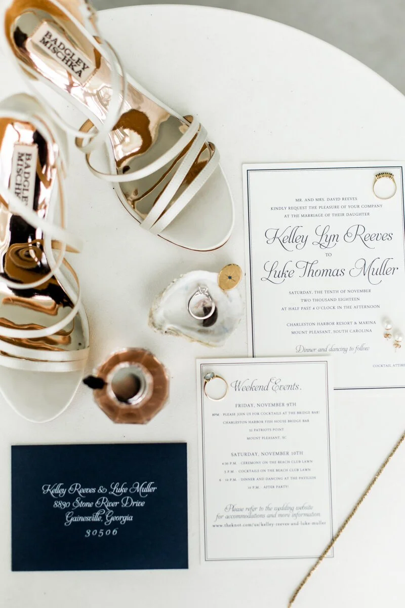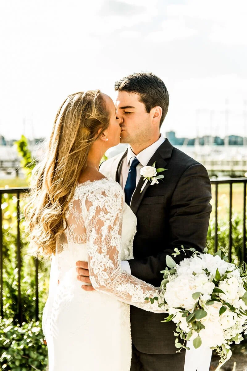 Kelley and Luke knew they wanted to travel to Charleston for a coastal wedding, but they didn't want to be on a beach. Kelley found a stunning ceremony site at the Charleston Harbor Marina and fell in love with the view. She knew she wanted to keep everything very minimalistic and simple, so as not to distract from the venue. Her flowers were all white, and the greenery complimented the sea-glass accents perfectly. The sunset behind them during their ceremony was the cherry on top of their beautiful day.