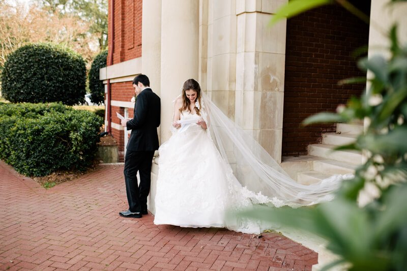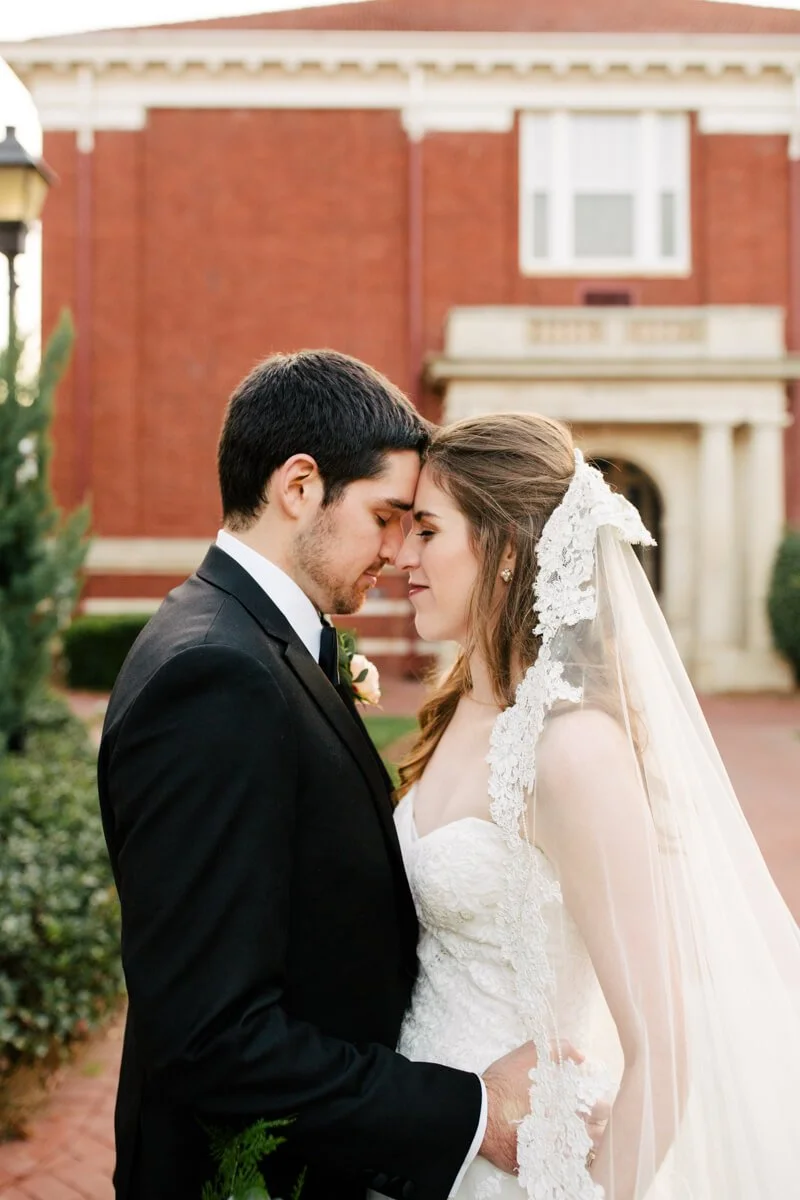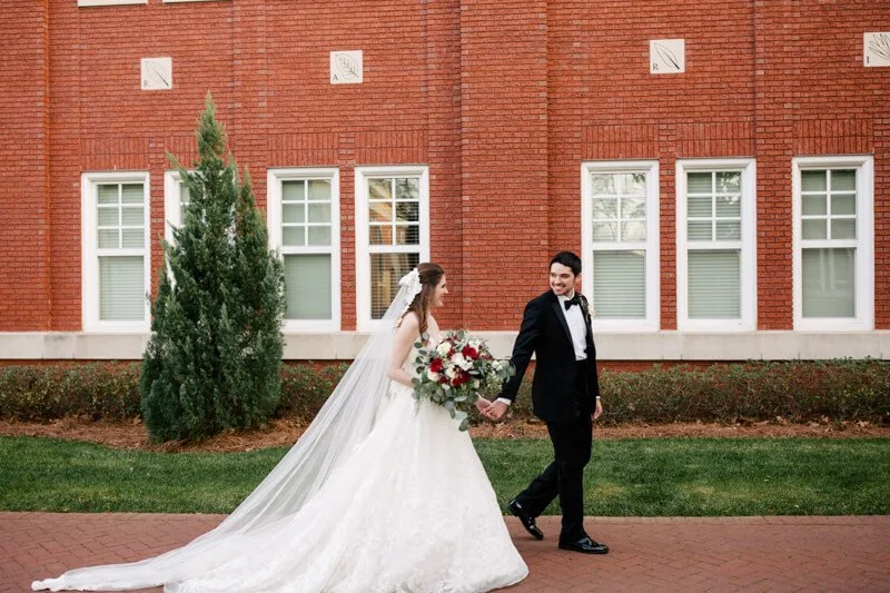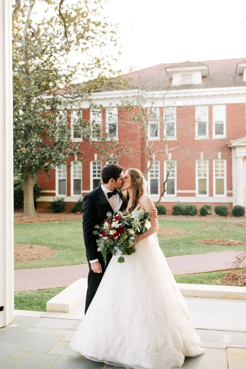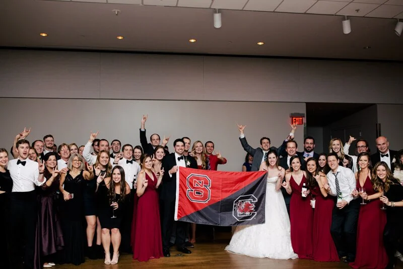 In these images you will find smiles that are sometimes too big they make eyes crinkle, laughs that make you throw your head back, tender moments with family, and joy. As for a little bit more about us, my husband, Andrew, and I are both Charlotte natives and love Southern hospitality and the Carolinas. We incorporated both into our wedding day (banana pudding, shrimp and grits, Cheerwine, Krispy Kreme and a picture with our college flags), and had a cherished celebration with family and friends. After a blind date in Charlotte 4 years ago, while he was at NC State and I was at USC, we dated long distance for 3 years, got engaged and then were married on December 30, 2017. Our wedding was at the Belk Chapel at Queens University in Charlotte, NC, almost 29 years after my parents were married there in December of 1988. We then had our 'classic winter elegance' reception at the Mint Museum Uptown with lots of dreamy greenery, candles and blush and gold accents. The most special thing, however, were the moments and details shared with family and unique to us. Tears were shed when my 94-year-old grandma who passed away in February, arrived last minute, as well as during shag dances, thriller dances with old coaches, heirloom veils, and lots of Krispy Kreme - because everyone needs their own KK - my former initials.