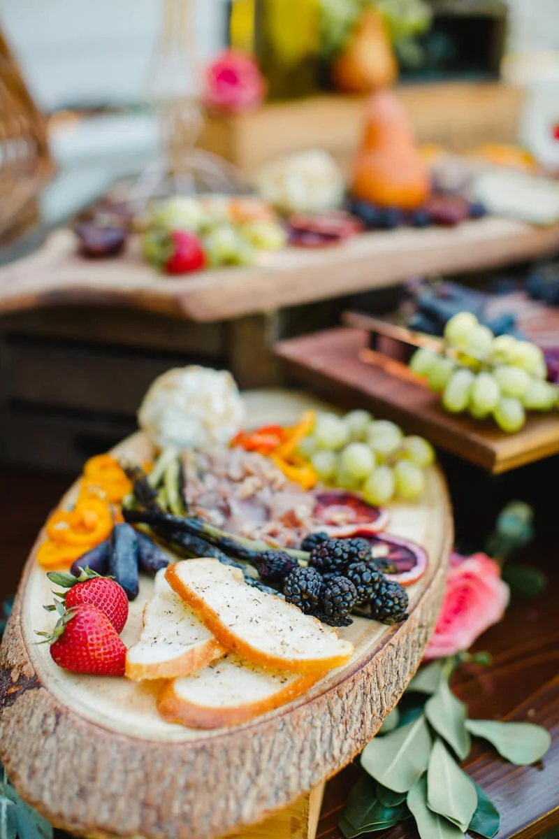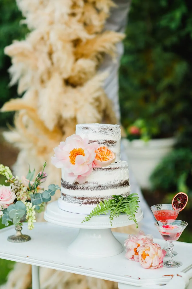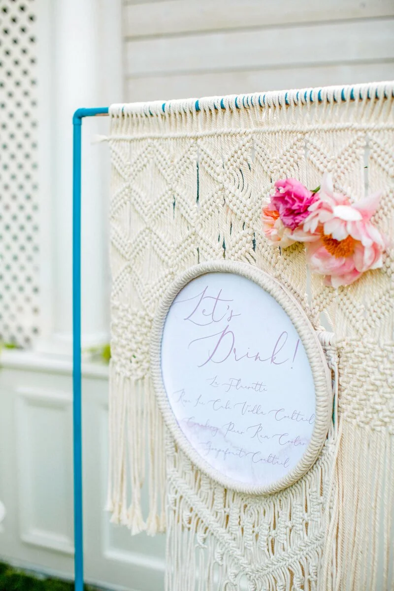 We paired an expertly styled cheese and charcuterie table from Roots Catering with a colorful cocktail display and macrame drinks sign. A nearly naked cake from Wow Factor Cakes adorned with colorful peonies was the sweet finale.