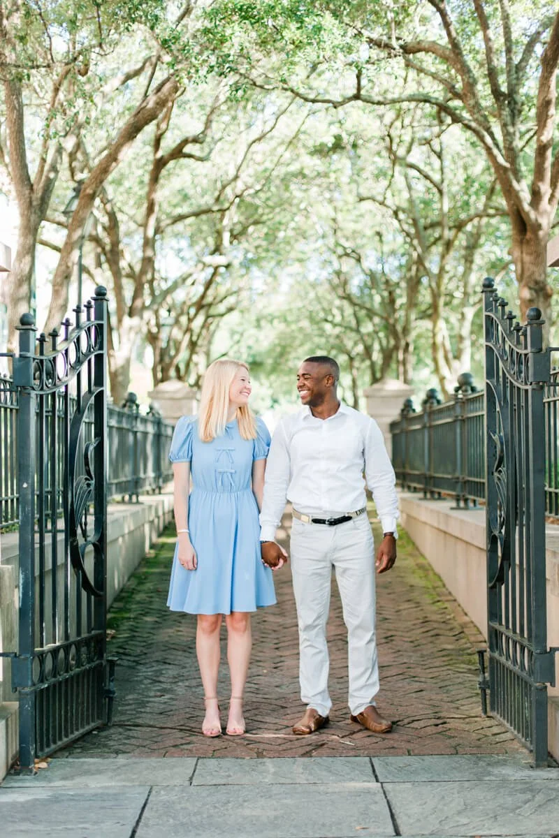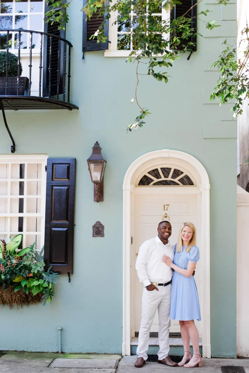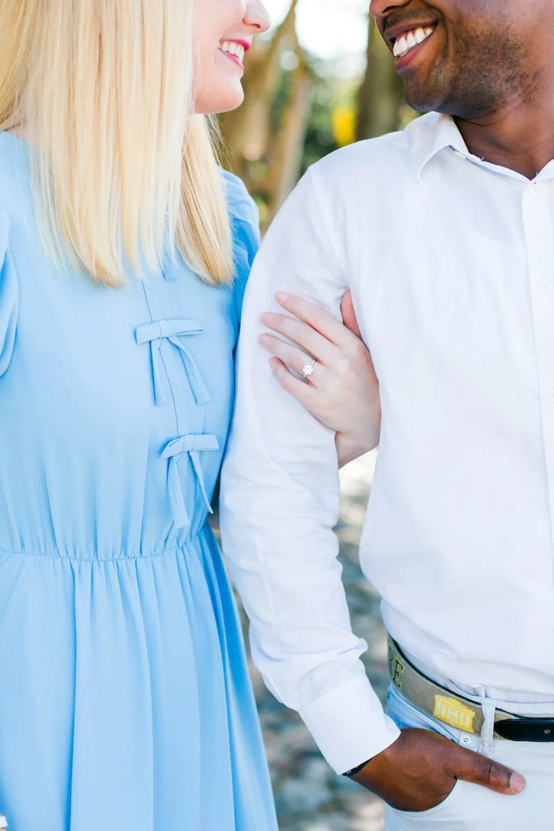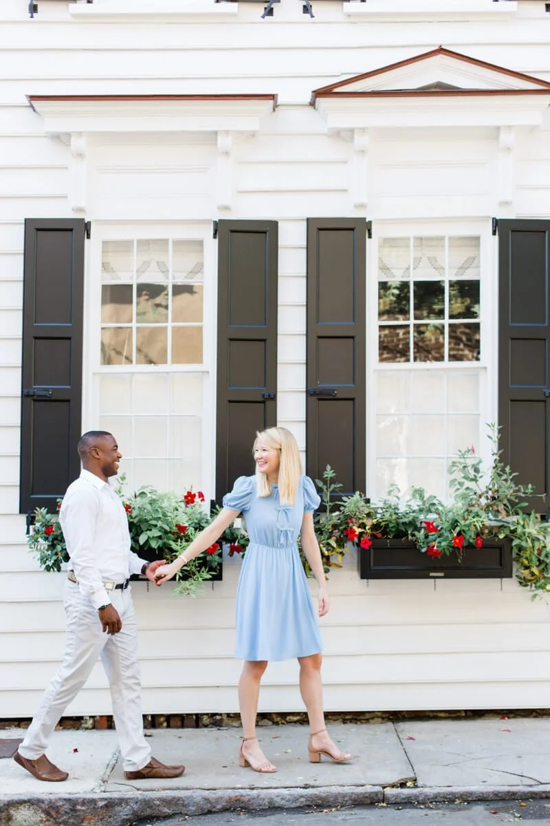 In August I received an email from CJ about setting up a session! Emily and CJ were coming to Charleston on vacation and he wanted to surprise her with an engagement session in the historic downtown streets! I was so excited that I was available to photograph them. I jokingly asked him if he was going to let her know beforehand so she could pack an outfit for this haha (which he did!). Emily wore a Gal Meets Glam dress for their Charleston engagement - how perfect right?! They were the sweetest to work with. We walked along Rainbow Row, Tradd Street and Waterfront Park without a cloud in the sky.