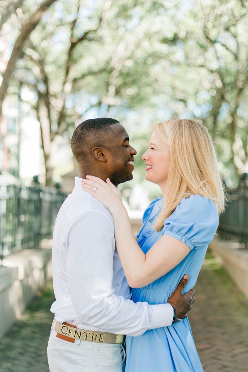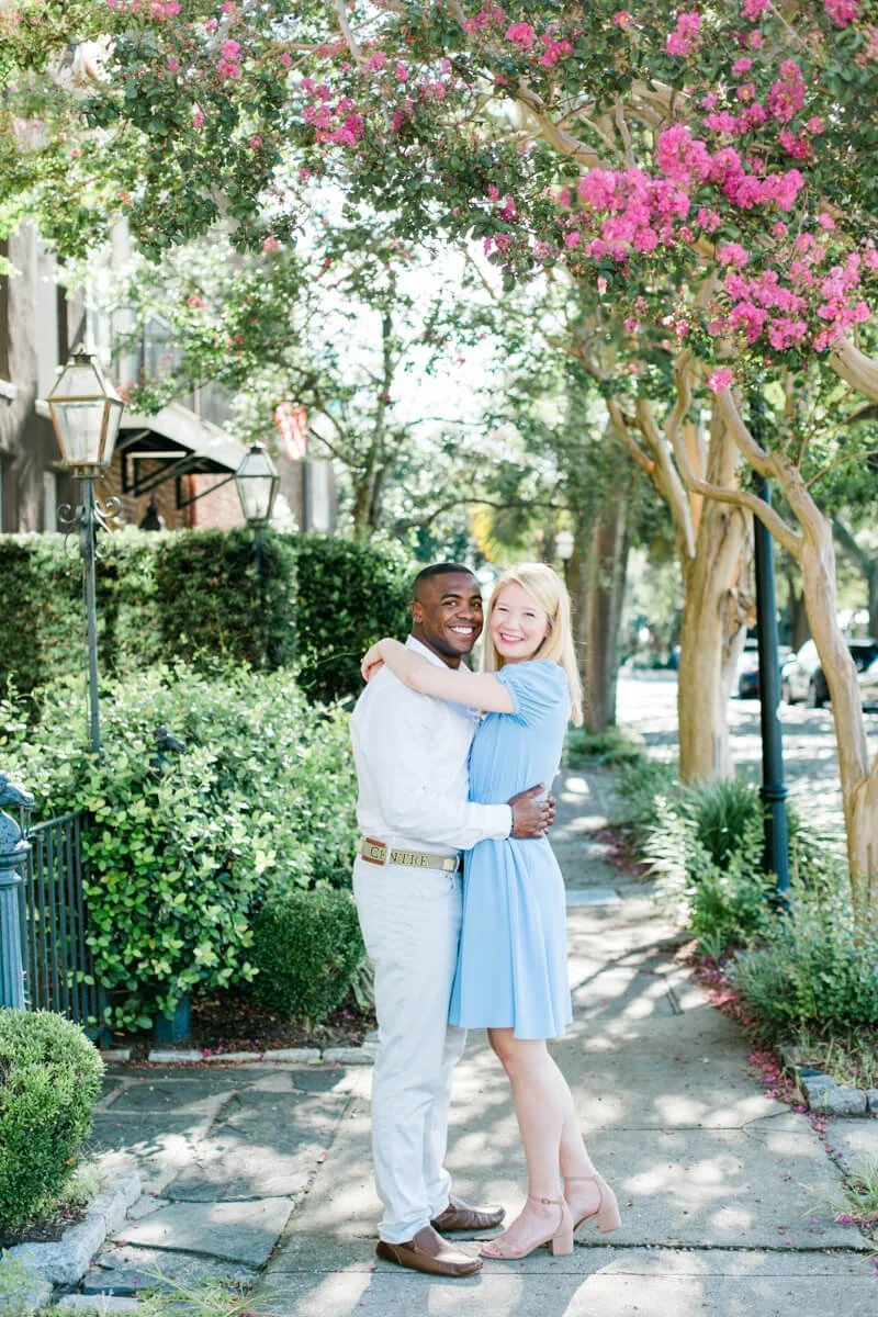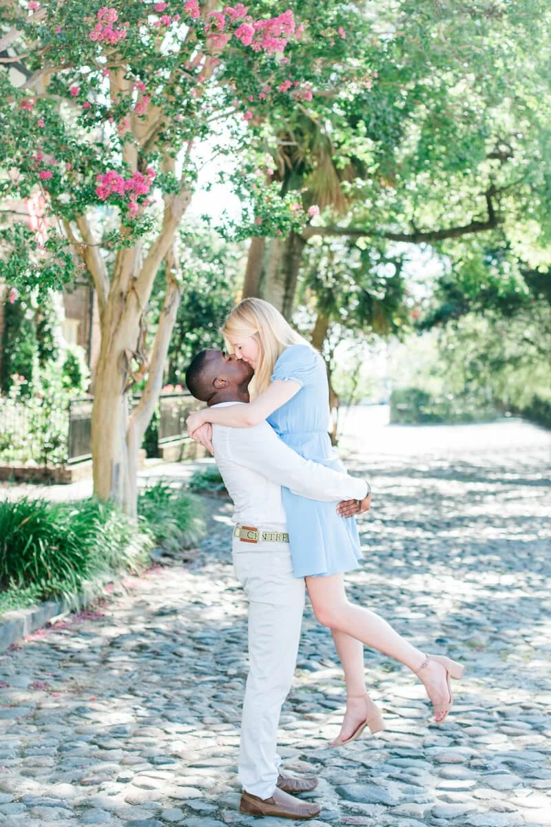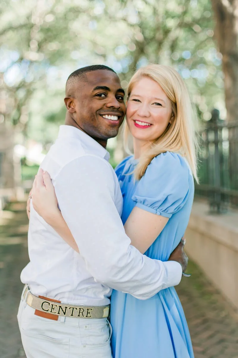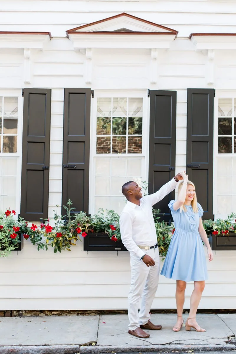 In August I received an email from CJ about setting up a session! Emily and CJ were coming to Charleston on vacation and he wanted to surprise her with an engagement session in the historic downtown streets! I was so excited that I was available to photograph them. I jokingly asked him if he was going to let her know beforehand so she could pack an outfit for this haha (which he did!). Emily wore a Gal Meets Glam dress for their Charleston engagement - how perfect right?! They were the sweetest to work with. We walked along Rainbow Row, Tradd Street and Waterfront Park without a cloud in the sky.