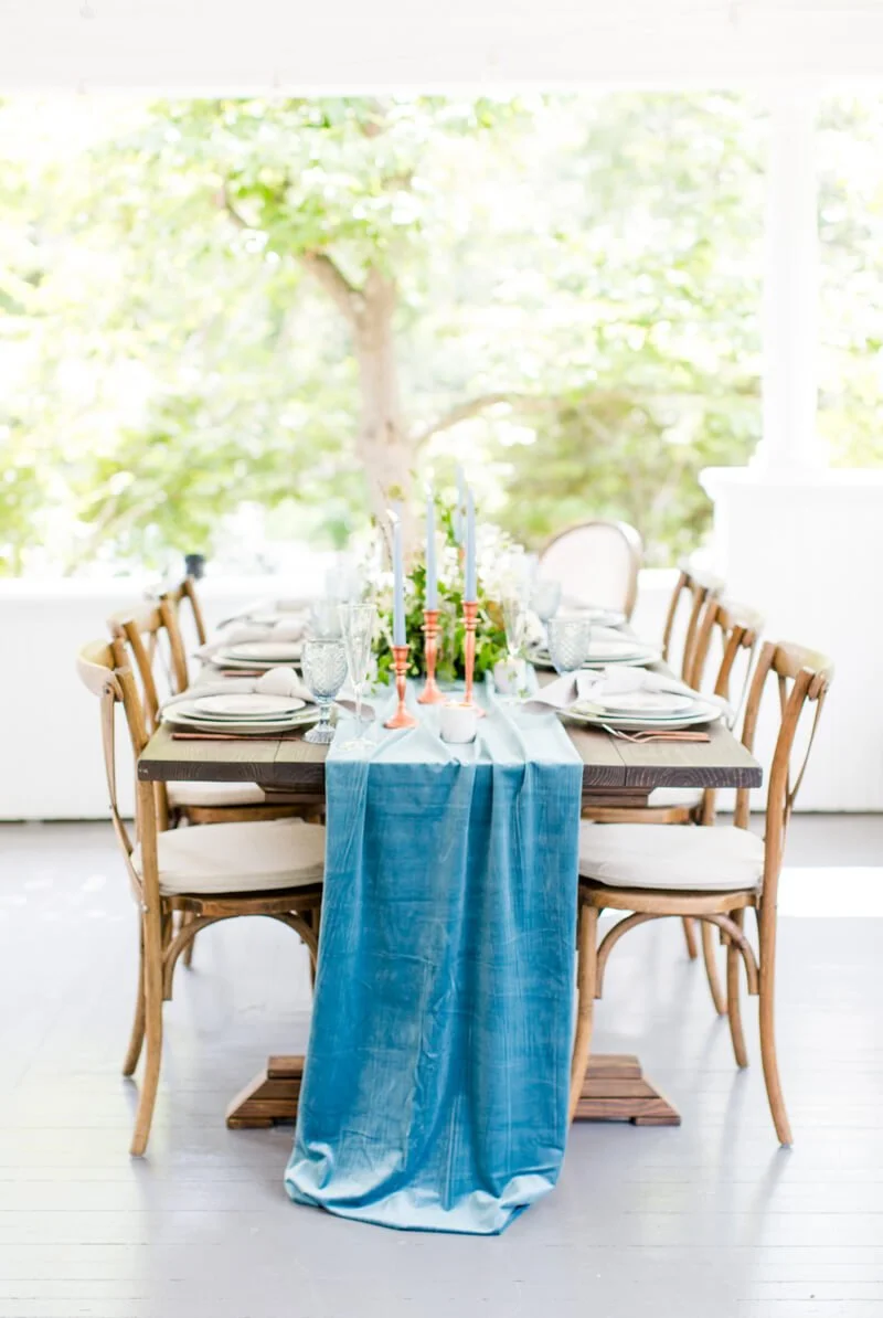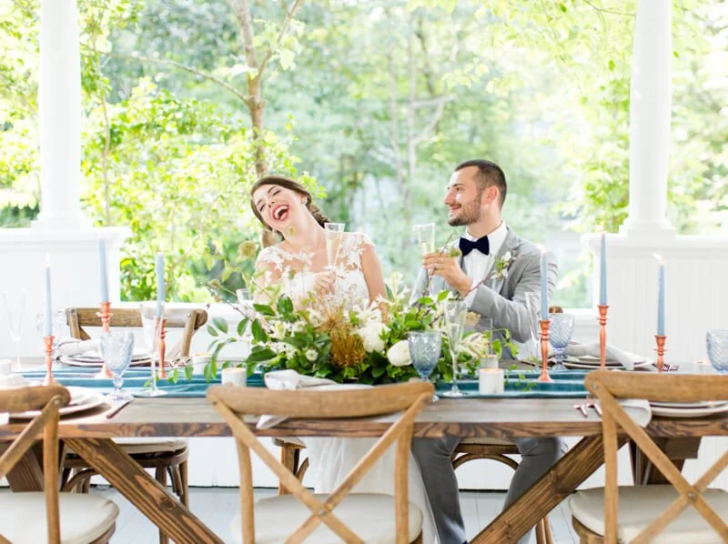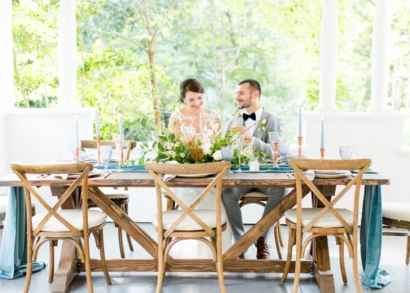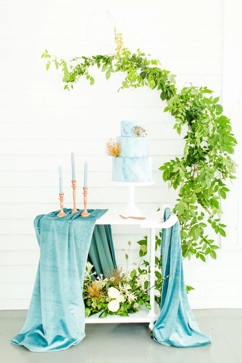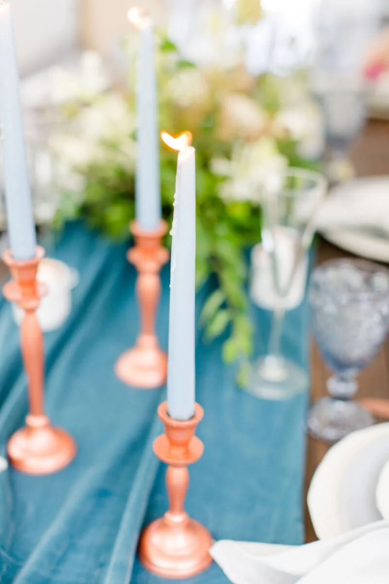 From the photographer: This shoot took place at Ritchie Hill, a gorgeous historic venue in Concord, NC. This venues natural light and airy essence gave us the perfect canvas to paint our vision! We layered grays and shades of blue velvet with mixed copper & marble accents tied in with the textured floral pieces to give us a romantic, moody & modern feel. Our couple Sydney & James who are a happily engaged couple in real life. The “groom to be” had just returned home after serving five years in the military, and their longing and excitement to begin planning their lives together was a true inspiration for the shoot!