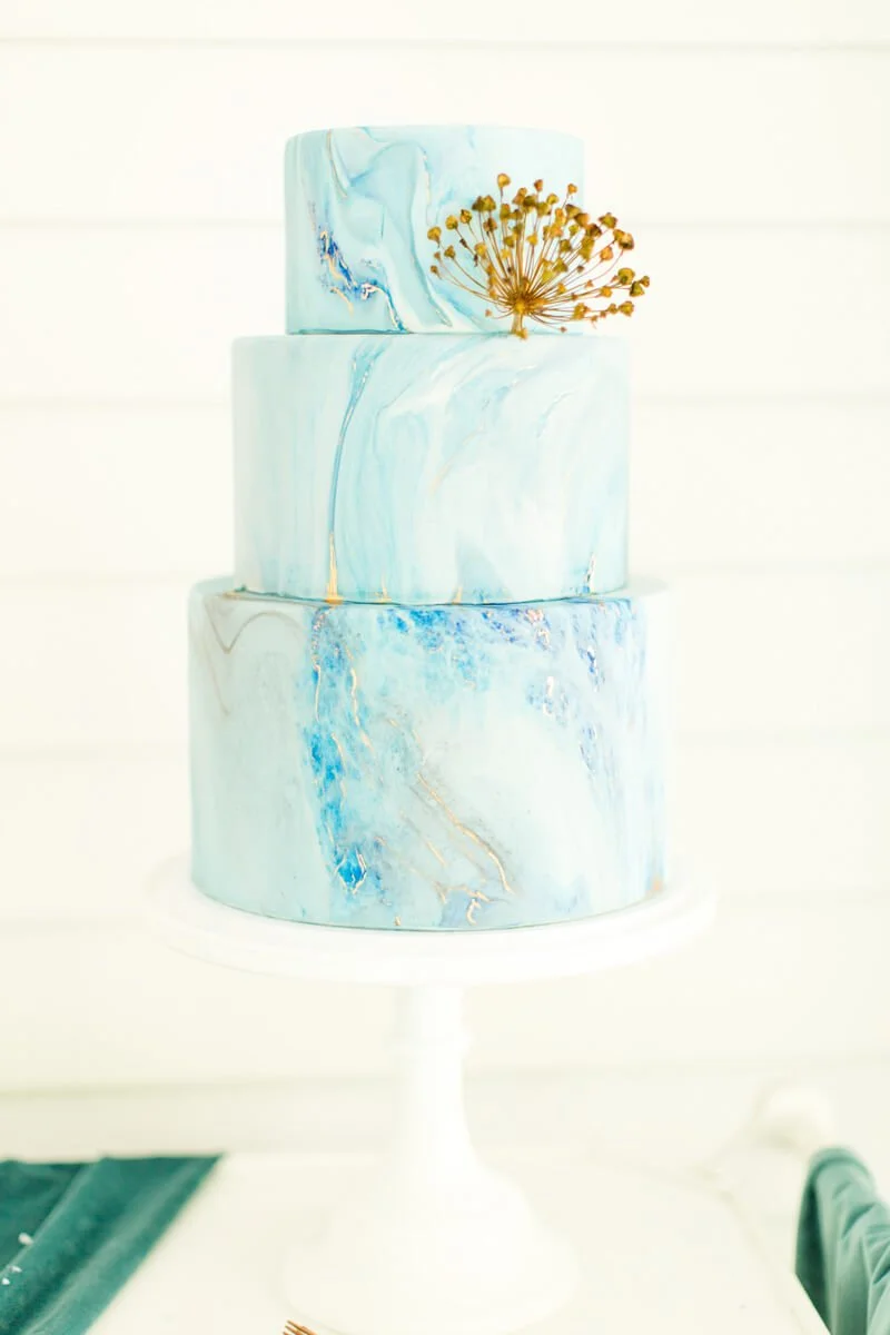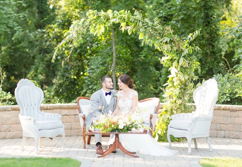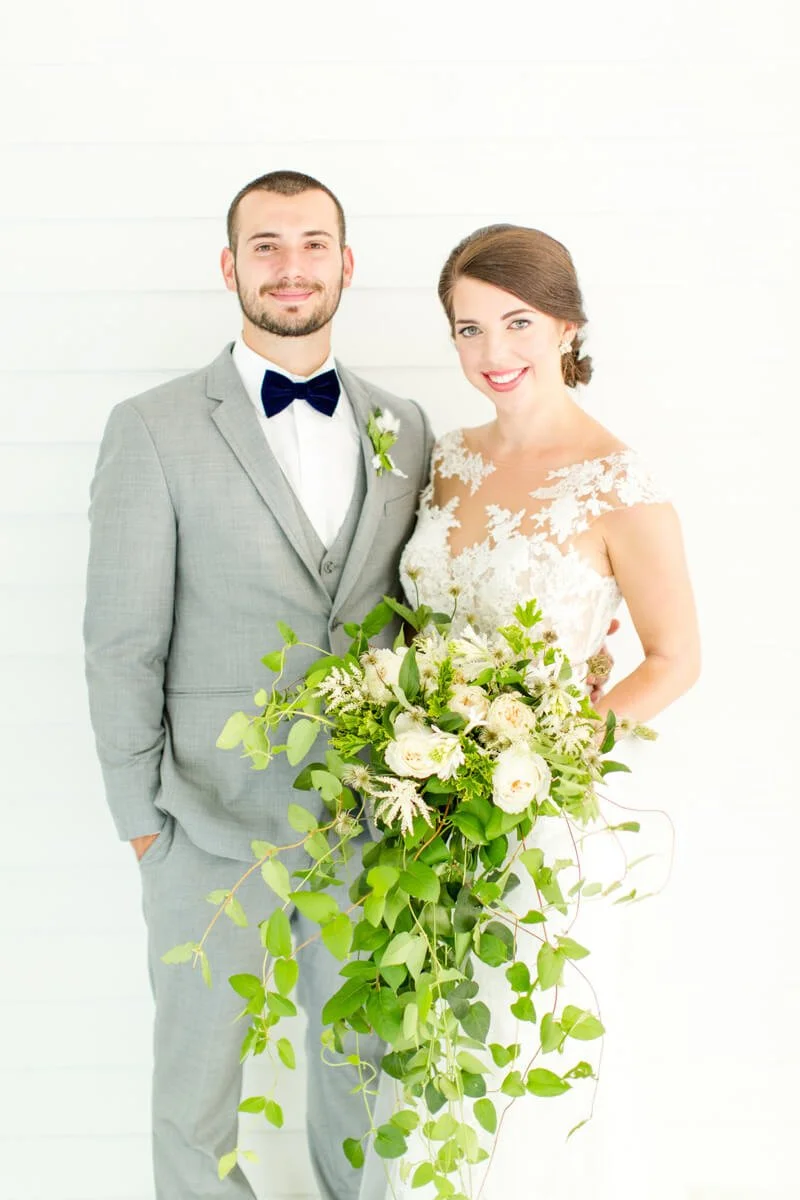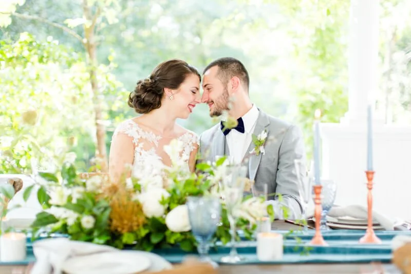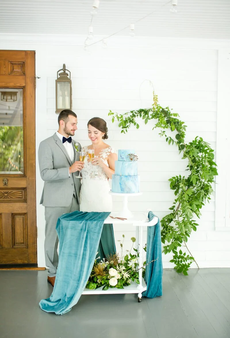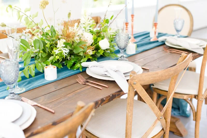 From the photographer: This shoot took place at Ritchie Hill, a gorgeous historic venue in Concord, NC. This venues natural light and airy essence gave us the perfect canvas to paint our vision! We layered grays and shades of blue velvet with mixed copper & marble accents tied in with the textured floral pieces to give us a romantic, moody & modern feel. Our couple Sydney & James who are a happily engaged couple in real life. The “groom to be” had just returned home after serving five years in the military, and their longing and excitement to begin planning their lives together was a true inspiration for the shoot!