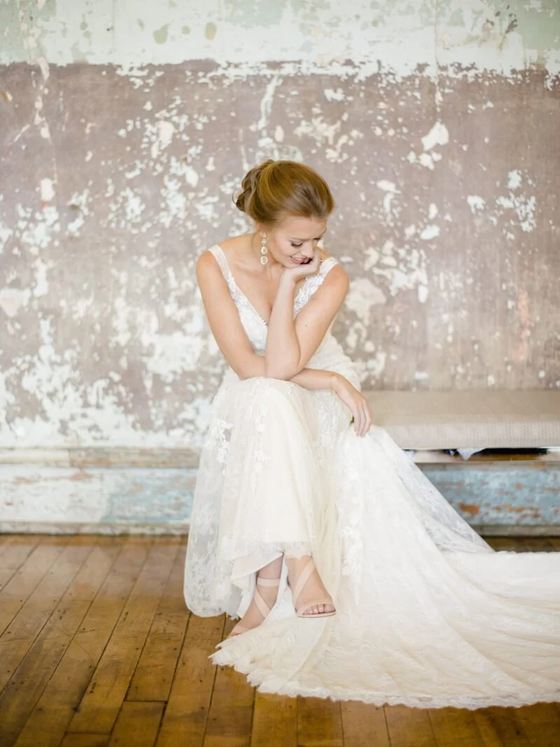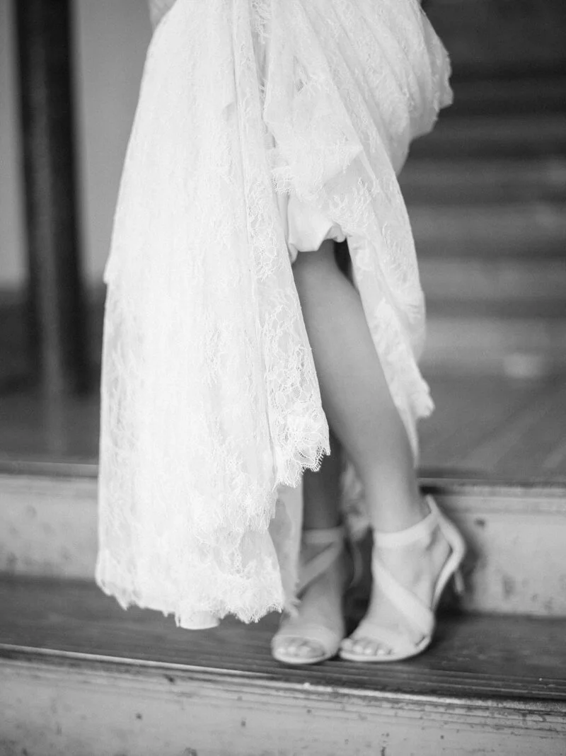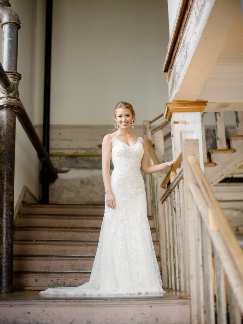 A: Our lifestyle in Brisbane, Australia, is urban, industrial, and tropical, and the style and colors of 701 Whaley fit our vision perfectly. As a couple, we are pretty informal, but we love to dress up for formal occasions. To blend these tastes, I went semi-tailored for my wedding dress with chantilly lace over a satin ivory dress after a 2-hour shopping trip to BHLDN in DC. My groom selected navy blue suits with maroon and white striped pocket squares, ties for the groomsmen and a bow tie for himself. A nod to red, white, and blue for both the USA and Australian colors.