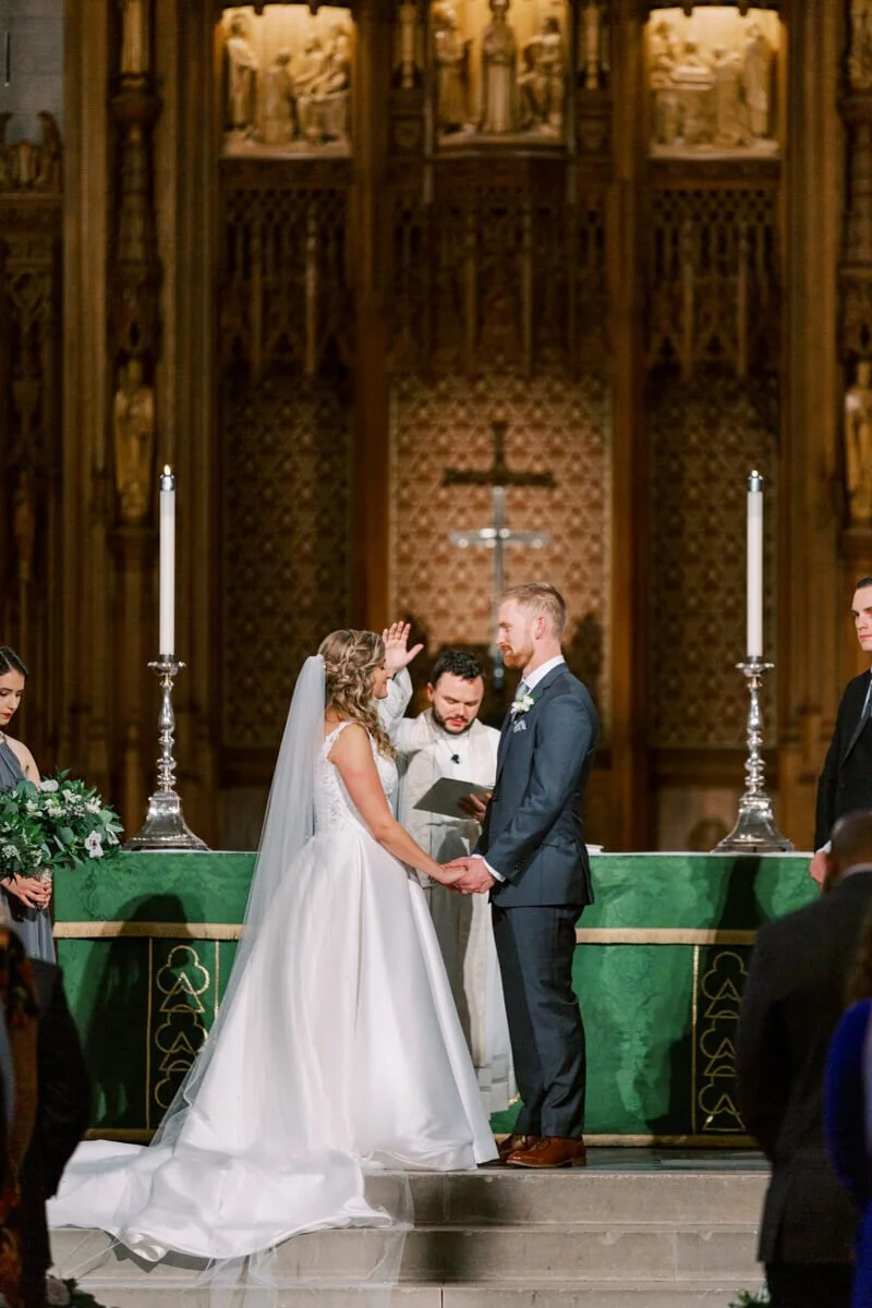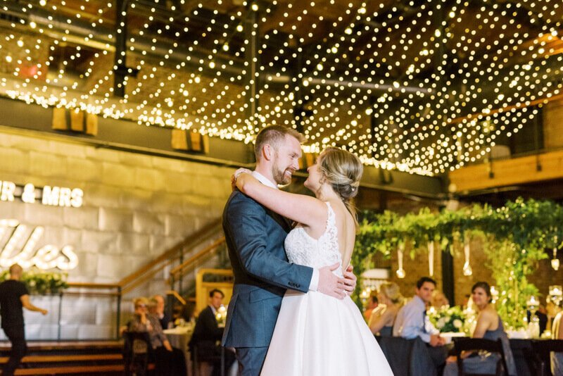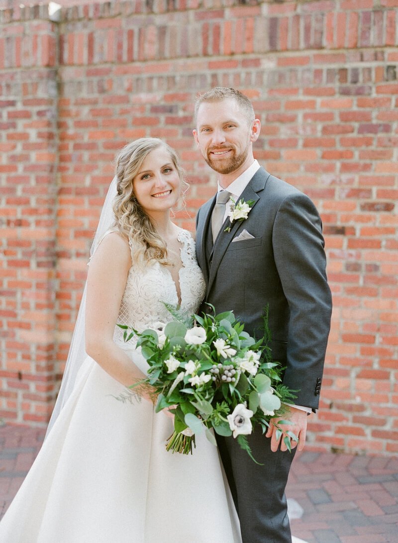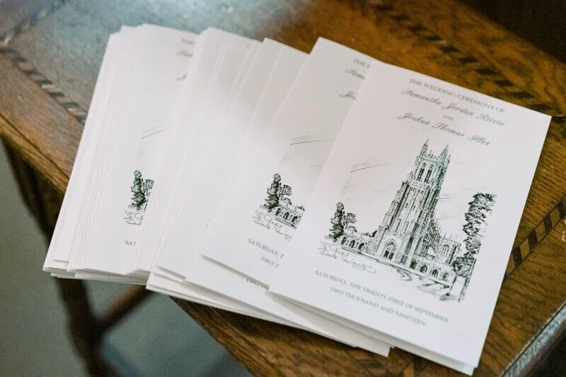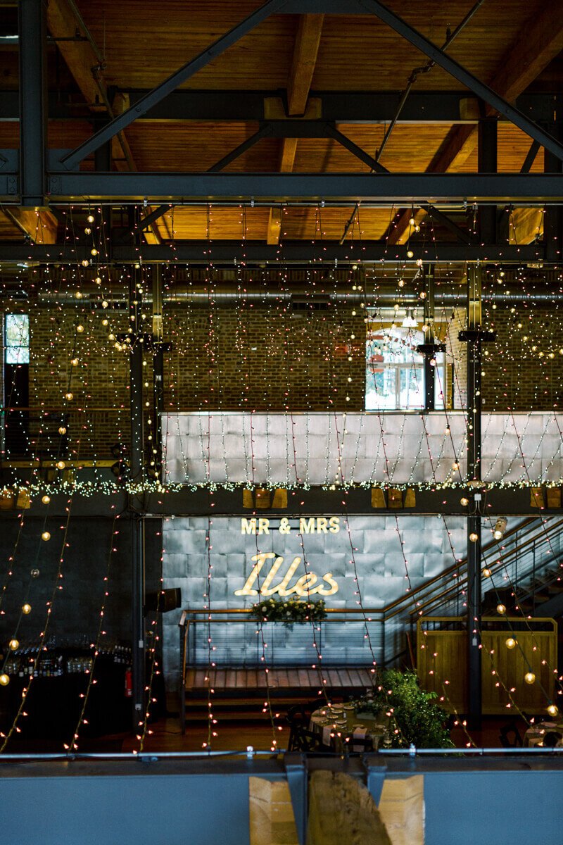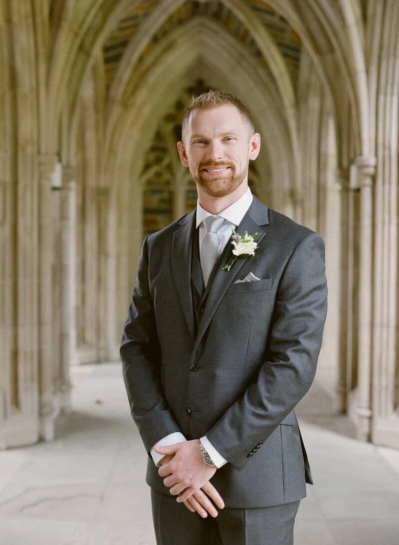 What was your wedding day inspiration? We drew inspiration mostly from the raw beauty of the venues we chose. Our ceremony was at the Duke Chapel, an awe-inspiring cathedral that created an ethereal feel with strong stone arches. The reception was at Angus Barn’s Bay 7, a renovated tobacco warehouse in downtown Durham. Our goal was marrying the more masculine engineering side with natural, whimsical elements. Josh is an electrical engineer, so lights were a focal point for the whole day! He is also a very talented craftsman, which we were able to showcase with a marquee-style sign he made saying “Mr. & Mrs. Illes.” I’m a civil/environmental engineer and have always been drawn to the simple elegance of nature. We chose natural, tree-like arrangements intertwined with sparkling lights and hanging candles. The reception felt like a fairytale forest in an industrial building.
