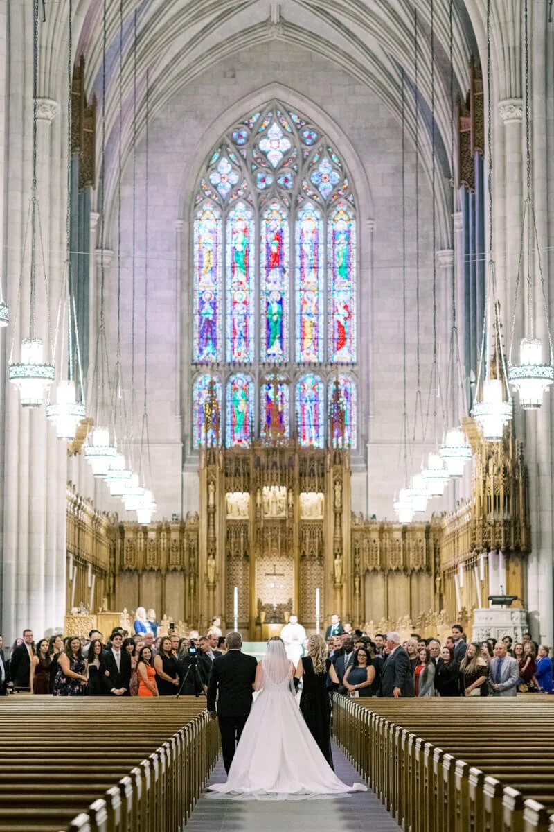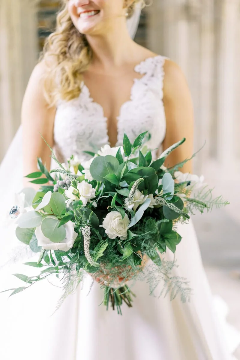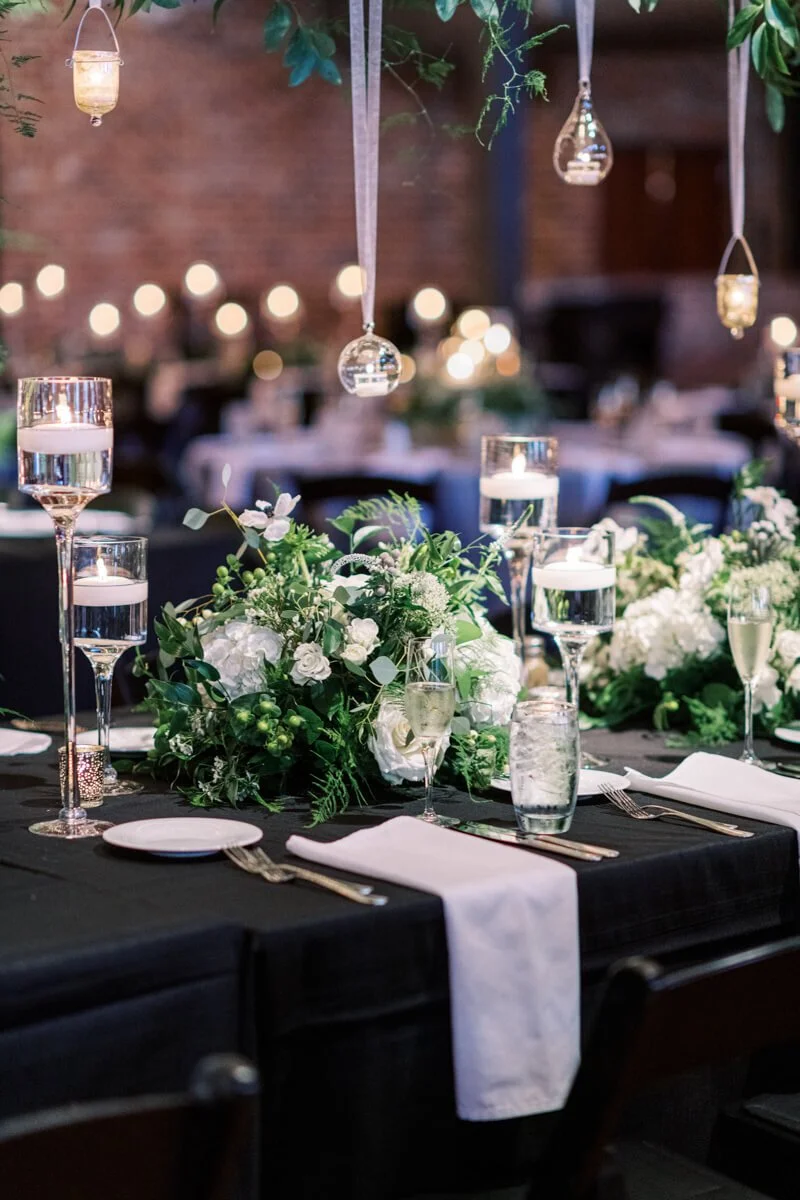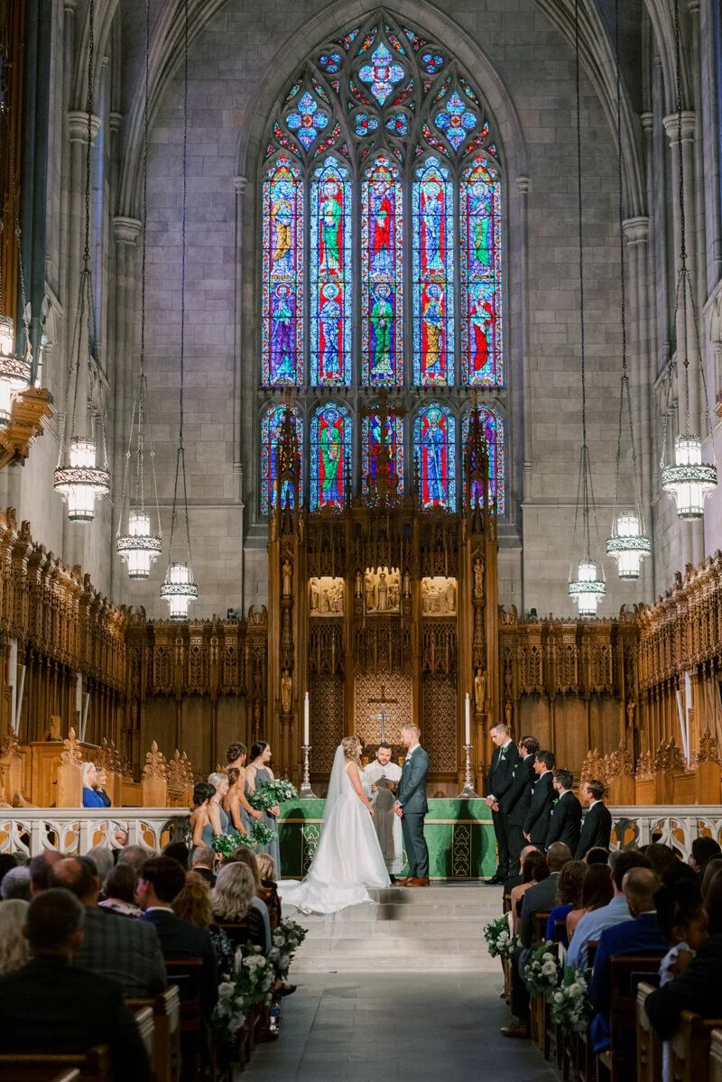 What was your wedding day inspiration? We drew inspiration mostly from the raw beauty of the venues we chose. Our ceremony was at the Duke Chapel, an awe-inspiring cathedral that created an ethereal feel with strong stone arches. The reception was at Angus Barn’s Bay 7, a renovated tobacco warehouse in downtown Durham. Our goal was marrying the more masculine engineering side with natural, whimsical elements. Josh is an electrical engineer, so lights were a focal point for the whole day! He is also a very talented craftsman, which we were able to showcase with a marquee-style sign he made saying “Mr. & Mrs. Illes.” I’m a civil/environmental engineer and have always been drawn to the simple elegance of nature. We chose natural, tree-like arrangements intertwined with sparkling lights and hanging candles. The reception felt like a fairytale forest in an industrial building.