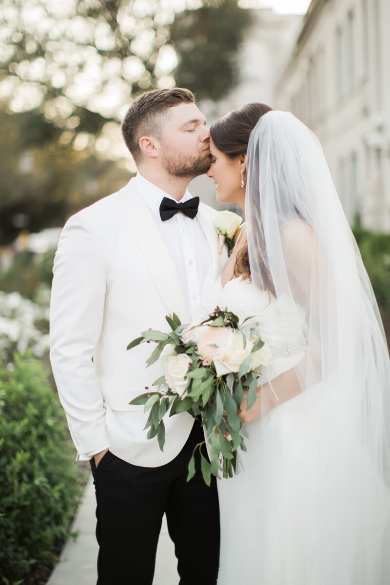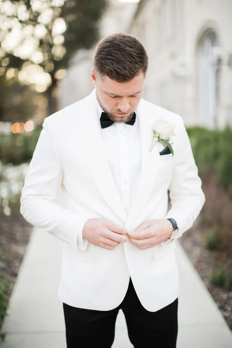 Jeff differentiated himself from his group of black tuxedo-clad groomsmen with a white tuxedo jacket.