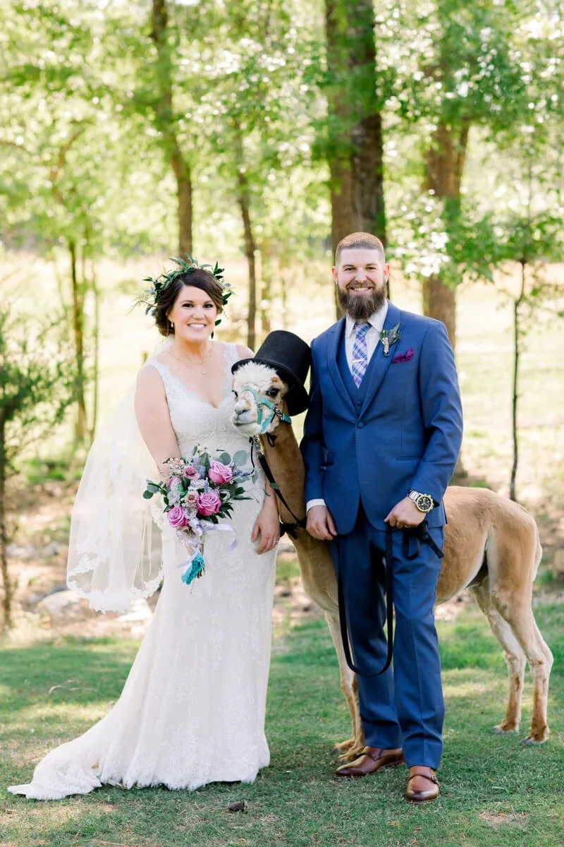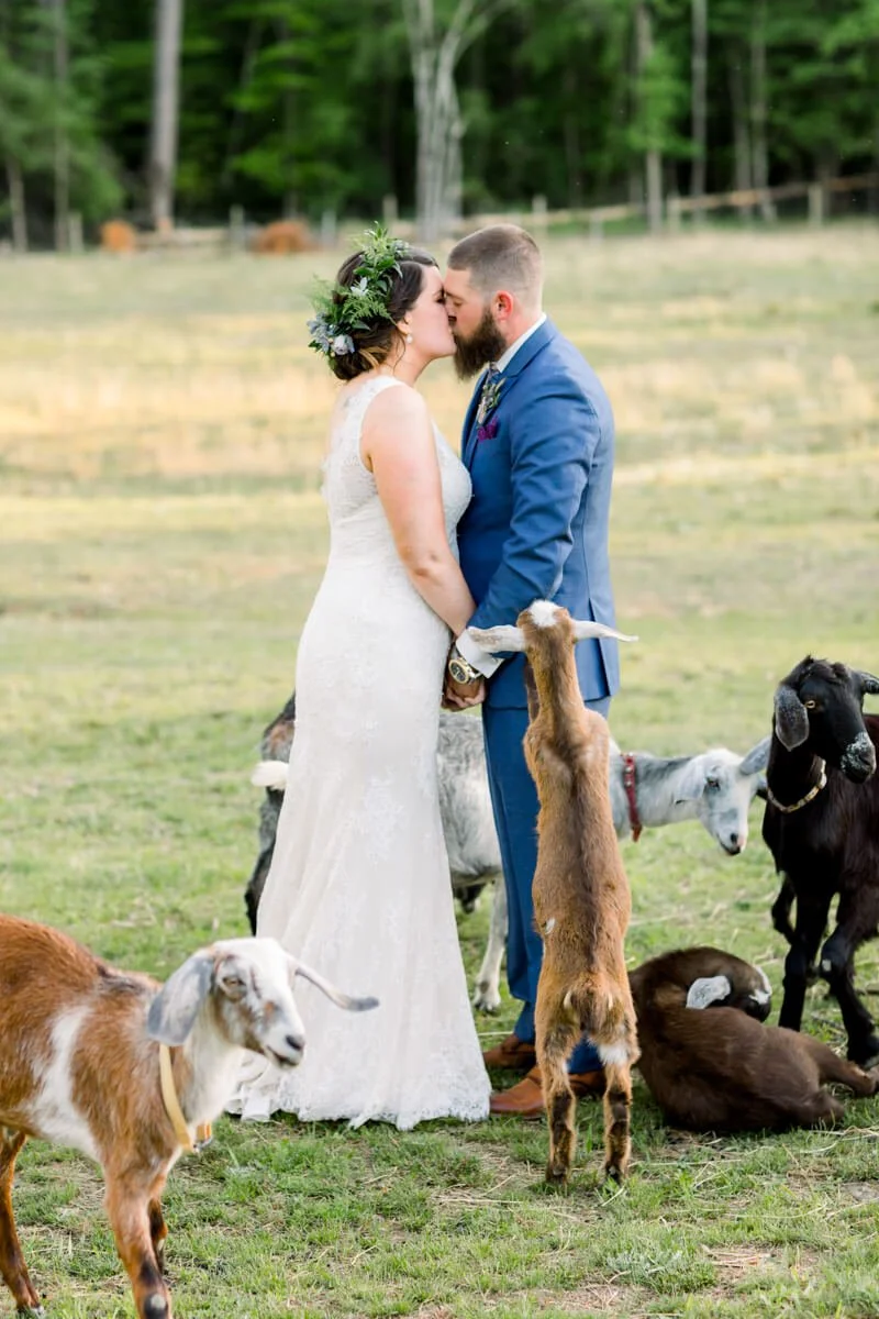 Jill and Justin celebrated surrounded by bouquet loving goats, an open-air chapel, and an elegant barn where they danced the night away!