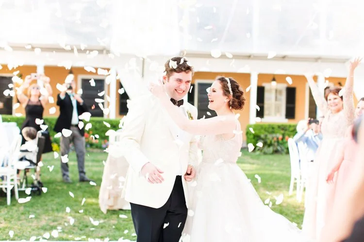 Maggie & Kevin had a beautiful fairytale wedding on April 16, at Gov. Thomas Bennett house in historic Charleston. The couple chose Charleston for the destination wedding because they both share much love for the historic city, but also because Maggie had lived their for a summer during her internship with Charleston Weddings Magazine. From the lush, bright colored florals from Branch Design to the amazing watercolor invitations the bride custom designed and pressed herself there and not to mention the "flower fetti" introduction to the reception, there was not one detail that did not complement her wedding theme! The bridesmaids wore convertible Jenny Yoo peachy gowns and carried whimsical flowy bouquets. Maggie was stunning in her Monique Lhuillier gown with a custom monogram embroidered underneath. Her wedding day shoes were also a hit! These studded jeweled D&G pumps were a one of a kind and matched her gold accents throughout the wedding perfectly! While there are so many moments about their day that we love, I think our favorite was her time with her Grandma Rosemary before the ceremony. There time together was simply remarkable much like the love Maggie & Kevin share for each other. You can probably tell from the images both of them experienced sheer wedding bliss all during their ceremony and at the reception. When we asked the couple about their love story, Kevin replied with the following message which is so heart felt. From the Groom: It was incredible. I met Maggie when I was in first grade before my family moved to Newtown. We were neighbors and friends growing up, and it was actually because of her family that we moved to Newtown. Her parents lived in Sandy Hook before they moved down to NC, and when my dad got the job in white plains Maggie's parents recommended we look at Newtown. I remember the night before we left NC it was Halloween and I was in Maggie's room with her and Sarah saying goodbye I can even remember her Pocahontas bed spread lol. We finally had the chance to see each other again after my parents moved back to NC. I drove down to visit her and we went to a movie with Alex Beerfest to be exact haha. After the movie while driving back in the car a song came on and Maggie said oh this brings up bad memories. My first thought was I don't want her to have bad memories. We stayed in touch over the years and things finally changed when I returned to NC for college. Although I will admit it may not have been fully because of me. I was always nervous to see Maggie because I didn't want to mess it up and I assumed she could not have a crush on me like I did her. However after a few failed attempts to see each other ie. Myself getting nervous and backing out. Maggie finally said enough is enough and texted me "Kevin how have we not hung out yet?? If you are in Raleigh again and we do not hang out we are not friends". She sent me this at 7pm but I didn't see it till 11 or so and I was worried she was going think I didn't care since it took so long to respond. When I finally responded she immediately sent a reply and we kept talking nonstop till about 430 am when she said "tell me a secret?" I said well it's now or never and I said I have always had a crush on you. Maggie responded "I have always had a crush on you". And that was it we haven't stopped talking to each other or being around each other since that first text to me she sent that night. I am so happy she was forward and took a chance. I cannot begin to explain how perfect the wedding day was. Maggie did an ENORMOUS amount of work for the wedding she is a graphic designer and she has a letterpress. So she took the time to do a lot by hand so it could be hers and it was incredible I helped along the way and I am still in awe of the final products she is so incredibly talented. It felt like our wedding was out of a movie.
