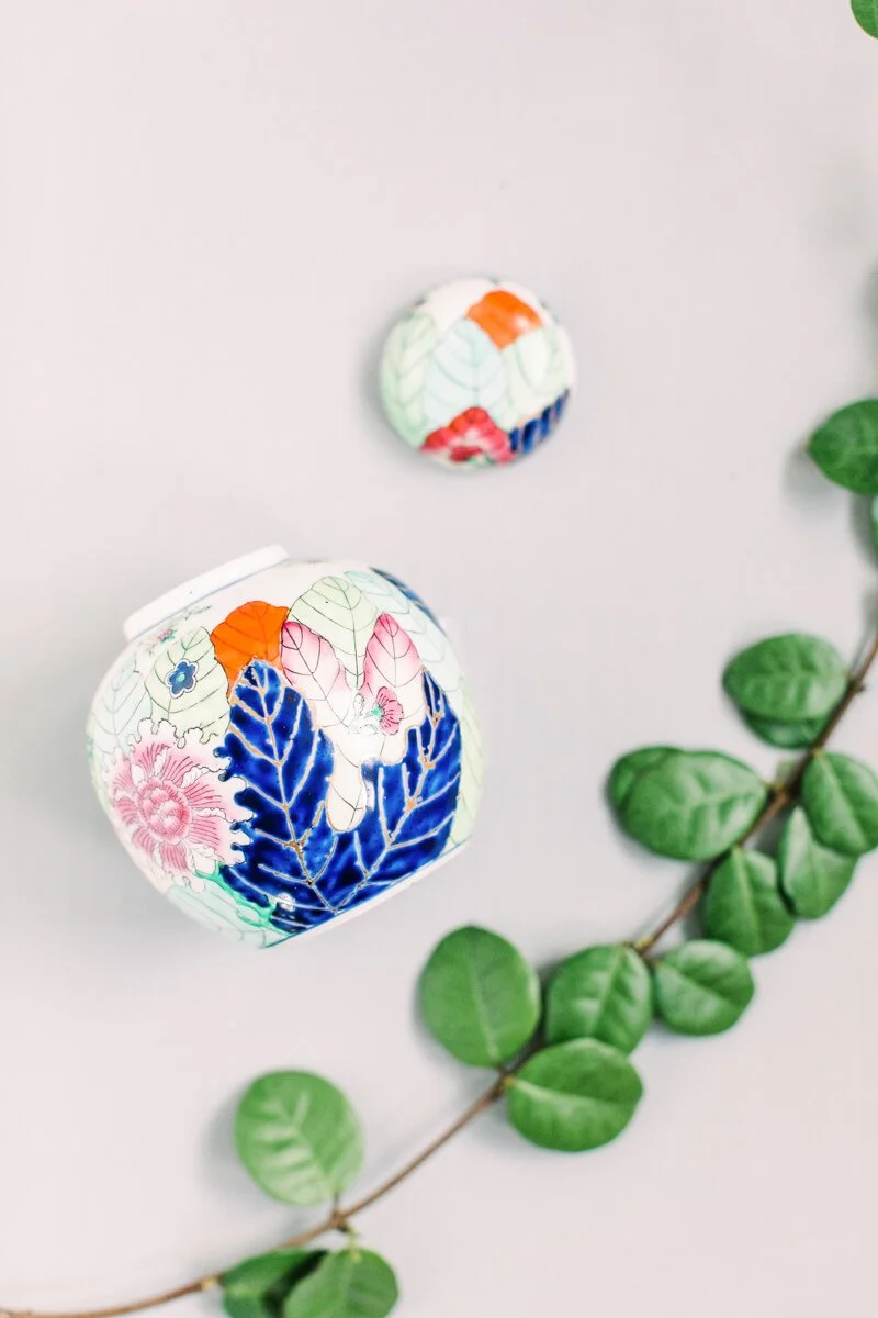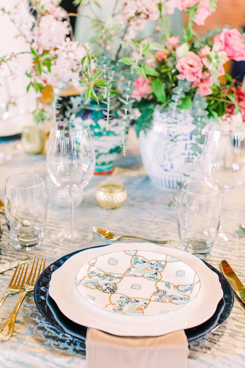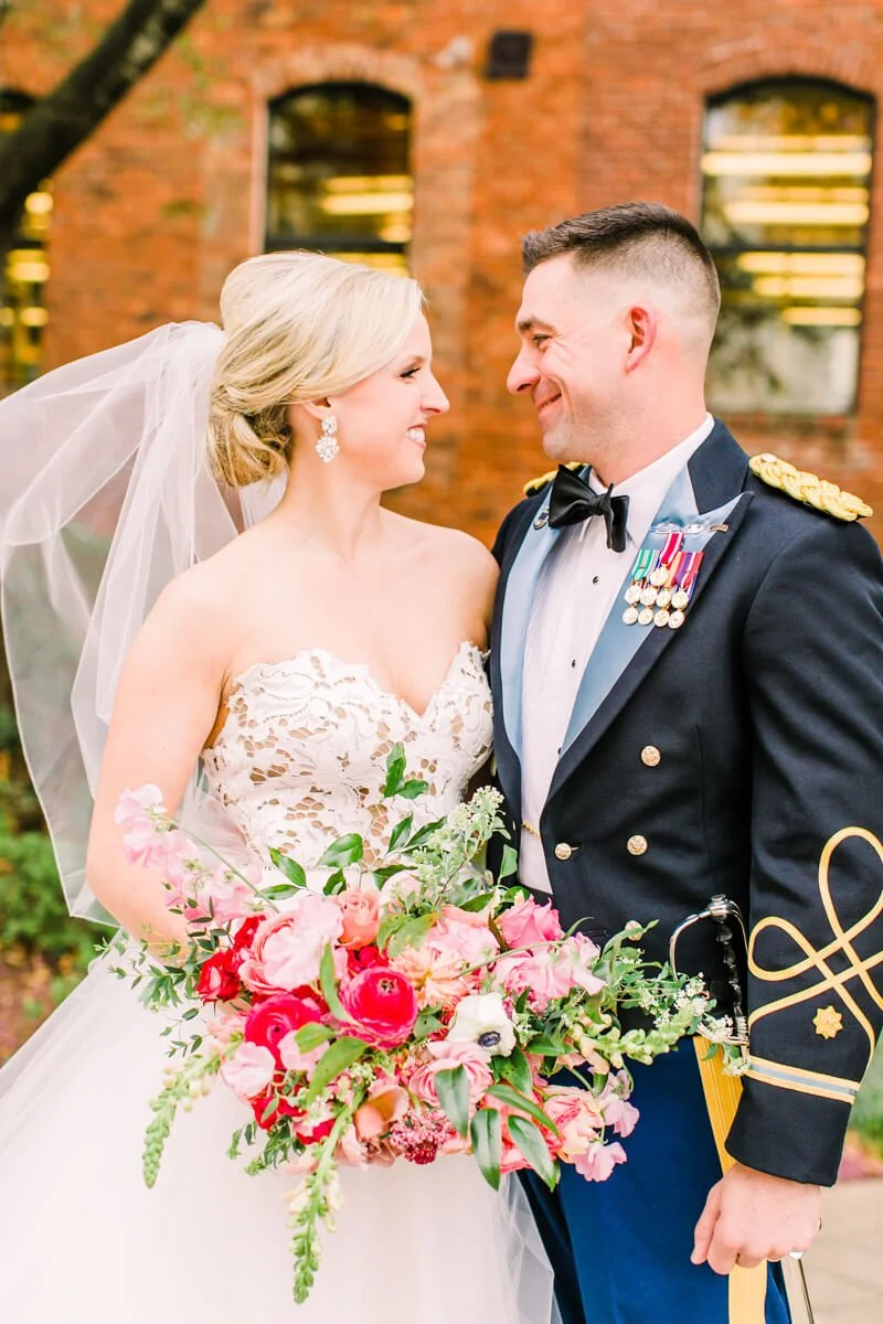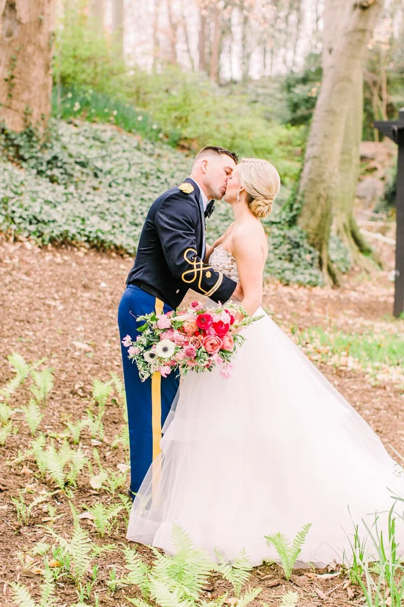 Margaret is a successful business woman, traveling all over the US for work. Ben is an Army Ranger and one of the hardest workers she knows. They knew they wanted to implement a timeless approach to their design, as well as incorporating Ben's Ranger details and dress blues. They have both attended so many weddings, and are the last of their friends to get married, so they wanted it to be something super fresh and special for all of their friends and family. Margaret spotted a small ginger jar in her living room, she was drawn to the bright and vibrant colors, and deemed it her "inspiration pot." She handed the ginger jar over to the ladies at Upstate I do, and they created magic.