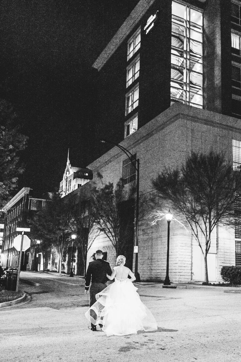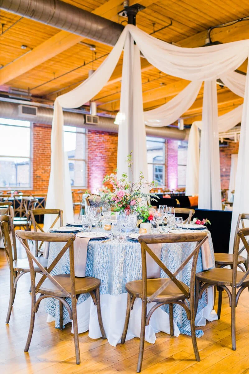 Ben and Margaret planned a gorgeous soiree with the help of Upstate I Do's planning and coordination. Margaret wore a gorgeous Hayley Paige gown, while Ben wore his Army Ranger dress blues. Their color scheme was a vibrant mix of summer palettes, implementing a bright blue to tie in the groom's dress blues. The draping and lounge area in the Huguenot Loft would make Anthropologie jealous, with it's lush velvet couches and gold end tables and accents. It provided comfort and flair to the timeless space. They danced the night away to the sounds of the Band of Oz, and cut their cake with an Army Ranger sword, per tradition. It was a night that they will never forget!