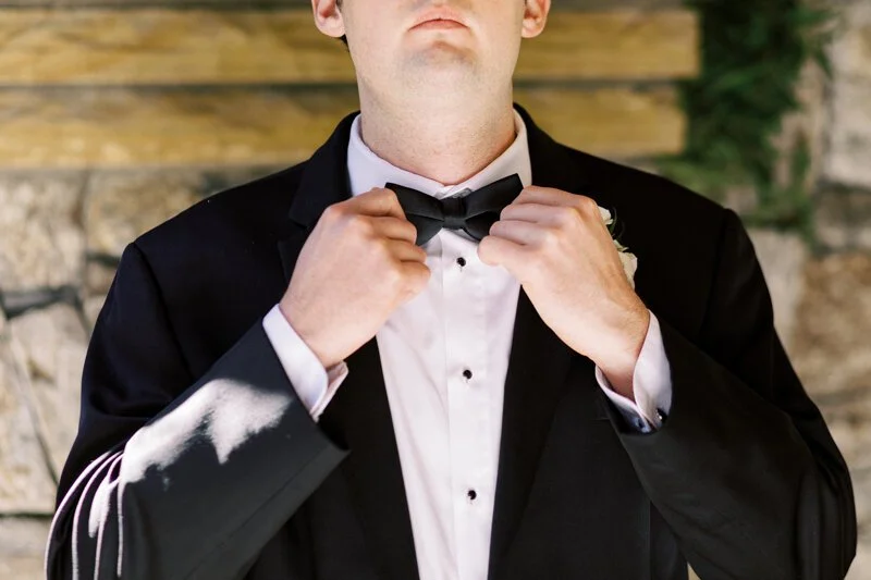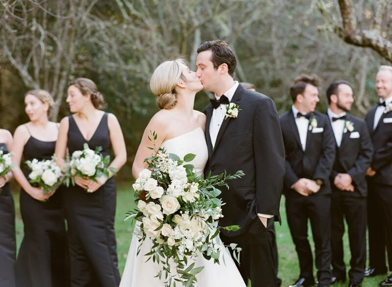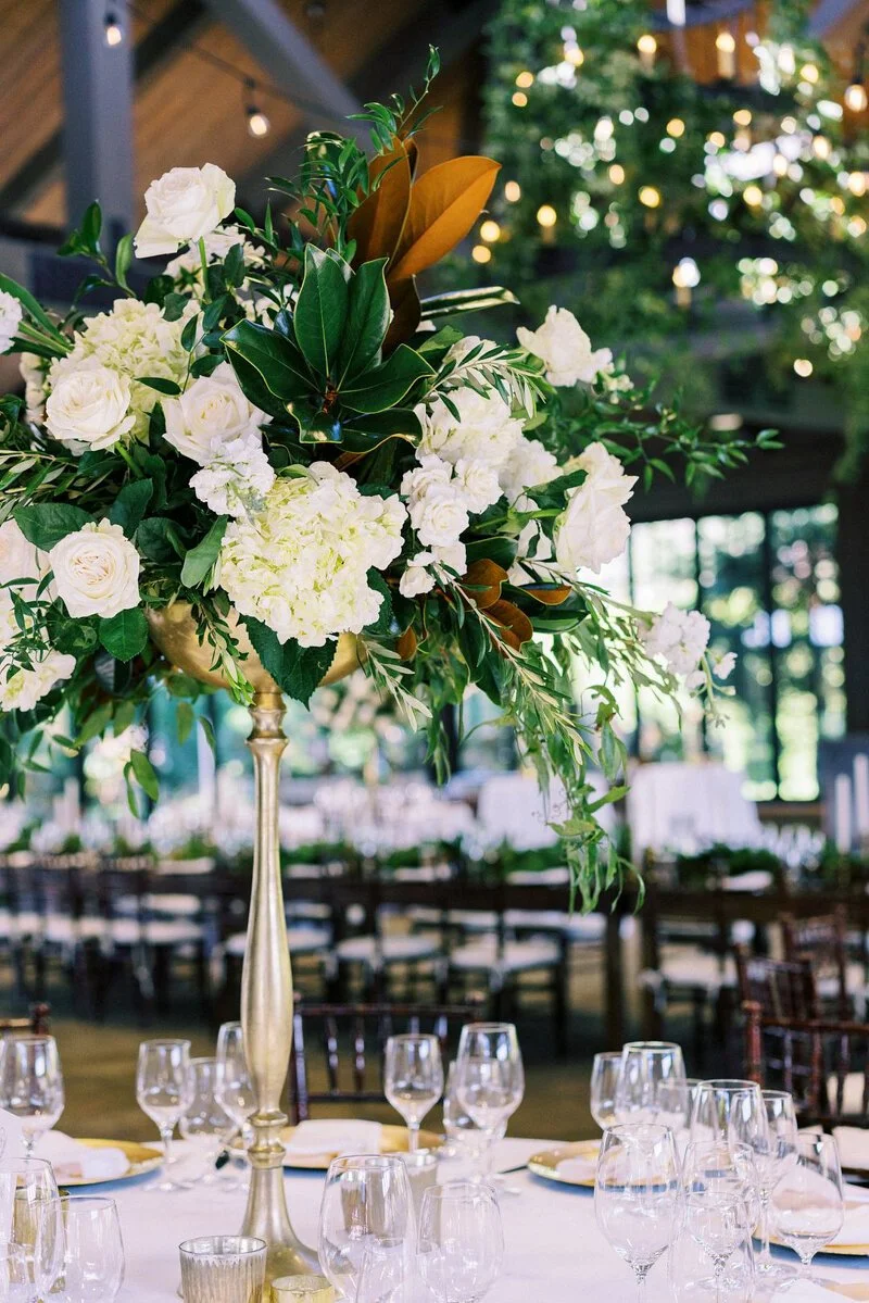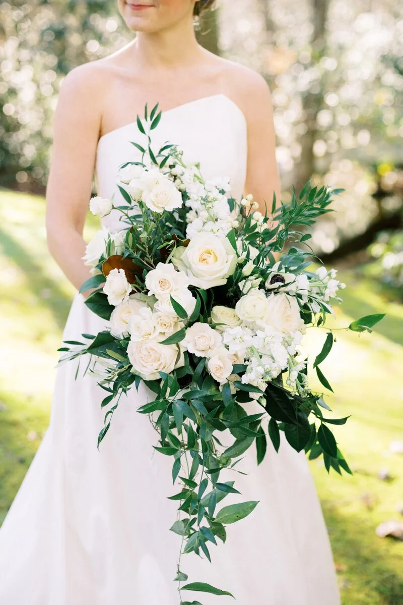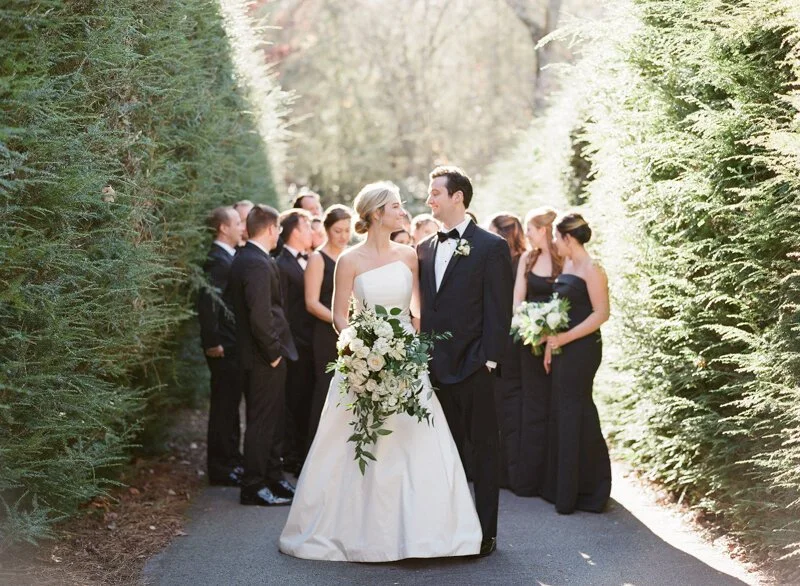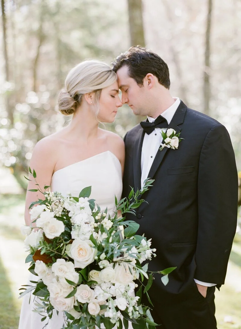 We knew we wanted the wedding to be in Highlands. My grandparents live in Highlands, and I grew up spending summers and holidays there. We wanted a classic, timeless and formal wedding, but also wanted to incorporate a “mountain feel” where we could. I wanted to use deep green florals because it reminds me of the surroundings in Highlands. We also incorporated some magnolia leaves because my mother and grandmother always had magnolias in the yard and magnolia leaves throughout the house. Our color palette was green, black, white and gold, and the bridesmaids and groomsmen both wore black.