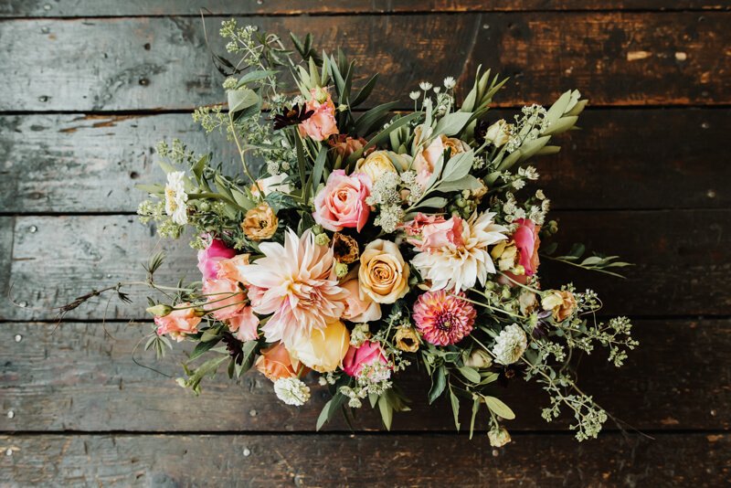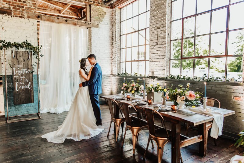 From the photographer: As we look ahead to 2019, we see that the industrial look is IN. Brides and grooms both love it, and "industrial" is quickly replacing "rustic". A group of professionals in the Triangle, NC came together to create a shoot that was industrial yet incredibly romantic. Our color pallet of blues, grays, peach and a pop of mustard yellow looked stunning in the old mill against the brick and hardwood floors. We selected cement and copper as our textures and a creative alternative to gold and marble which we always see.