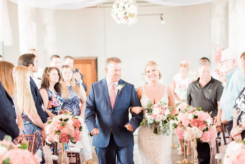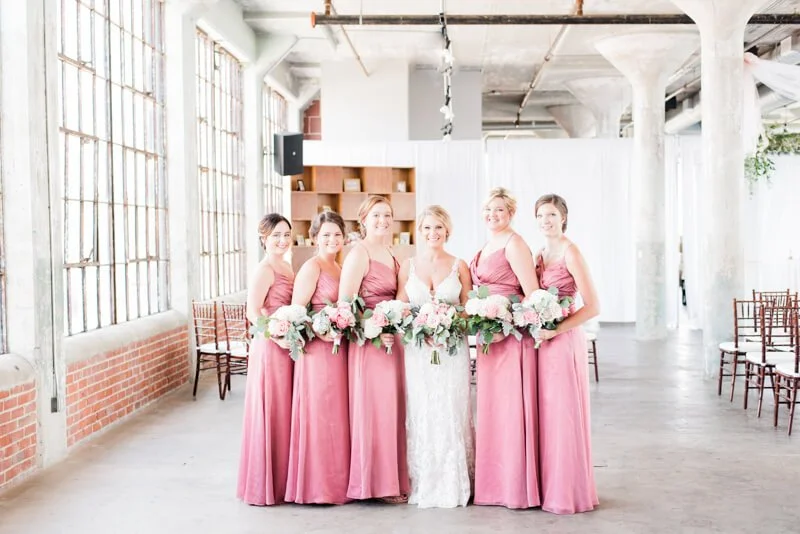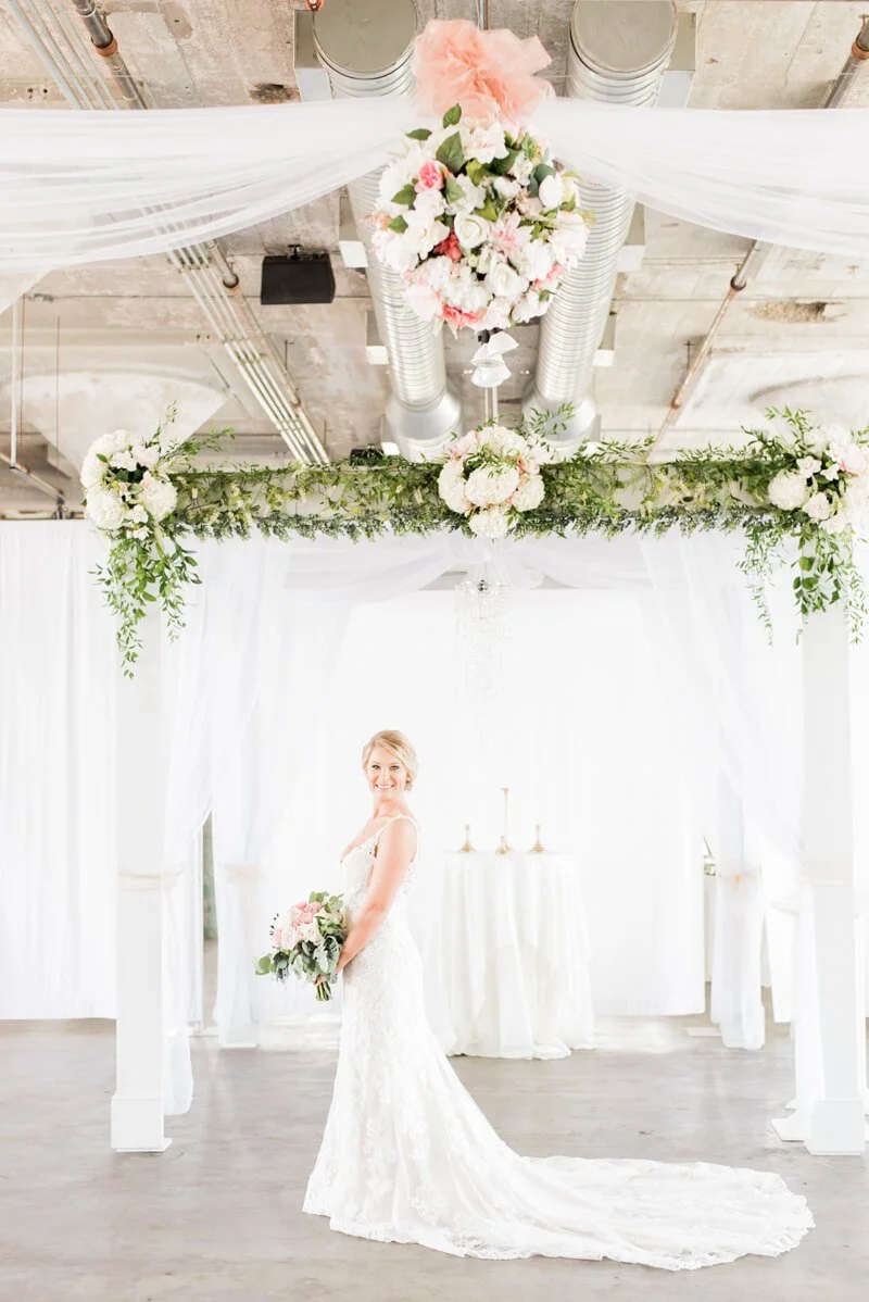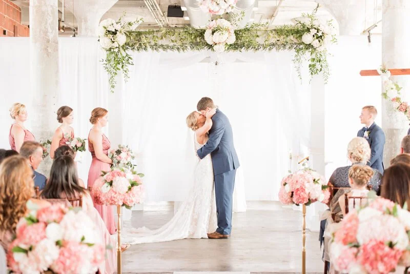The Lofts at Union Square was the perfect location for Brittany and Joshua's lovely late summer wedding. From the bridesmaid bouquets, to the beautiful hanging flowers above the ceremony and reception space, the pops of pink and white transformed this space to feel romantic and inviting. My favorite detail was the beautiful flower arbor. It is so evident that Brittany and Joshua dearly love their friends and family. They just wanted their guests to have a fun evening.