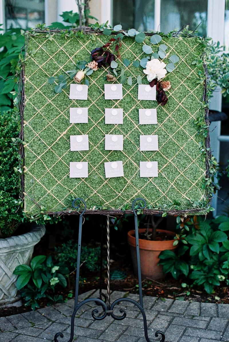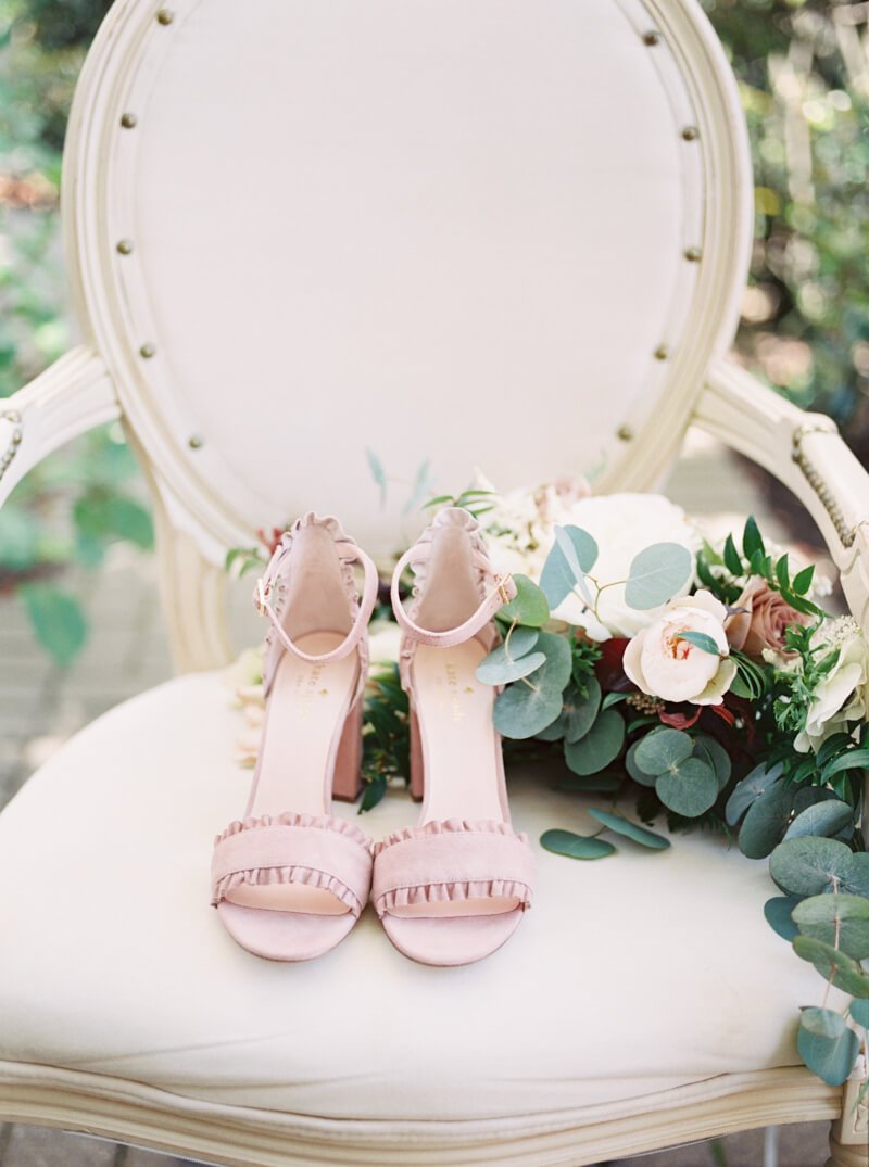 Grey, blush and maroon colors with gold and copper were used to style this romantic wedding. And of course tons of greenery! The bride wore a custom Sadie Collection ball gown with a ruched bodice and a tiered organza skirt, and carried a lush bouquet filled with peonies, amnesia roses and ranunculus created by Just Priceless. The blush Kate Spade shoes with ruffled details perfectly matched the tiered skirt of her wedding dress. A moss-board seating chart was decorated with grey escort cards with custom wax seals designed by Design by Laney, leading guests to the long tables decorated with grey candlesticks, copper flatware and grey and white ceramic plates.