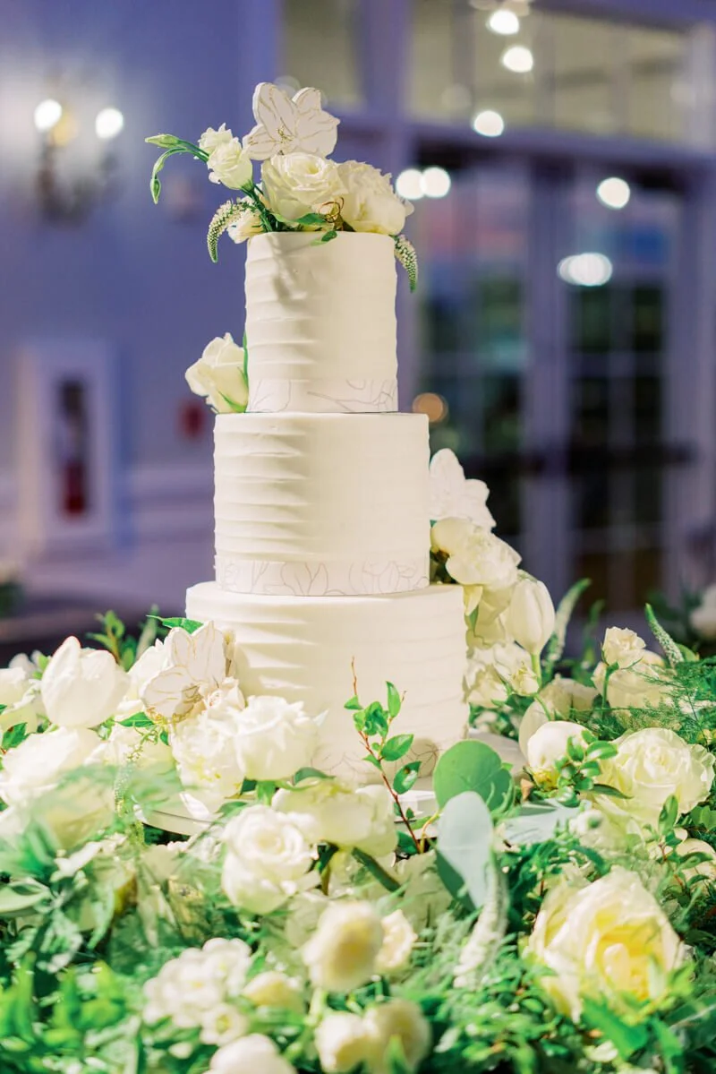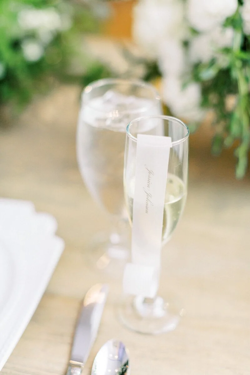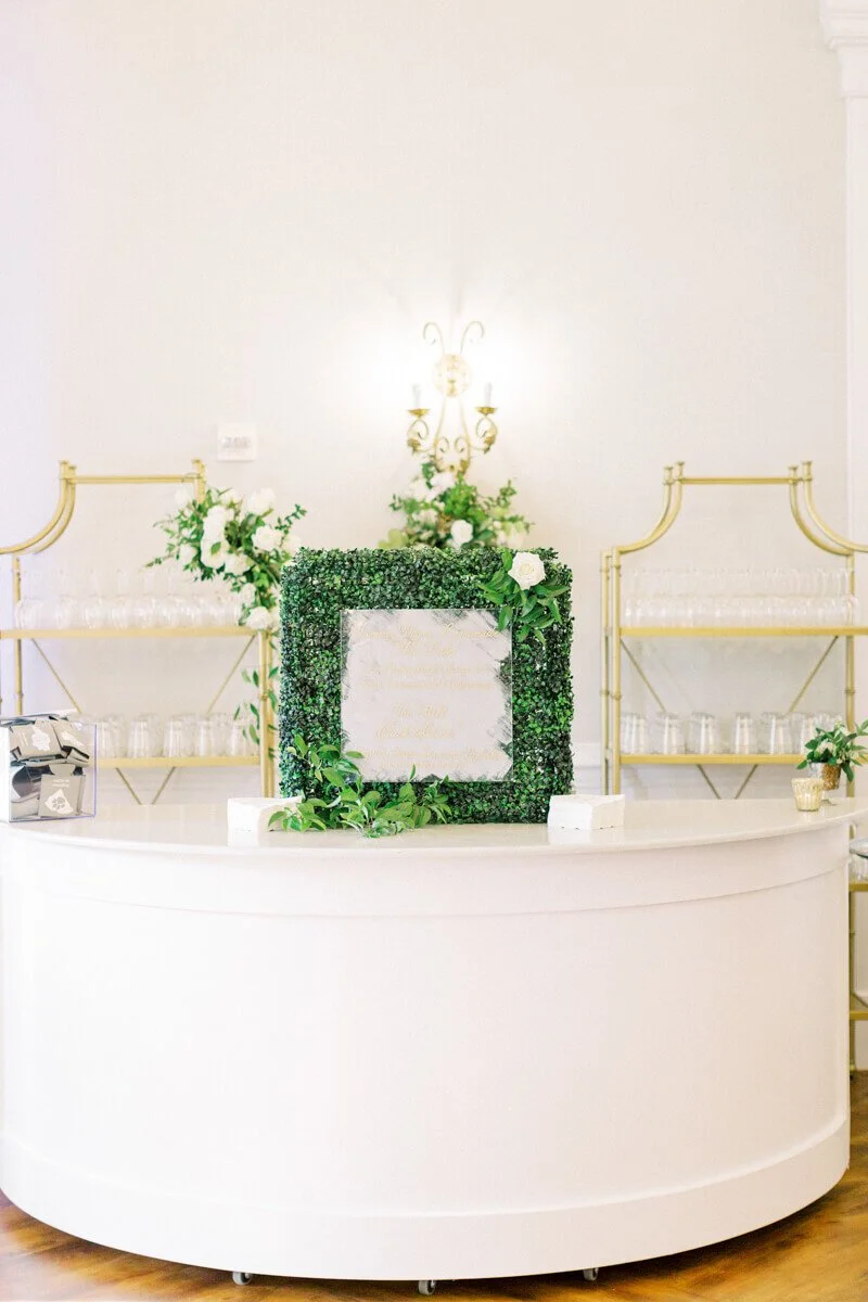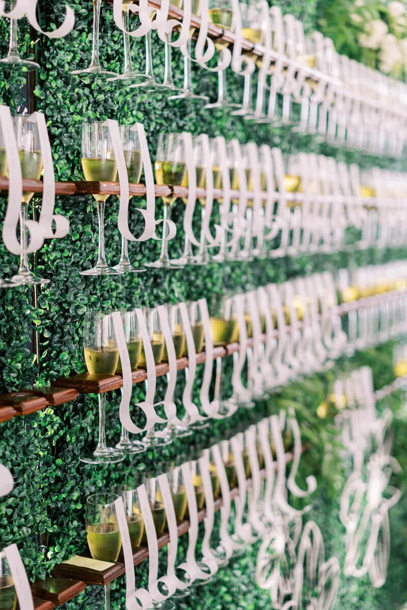 The neutral color palette leads way for an array of flowers in many forms to be featured on details from the welcome bags to the champagne wall to cake toppers. Floral pieces were not to be missed wherever you went. Guests were given a sneak peek of the wedding to come when they were mailed a custom invitation by Mason Dixon Designs. The floral motif greeted guests at the ceremony and carried them through the reception.