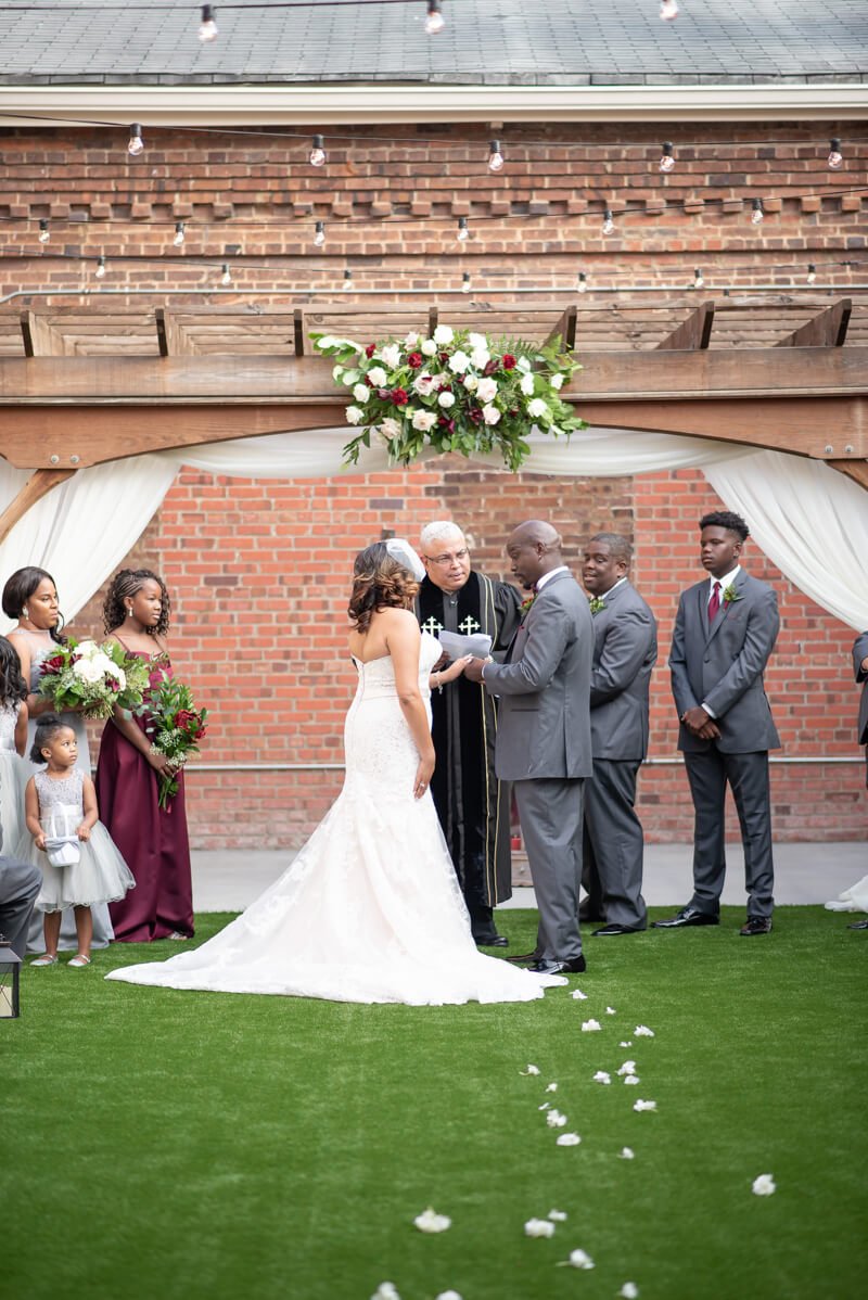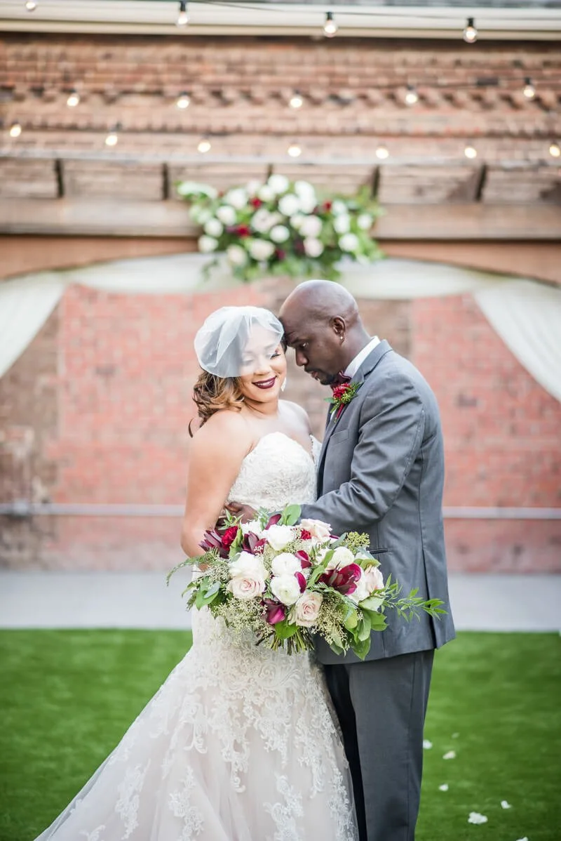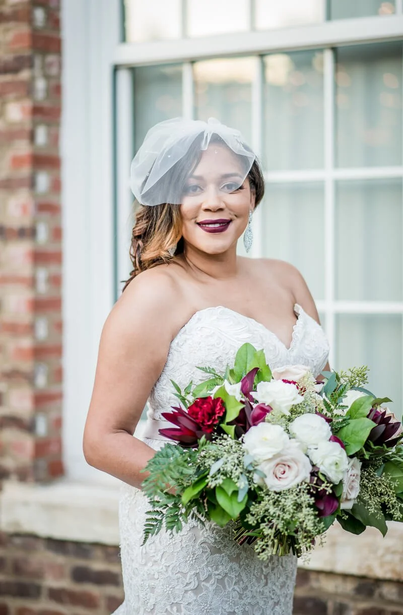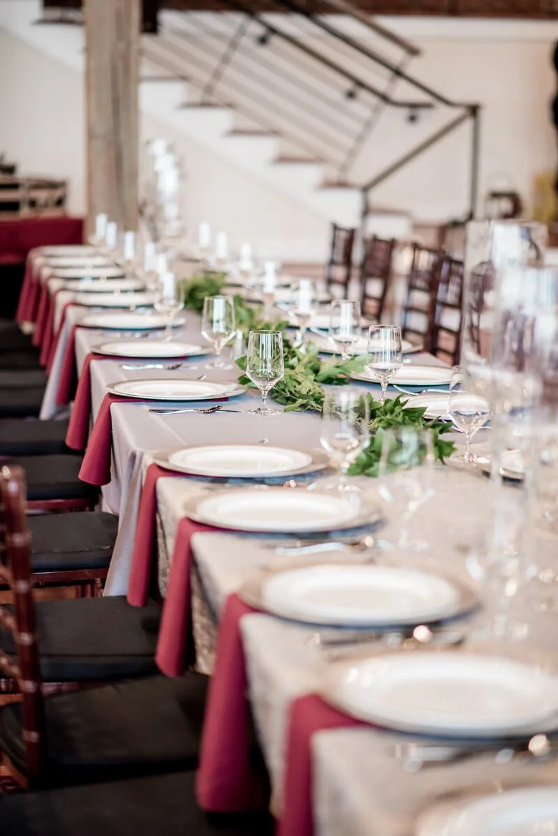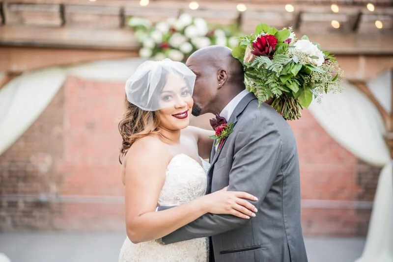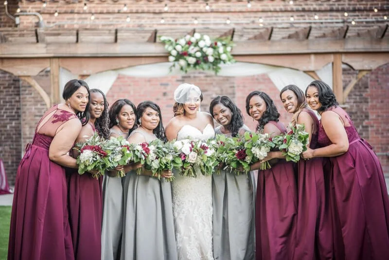 Kimberly envisioned classic vintage romance when planning their wedding. The décor, bridesmaids dress and florals were filled with deep reds, grays and greenery. She did not want the latest trend to be the inspiration for the wedding as she prefer things that are simple, but elegant and classic in style, which have withstood the test of time.