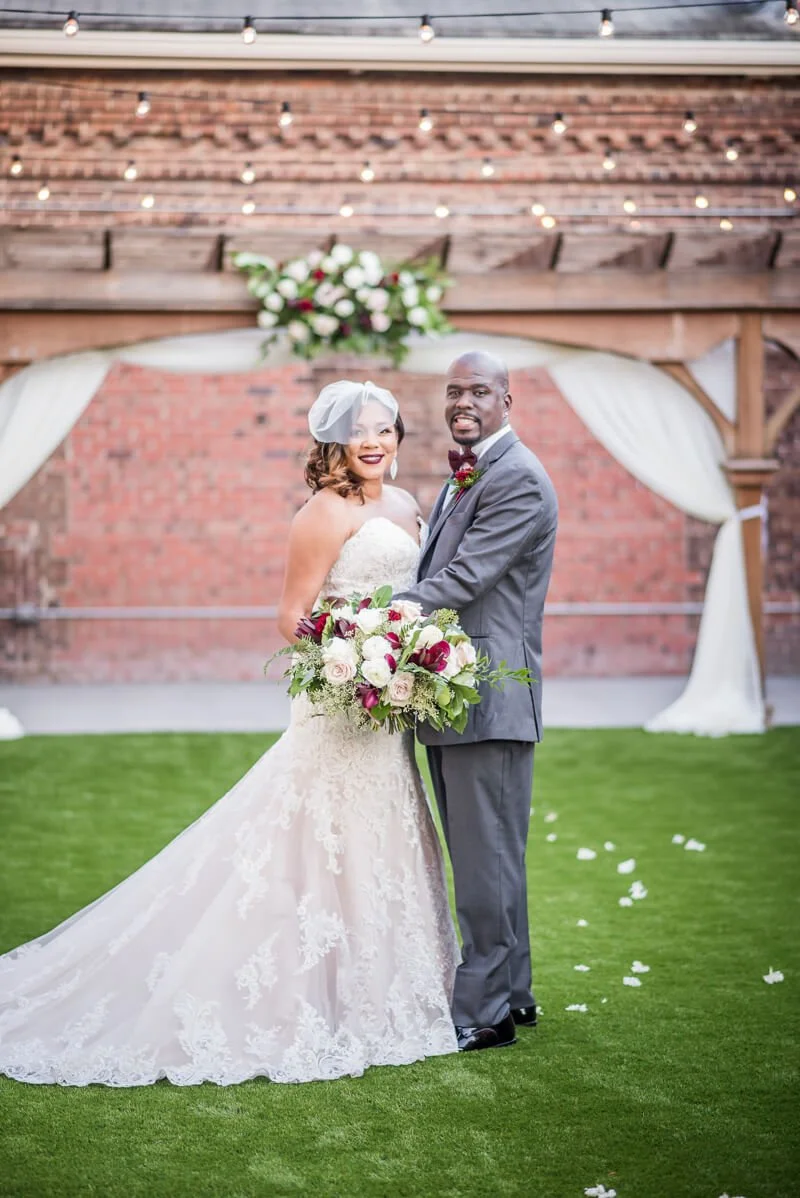 They couldn't have picked a more perfect venue to pull off the look she desired. The old brick, wood pillars and café strung lights pulled everything together!