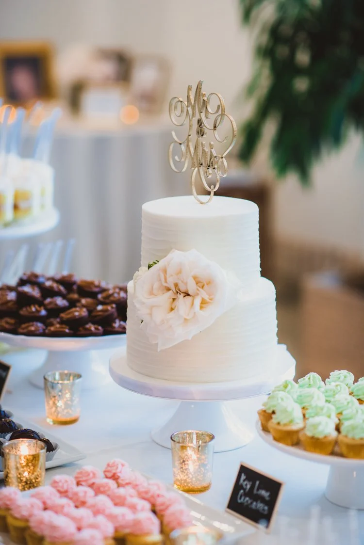 Emily and Tyler were joined together by marriage under a sunset sky in Wilmington, North Carolina. They invited 200 of their closest family and friends and spent the night celebrating the love that they shared. When planning the wedding Emily’s vision was centered around the idea of “timeless elegance.” With her love of neutral tones and accents of gold, her vision created a magical backdrop at Wrightsville Manor. With the help of Carolina Bridal World, Emily dressed her bridesmaids in a high neckline, champagne dress to compliment her neutral color palette. She wore a custom designed dress created by Casablanca and Badgely Mischka heels. From the Bride: “My dress was more beautiful than I ever imagined. When designing it, I was a little worried that it wouldn’t turn out like I had envisioned but I was in awe the first time I saw it. I now have a designer sketch of my dress that I have framed and out on display.” Their wedding wouldn’t have been the same without their dog present and of course he had to look the part too. Emily’s not sure who was more handsome, her now husband or her fur baby. For dessert, One Belle Bakery created a delicious dessert bar full of assorted cupcakes, banana pudding shooters, caramel apple pops, and so much more. They beautiful display surrounded a double tier wedding cake for the bride and groom. Emily’s favorite décor was the suspended floral ring that hung over the center of their dance floor. From the Bride: “Blossom Bay Design was unbelievable, from my beautiful bouquet, to the jaw-dropping floral ring. They nailed it all!”