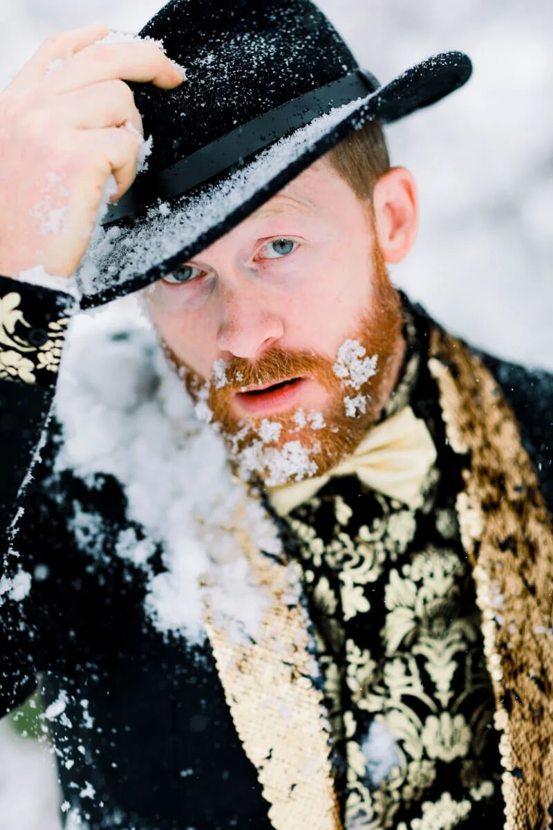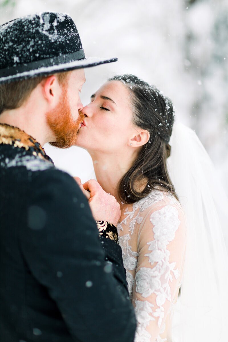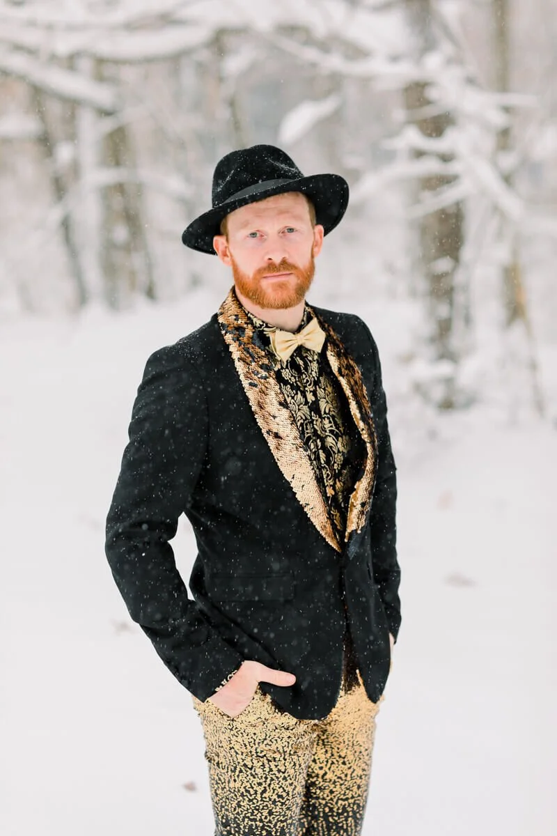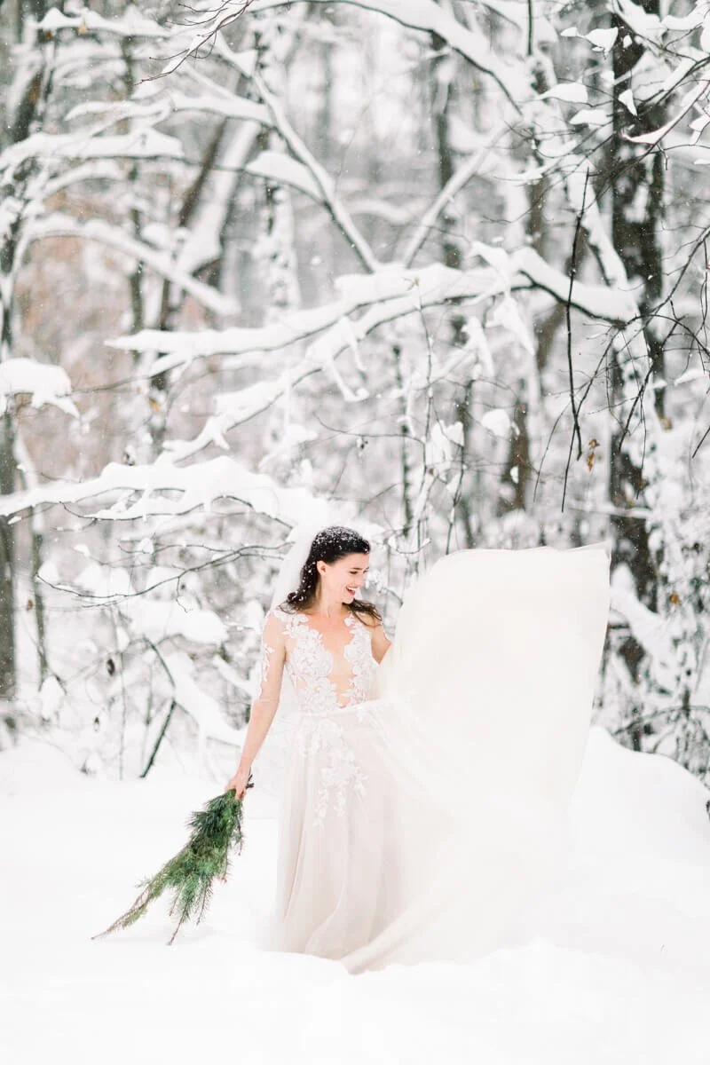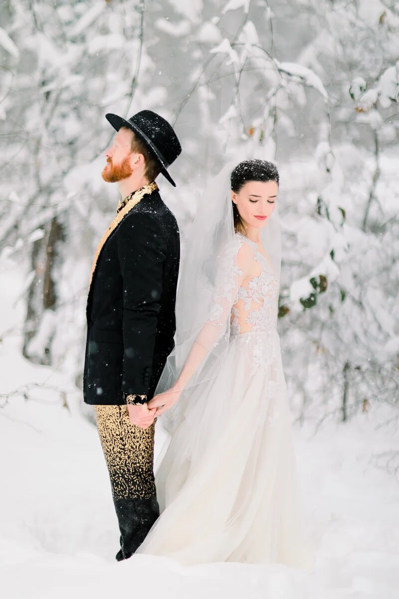 Chloe had her bridal portraits schedule for the day that we had the biggest snowstorm of the year, and Neil drove her across town in feet of snow so that we could do this gorgeous snowy session. Since he was there, he decided to bring along his wedding day outfit (he's an American Ninja Warrior, and his competition costume is gold, so his wedding outfit was black and gold) for photos. He didn't want to see her in her wedding dress before their New Year's Eve wedding, but we managed to get beautiful shots of the couple together while he kept his eyes closed.