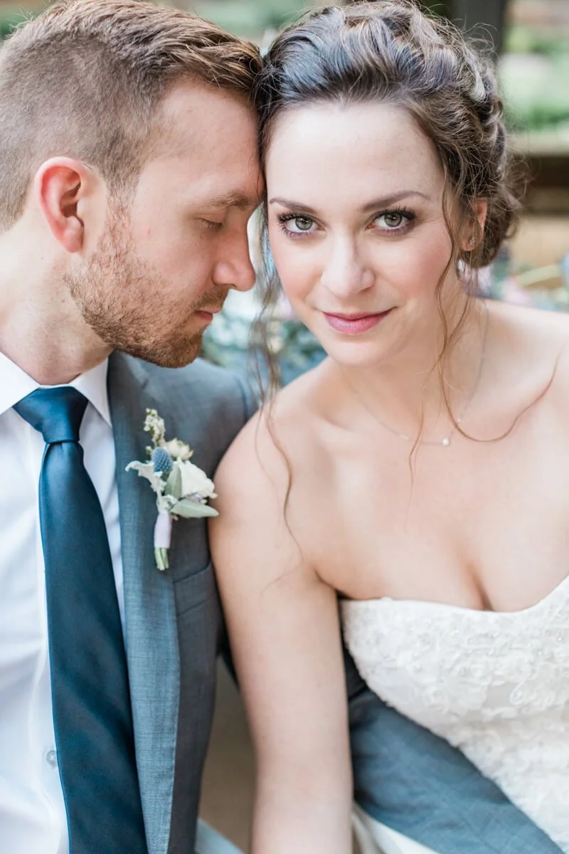 From Alayna Kaye Photography: When Eliana and I first started talking about wanting to collaborate on a styled shoot, we knew we wanted garden style florals and a clean, light and airy color palette with a touch of drama. We added the slate blue and deep crimson touches to the always classy blush and pastels to achieve this. We kept gravitating toward everything French inspired and decided to run with a French Gardens theme. The gorgeous farm style table we used was actually a DIY project by Eliana that turned out perfectly. The models are a real couple who were celebrating their 2 year wedding anniversary in the same gardens where they took their engagement photos. We had scheduled the shoot a few months out and it ended up being the week that Hurricane Irma was hitting NC, we somehow lucked out because the day before the shoot it was pouring rain the whole day, and it continued the day following the shoot. With the hurricane affecting flower imports, Eliana had to get creative and use a few flowers and "weeds" found here in her back yard in NC. Everything came together beautifully and I personally feel that those lesser used flowers and greens made it uniquely captivating
