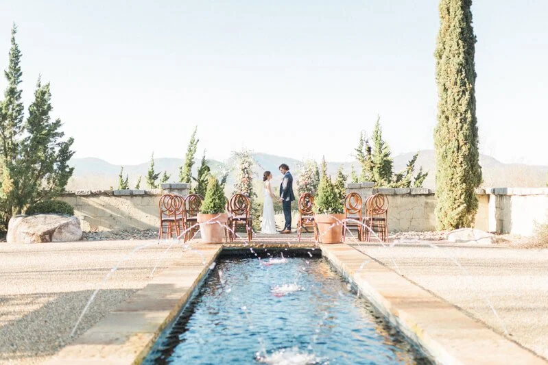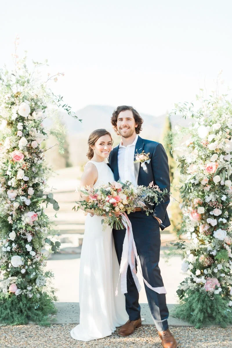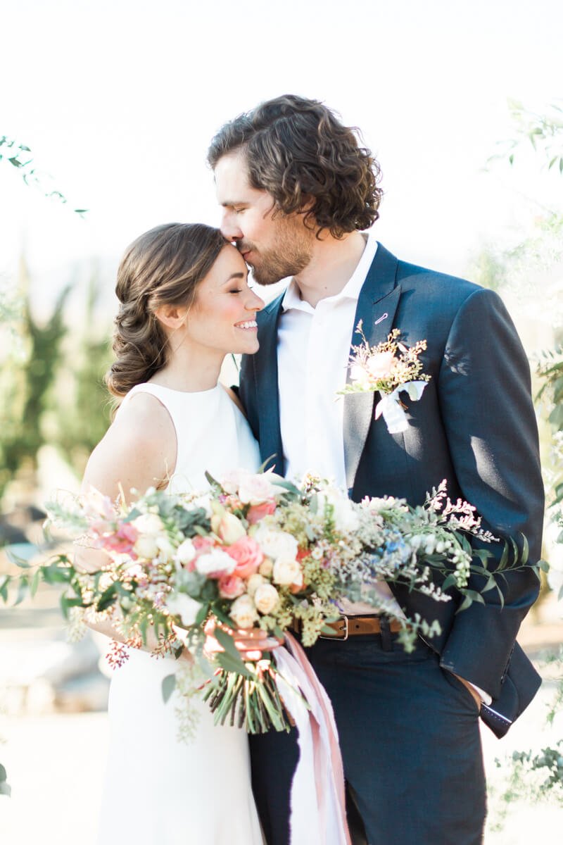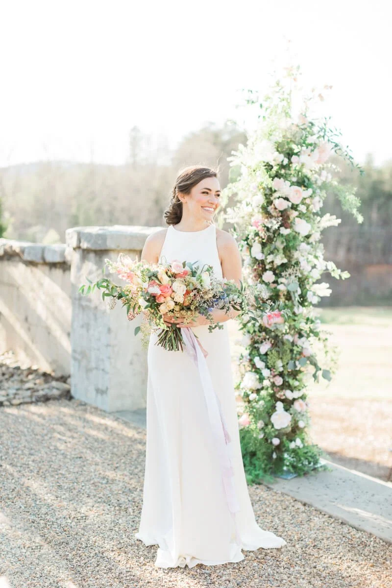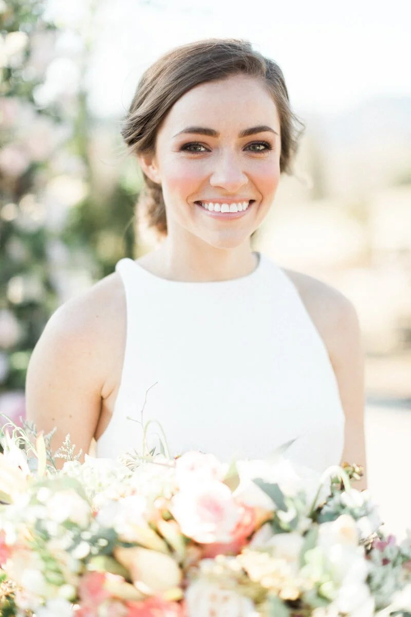 Our bride’s hair and makeup was the impeccable work of Cindy Mcgrath Makeup. The makeup was kept simple which allowed for our bride’s gorgeous features to be displayed.The hair was a loosely swept back and twisted hairstyle that matched the laid back nature of our bride. To continue the minimalistic look, the Iva Crepe Maxi dress by Jill Jill Stuart was the perfect choice for our bride. While understated, it’s simple and minimalistic design didn’t need to compete with the backdrop or florals. It made its own statement without trying too hard. To finish off the look, The Chloe heel from Bella Belle’s bridal collection featured beautiful embroidered and beaded florals. The blue, pink, and peach floral designs looked as if it were made for this occasion. Plus, they offered that romantic and fine art detail that our bride appreciates.