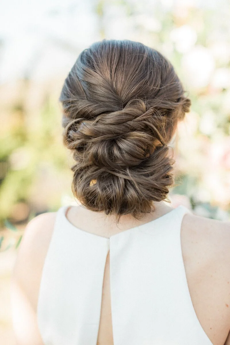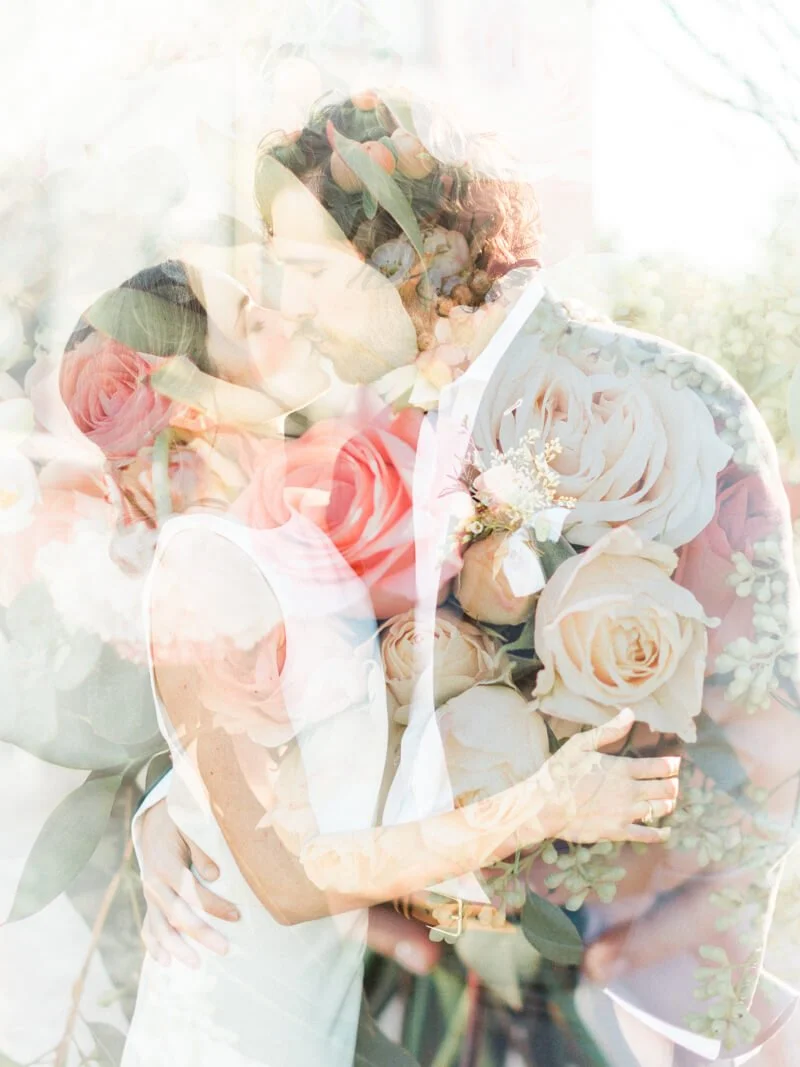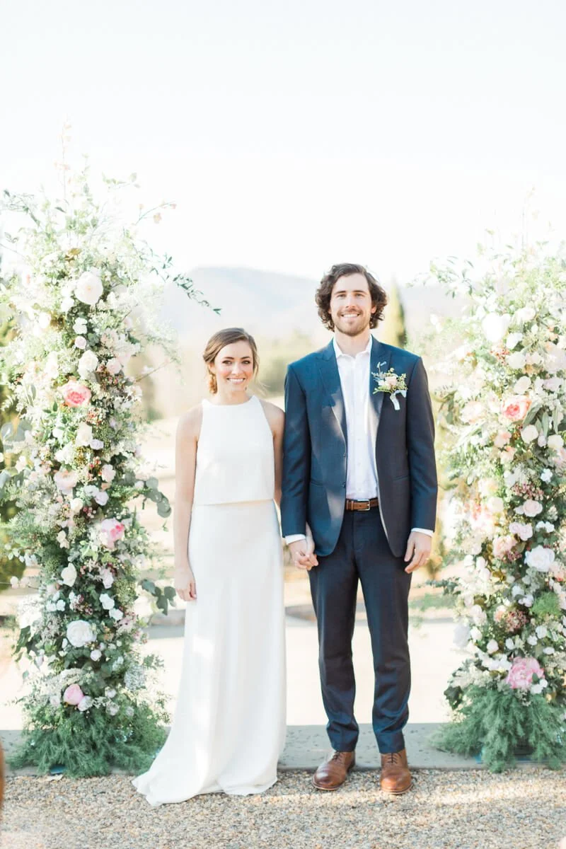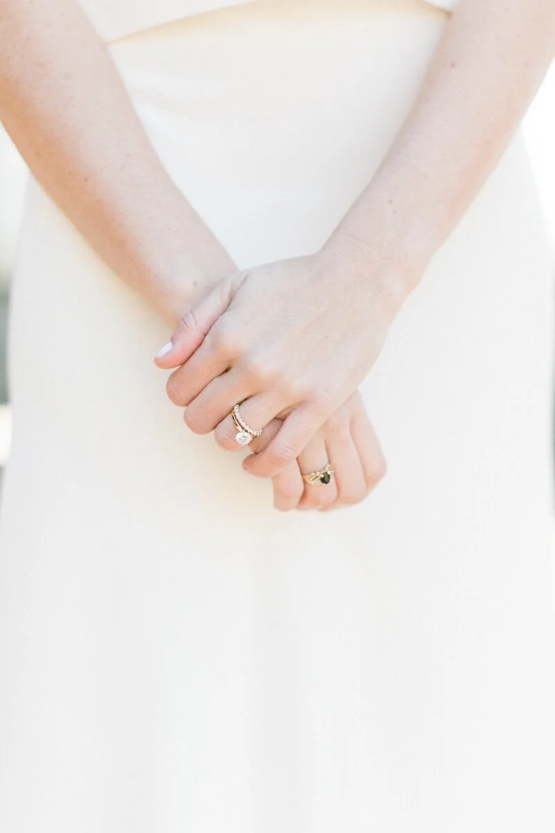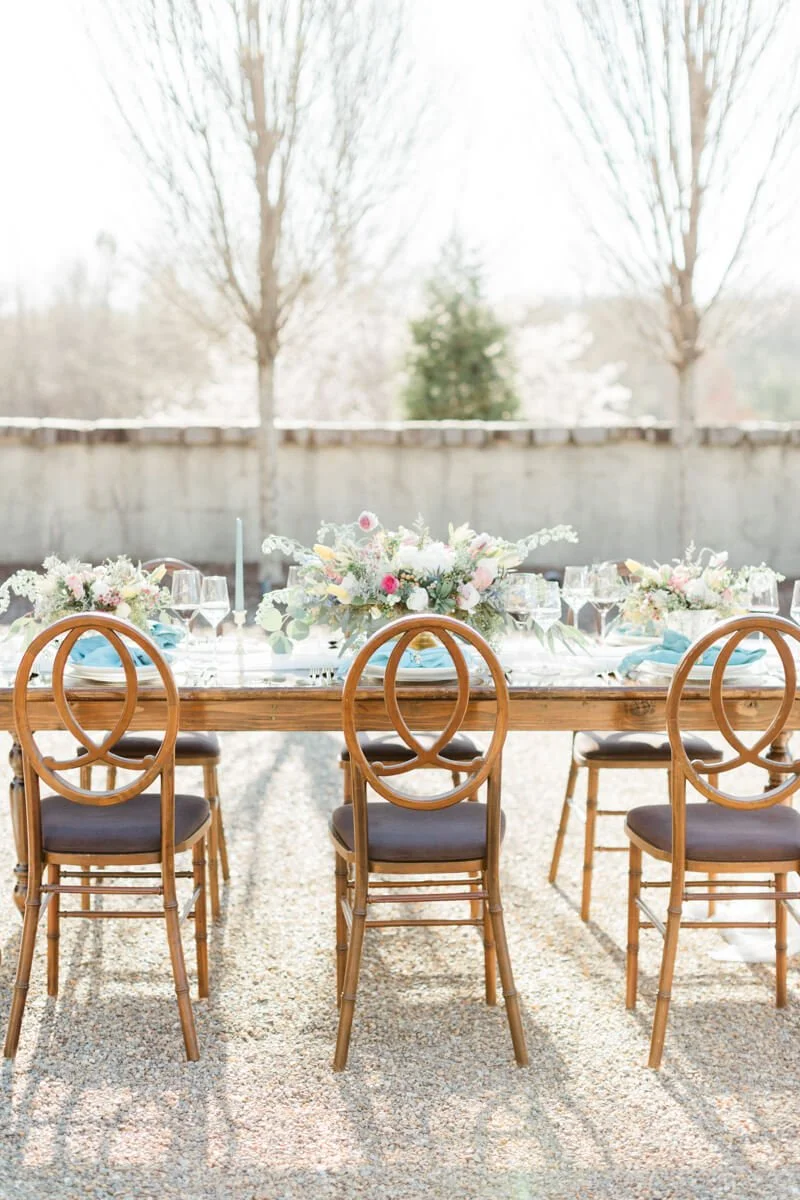 Our bride’s hair and makeup was the impeccable work of Cindy Mcgrath Makeup. The makeup was kept simple which allowed for our bride’s gorgeous features to be displayed.The hair was a loosely swept back and twisted hairstyle that matched the laid back nature of our bride. To continue the minimalistic look, the Iva Crepe Maxi dress by Jill Jill Stuart was the perfect choice for our bride. While understated, it’s simple and minimalistic design didn’t need to compete with the backdrop or florals. It made its own statement without trying too hard. To finish off the look, The Chloe heel from Bella Belle’s bridal collection featured beautiful embroidered and beaded florals. The blue, pink, and peach floral designs looked as if it were made for this occasion. Plus, they offered that romantic and fine art detail that our bride appreciates.