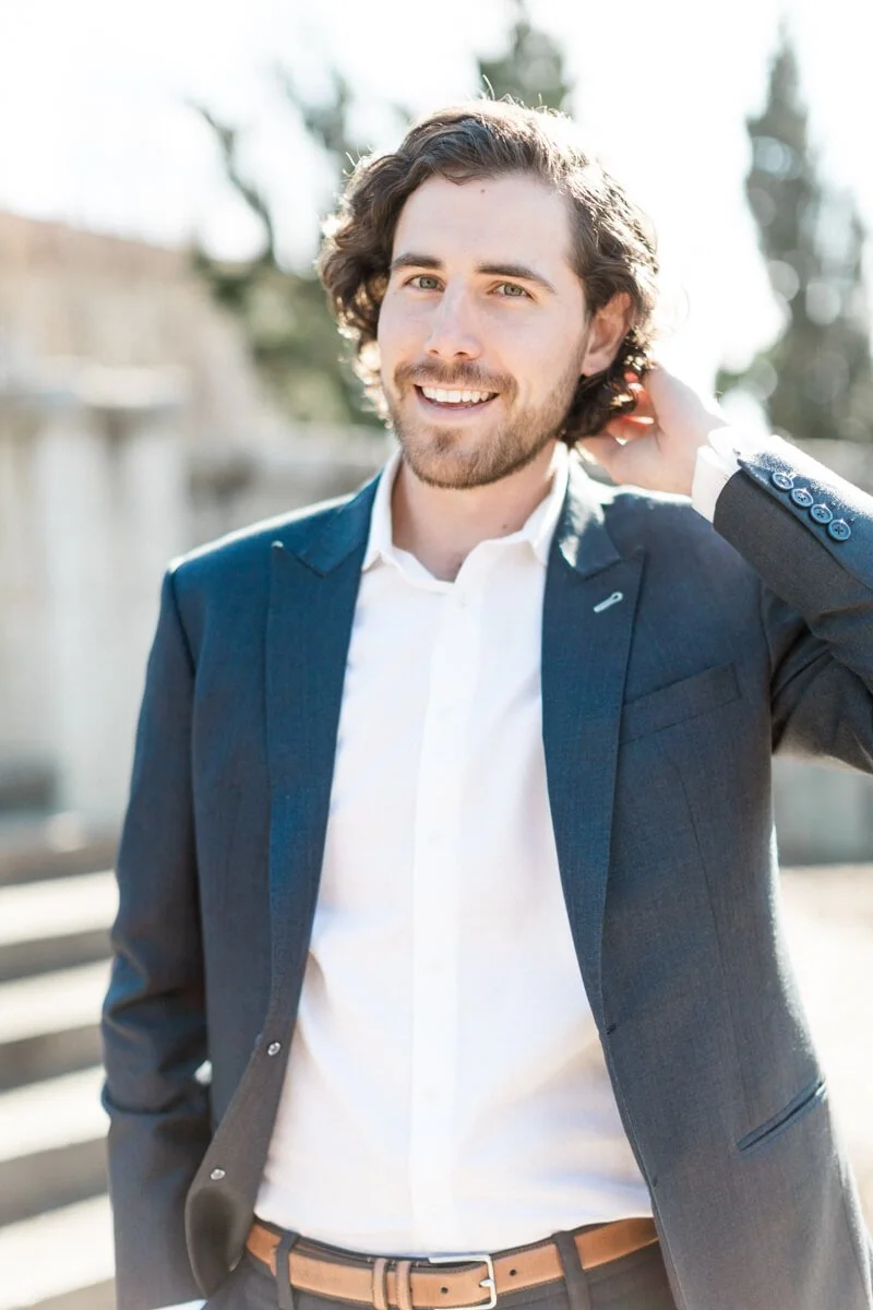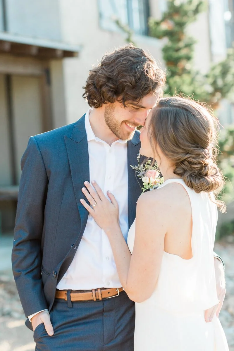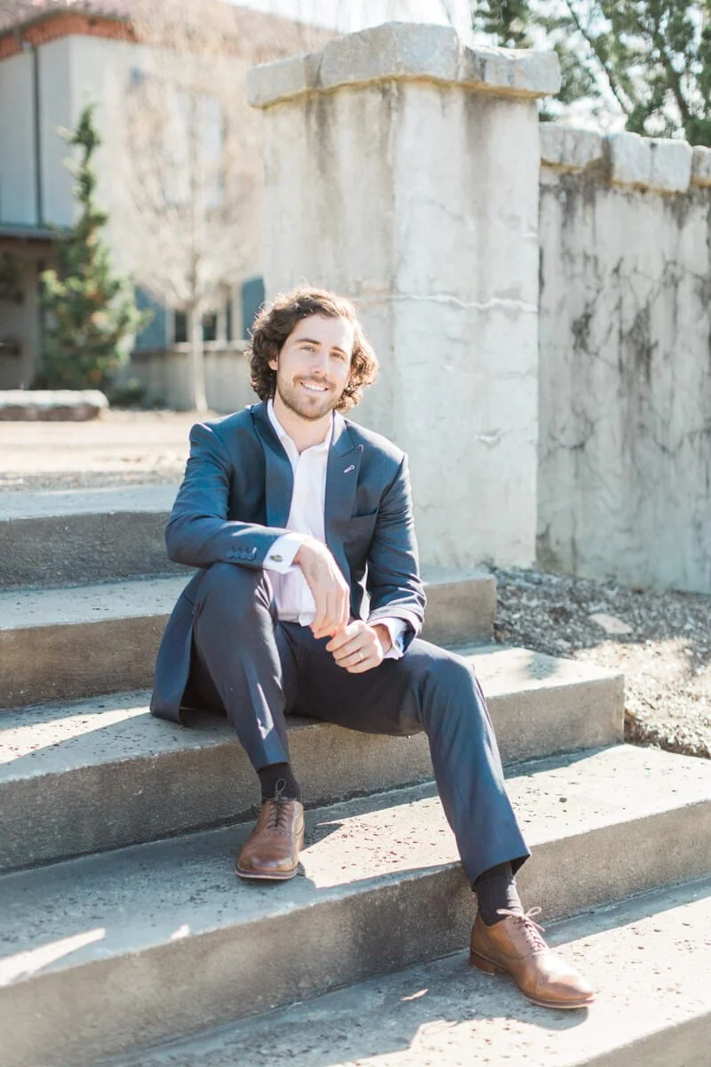 The groom’s look was very much in the same vein as our bride’s. We felt that his curly locks were perfectly tousled! We loved the idea of a relaxed groom’s look featuring a custom navy suit and a simple white collared shirt. We felt that it encapsulated who our couple was at their core: Classy people who don’t take themselves too seriously.