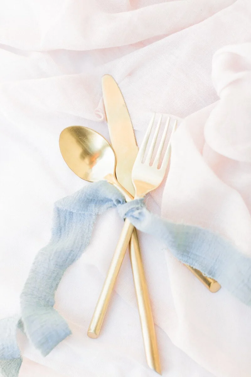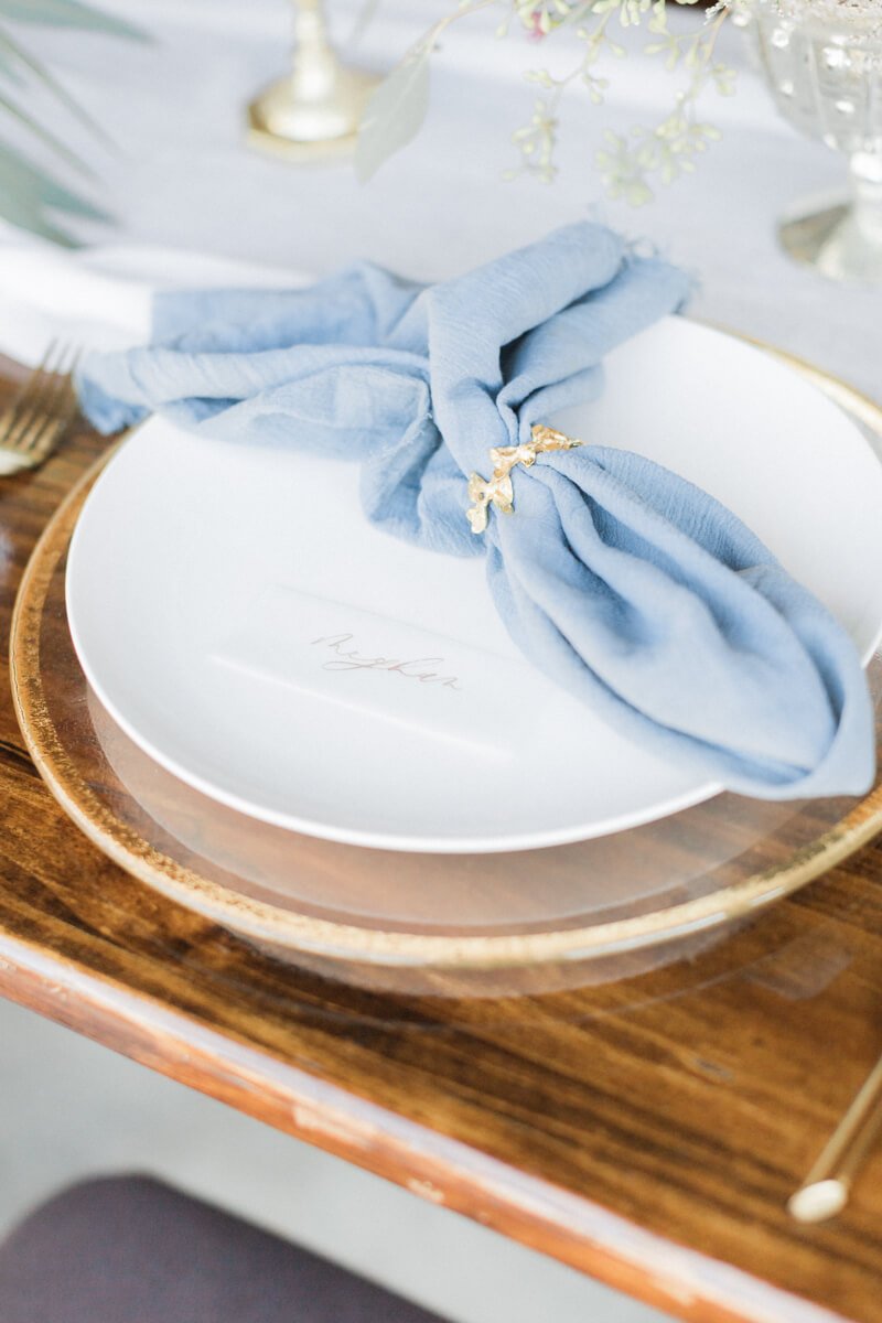 Our couple would have their most dear friends and family at their wedding, so a table set for six overlooking the mountains would be the perfect way to celebrate together. The table settings were chosen to embody the simple versus complex contrast. Each setting had a gold rimmed glass charger, paired with a simple white modern dinner plate. We chose hand dyed blue napkins, with the most beautiful gold leaf napkin holders to drape across the white plate. Finally, modern wine glasses and gold flatware finished the table settings beautifully. A simple white cheesecloth runner was placed under three gorgeously colorful table arrangements.