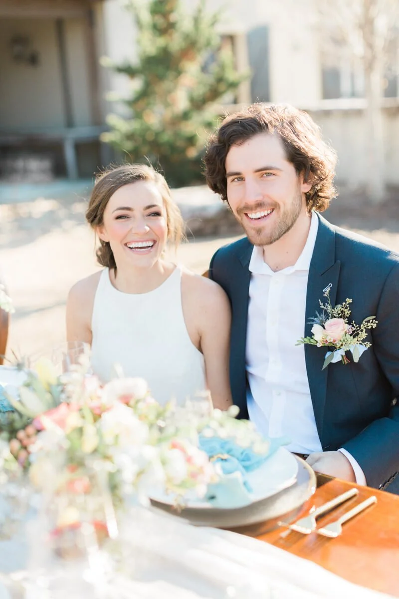 Our Florist, Anastasia with Your Special Day, had the task of pairing brilliantly colored florals to complement the simplistic nature of the venue. The florals were a mixture of white, pink, peach, hints of blue, and of course a lot of greenery. Along with a beautiful bouquet and table arrangements, we had an Asymmetric floral arch filled with lush white floral with pops of color.