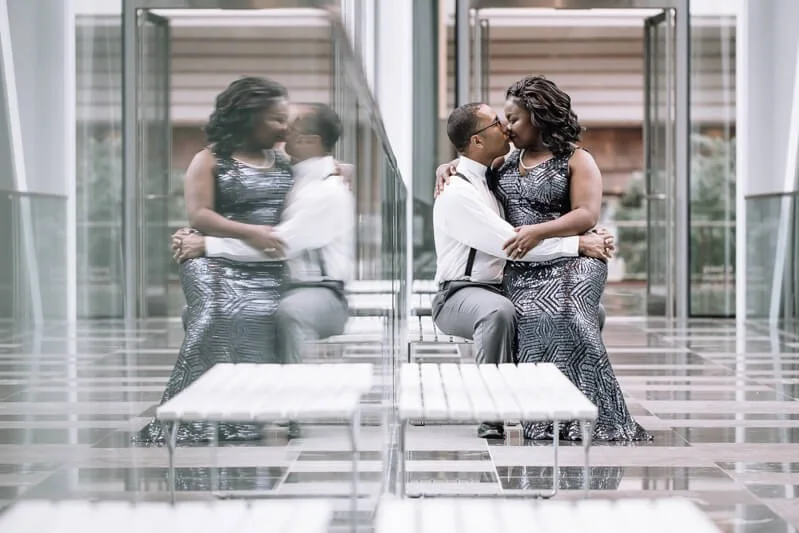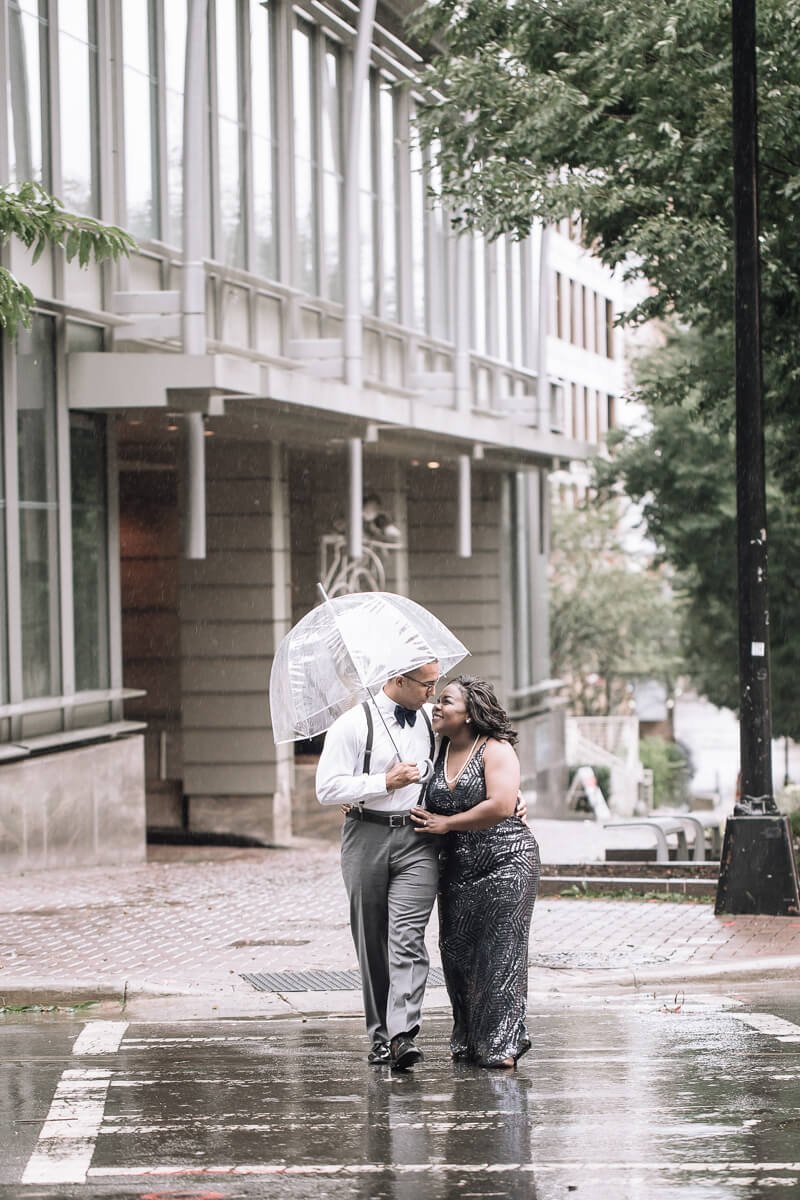 We braved Hurricane Florence's winds and rains in Charlotte to go through with this engagement session since Mimi and Brandon both serve our communities and countries for work and wouldn't be able to reschedule. So we decided to go through with our scheduled session but had no real location set. We managed to get permission to shoot inside The Omni Hotel, where they have their honeymoon suite booked. They arrived in elegant attire, a dark blue sequined dress, he in a suit with suspenders and a blue velvet bowtie.