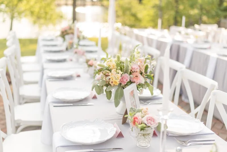 Wedding Colors: Pastels. Light blue, light pink, light peach, white, gray linens