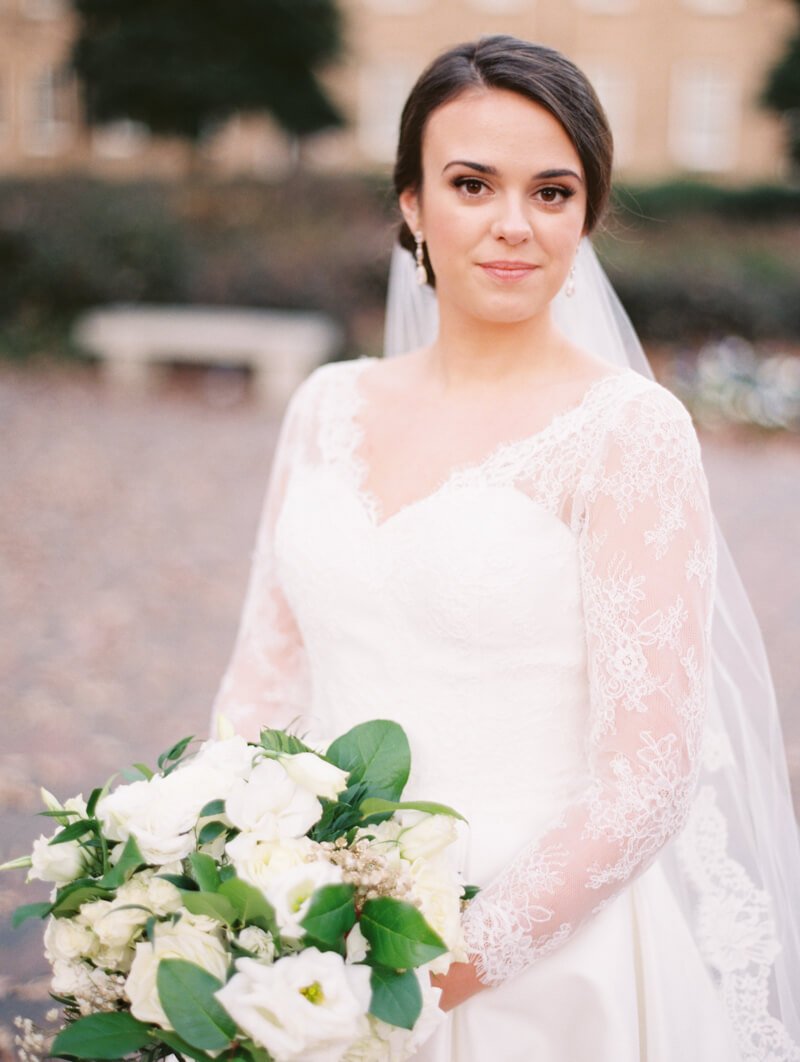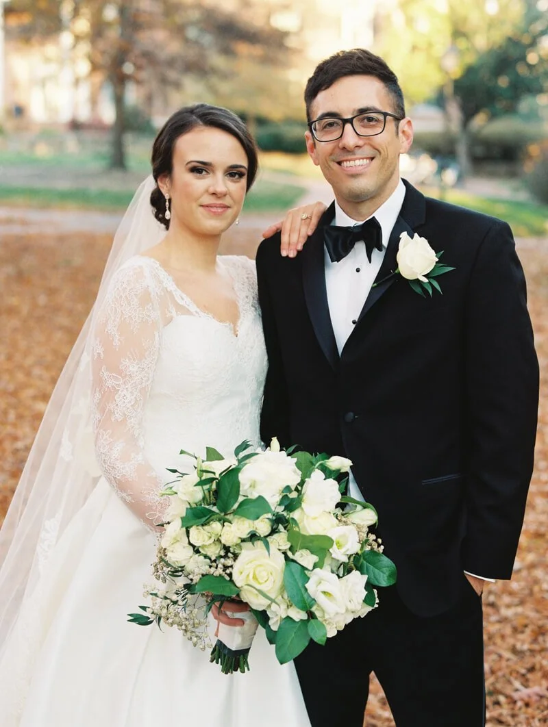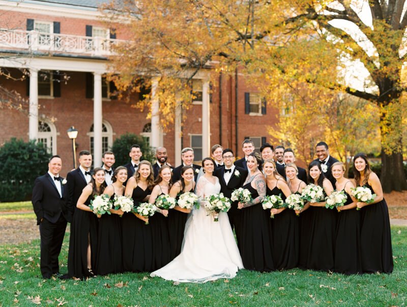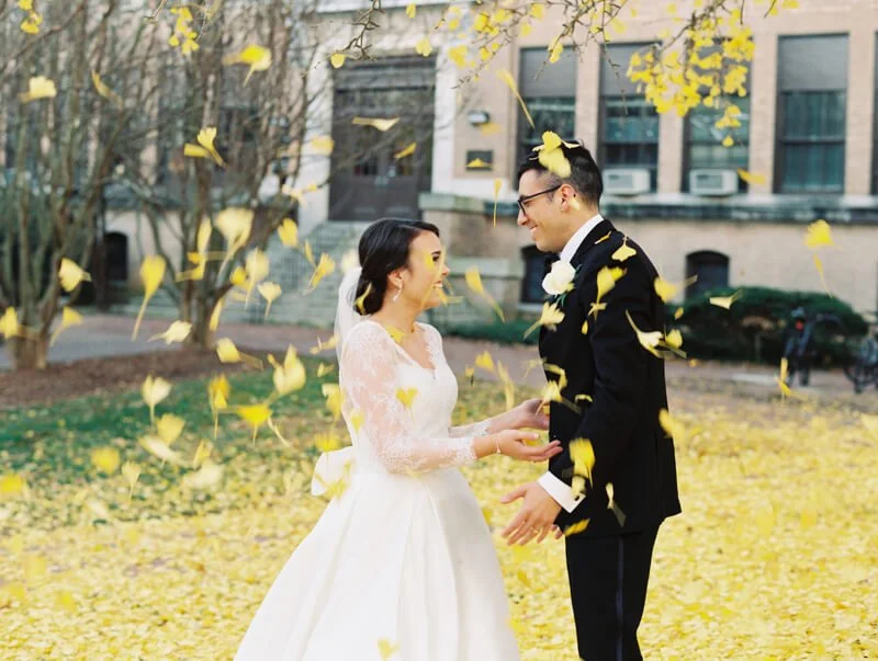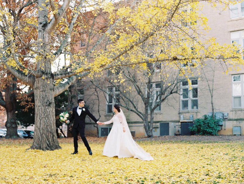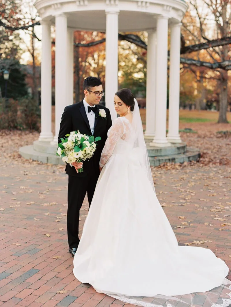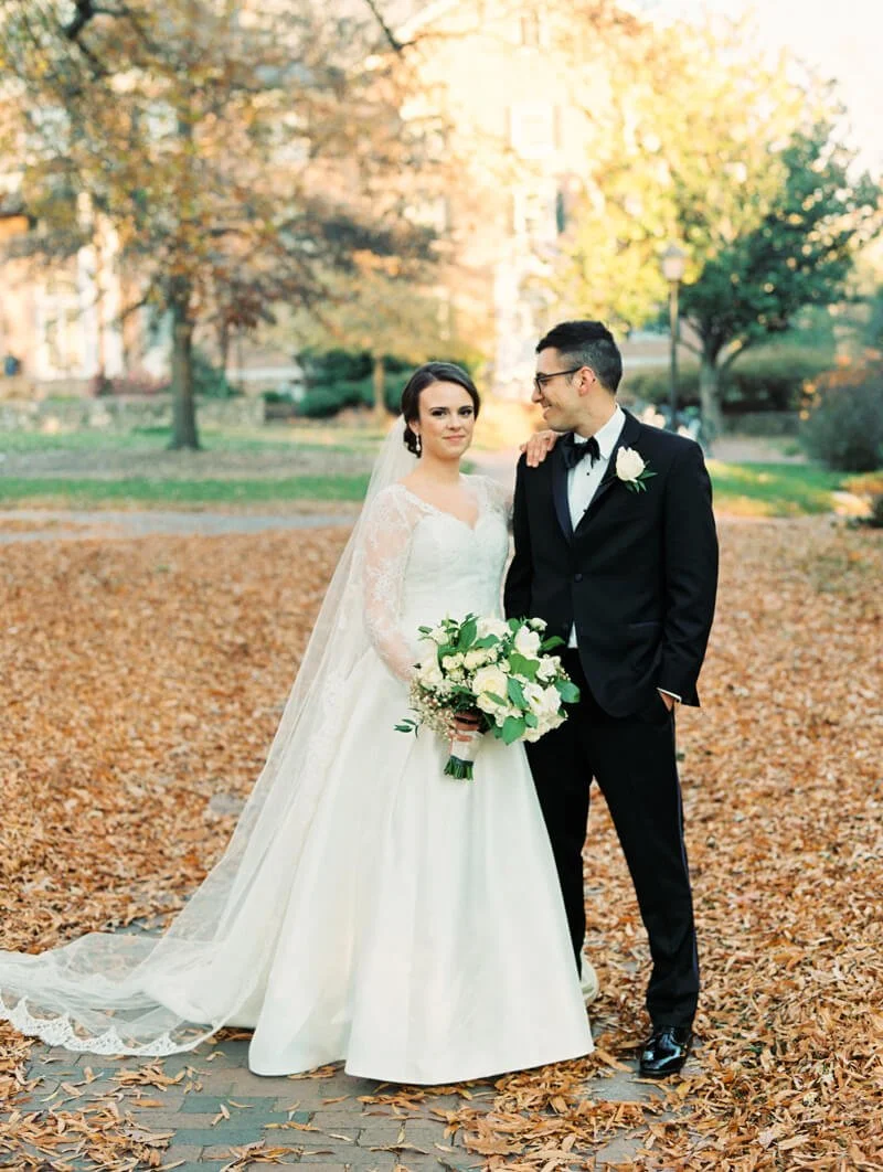 Alex and Chris met at a University of North Carolina football game. They tied the knot in Chapel Hill three years to the day after their very first date. Photographer Virgil Bunao captured the wedding party amidst beautiful golden leaves on UNC's campus, setting the tone for a perfect big day.