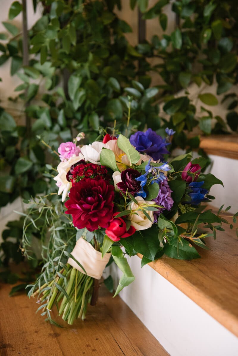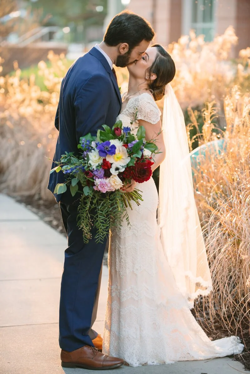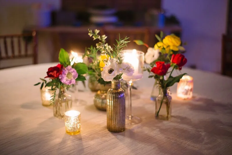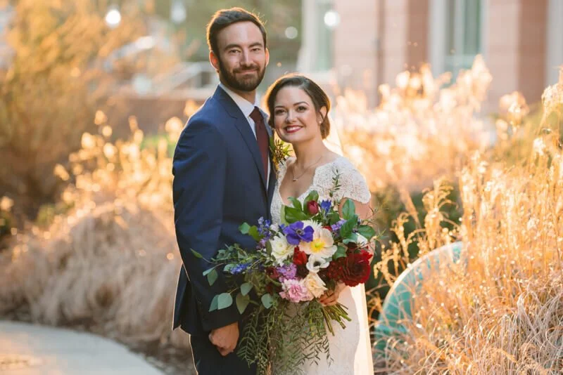 Inside the dining area were tablescapes featuring vibrant floral sprays, almost like a bouquet of wildflowers on each table. The array of colors was tempered with the romantic touch of numerous votives and candles. The restaurant provided delectable fare, and then the party went into full swing! Those wanting a break from the action were treated to the courtyard lit by cafe lights, offering a soft glow in the fading winter sun. When it was time to call it a night, the newlyweds found themselves walking beneath a shower of petals, ready to begin their next adventure.