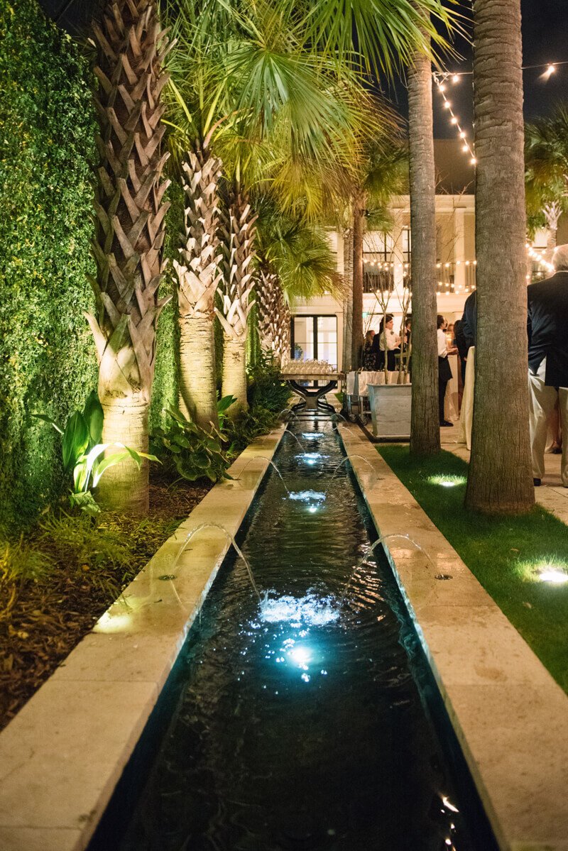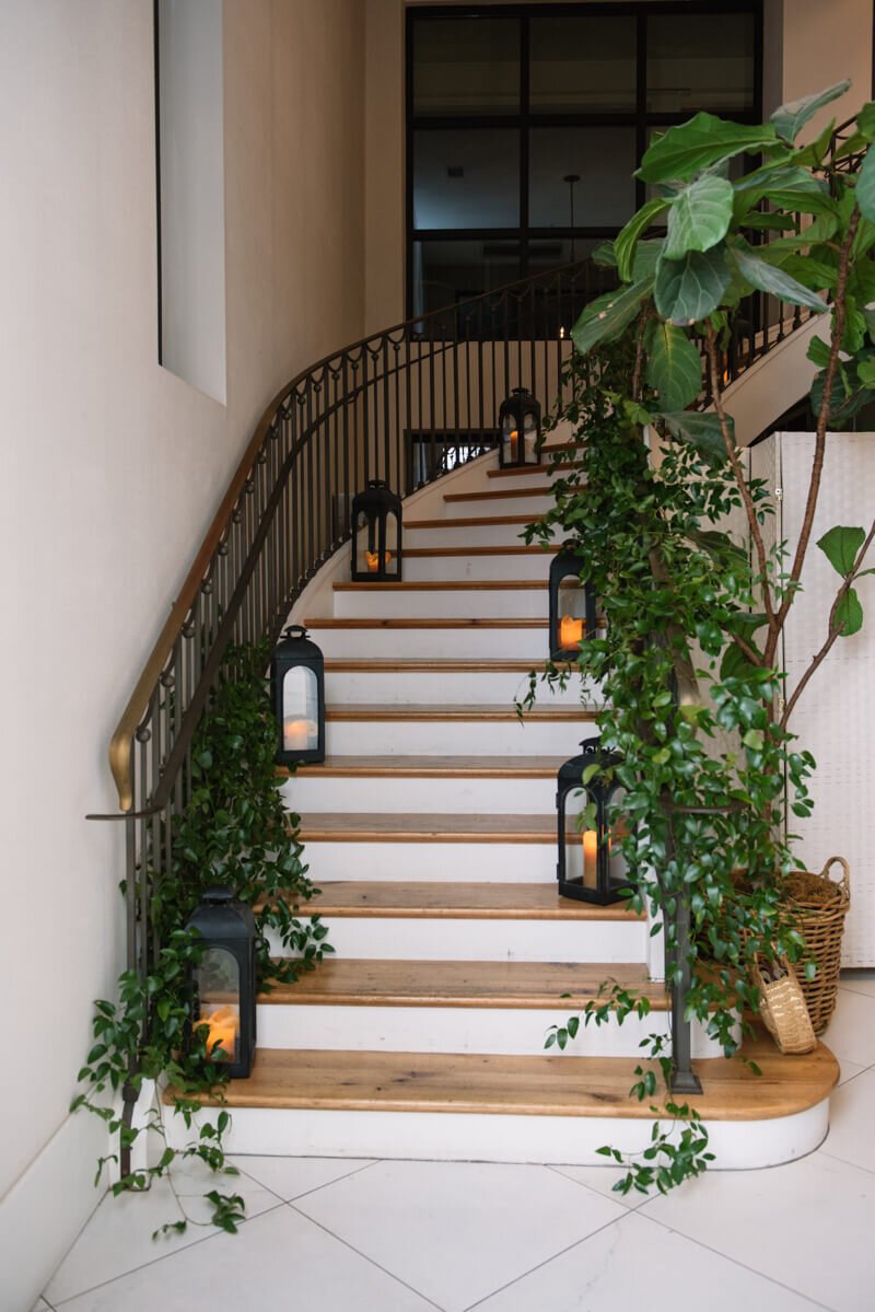 Cannon Green’s courtyard is dotted with palm trees and is perfect for intimate receptions. The restaurant’s gorgeous flying staircase with wrought iron and polished steps complimented the duo’s classic look perfectly. The hurricane lanterns were an added bonus and brought some additional southern charm to the stairwell portraits.