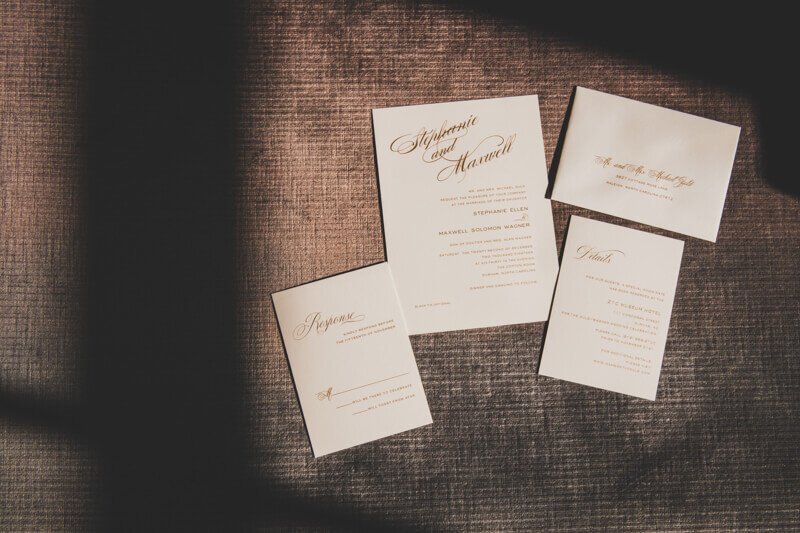 A: The theme for our wedding was “Winter Wonderland.” We wanted to create the warmth and feeling of a magical winter landscape, with a little bit of drama. Since this was a Jewish wedding, we weren’t going for Christmas time! We used soft lighting, ivory draping and key dynamic floral centerpieces to create our look. We focused on using black and white as our colors, and the only other colors we integrated were some deep pink and red tones in my bridal bouquet. My husband Max and I are both Jewish, so we began the evening with a Ketubah signing, which is the traditional marriage ceremony. We all gathered in the bridal suite, and Max said a few words to our family and friends before we each signed the Ketubah with our witnesses. It was truly a magical moment! We got married under a chuppah, and because I’m a modern woman, we both stomped on the glass together! Typically the man does that alone, but I wanted to feel like we were equals at the ceremony.