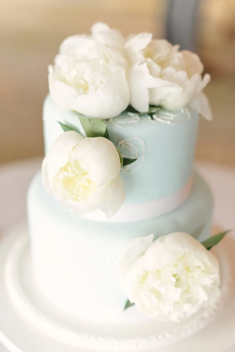 White peonies embellish a petite blue cake covered in fondant with subtle but eye-catching white etching underneath the flowers. The small details are what make the biggest impact.