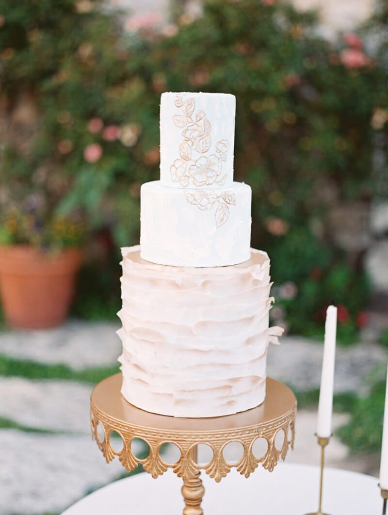 And sometimes the most precise skill is simply executing clean lines. This five-tier creation features immaculate white buttercream with elegant gold swirls solely on one single tier.