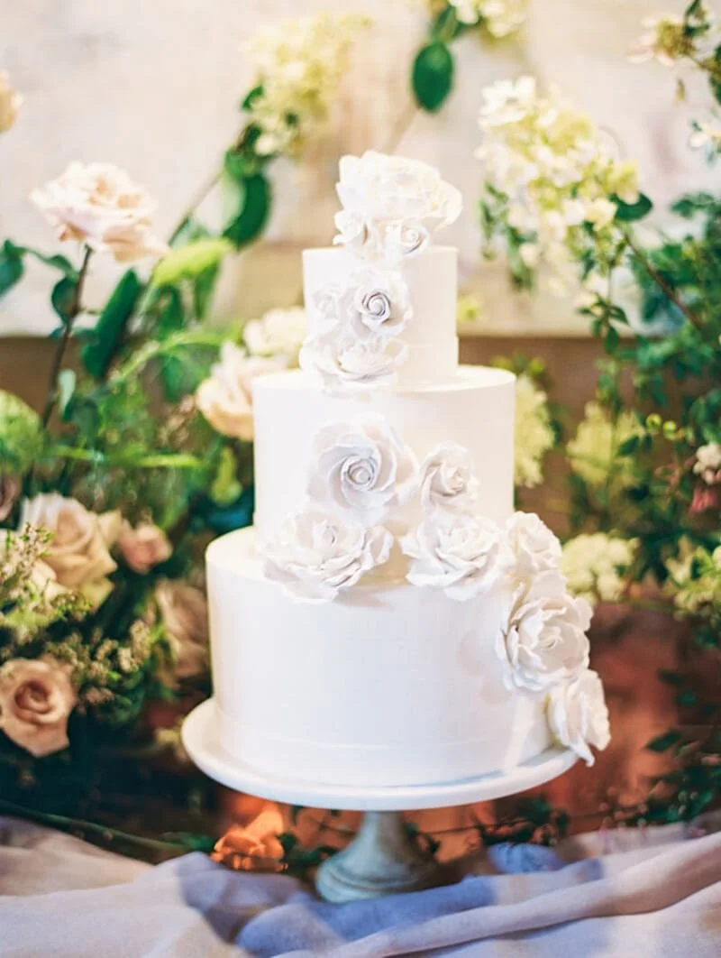 Sugar flowers truly showcase a cake artist’s skills. Perfectly-placed white sugar roses embellish this classic white wedding cake to transform it into a timeless masterpiece.