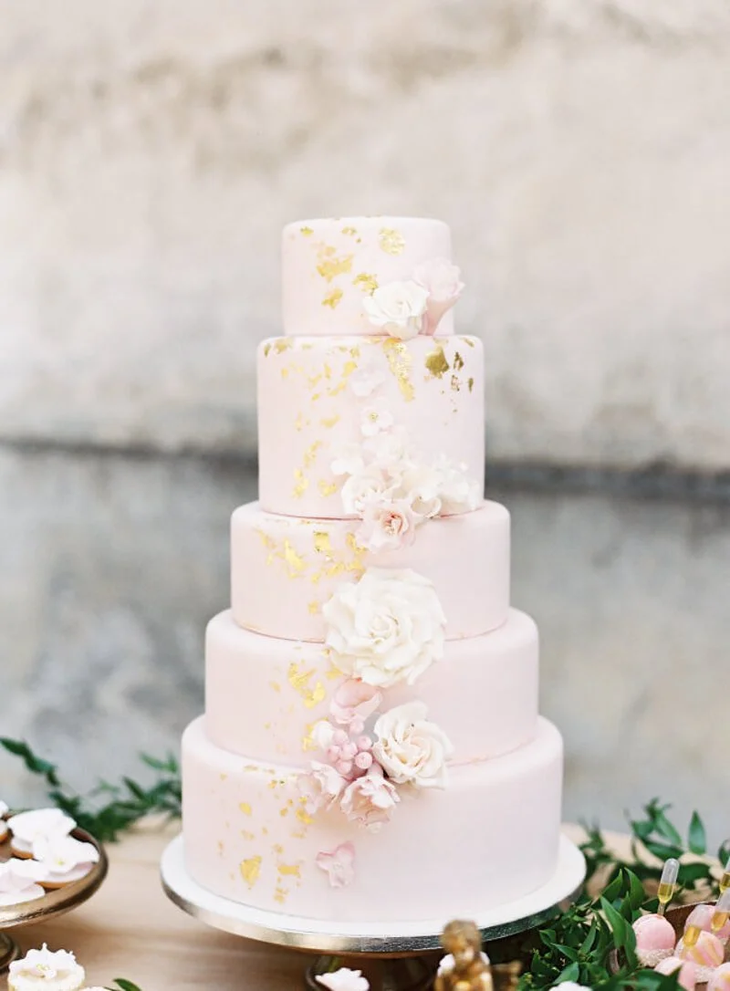 This five-tier fondant-covered creation features blush fondant with white and blush sugar flowers. Beneath the cascade of sugar flowers is a light gold dusting that makes this wedding cake truly shine with contemporary and classic touches.